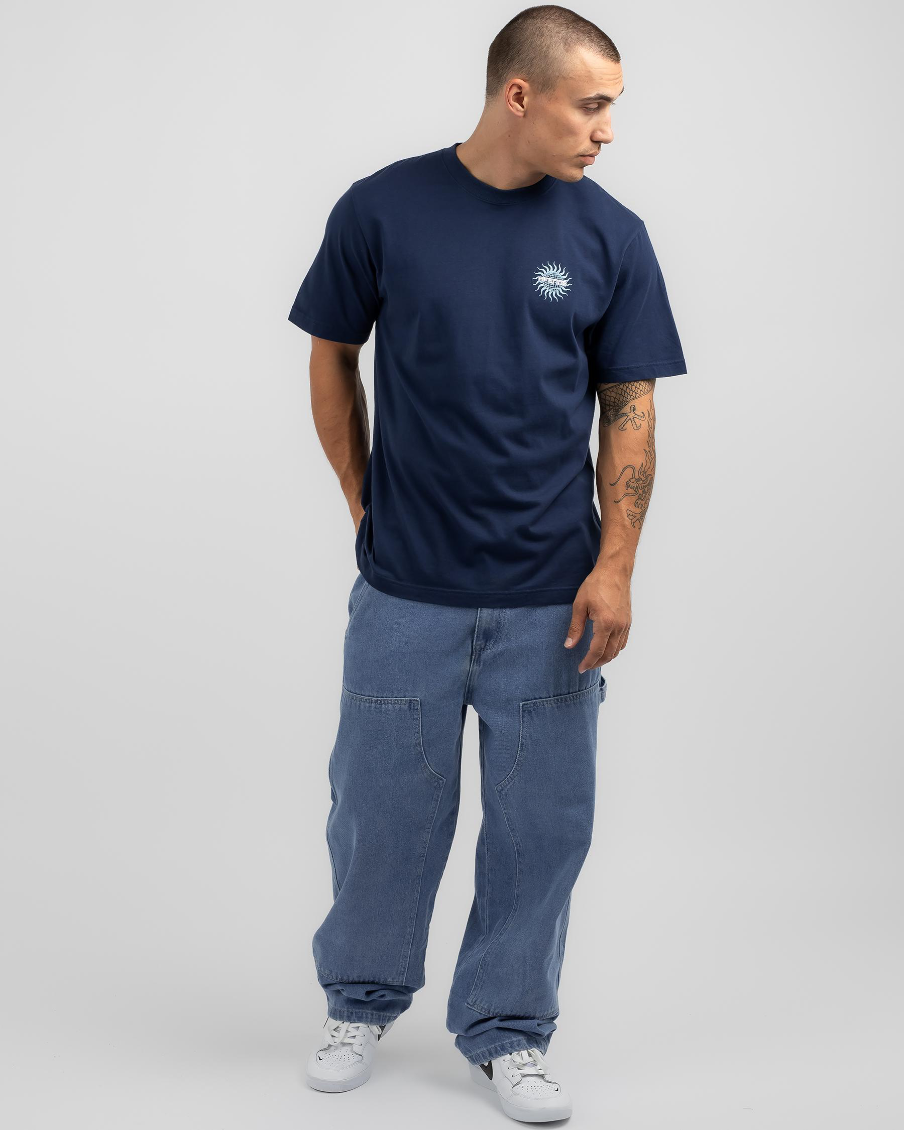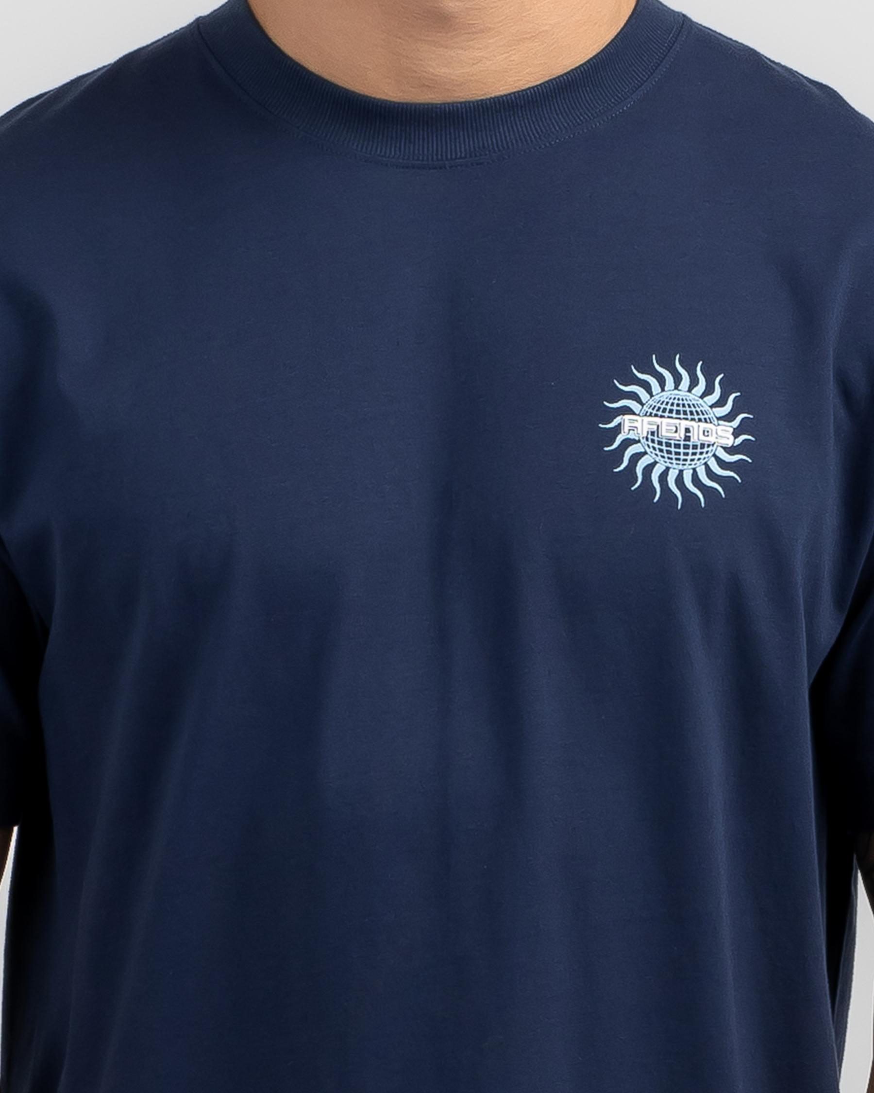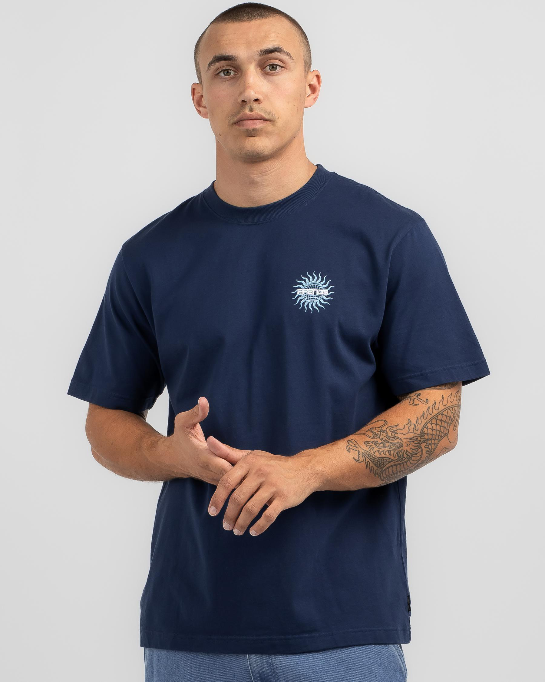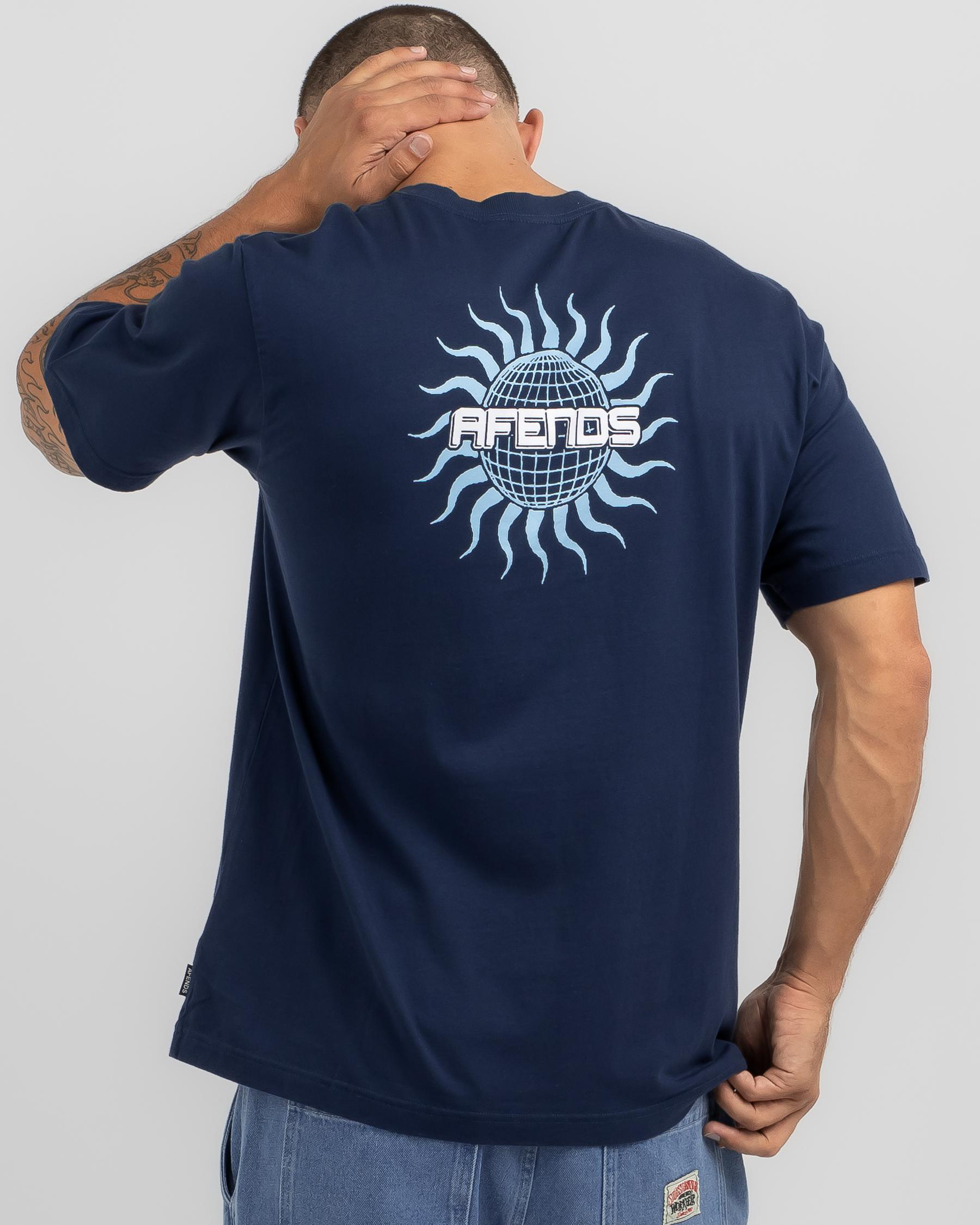 Get your hands on the navy Afends Solar Flare Retro Fit T-shirt for a cool, vintage-inspired look. Comfortable and stylish, perfect for any casual outing.