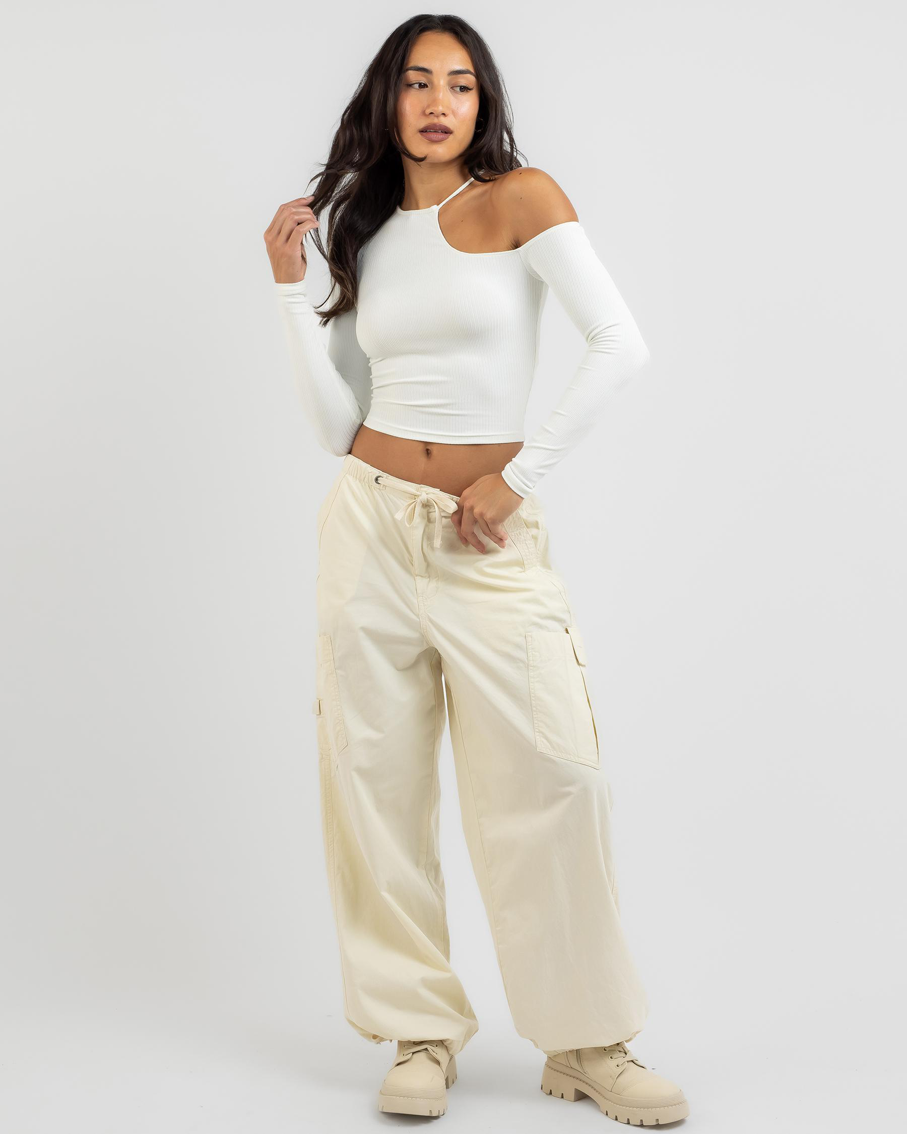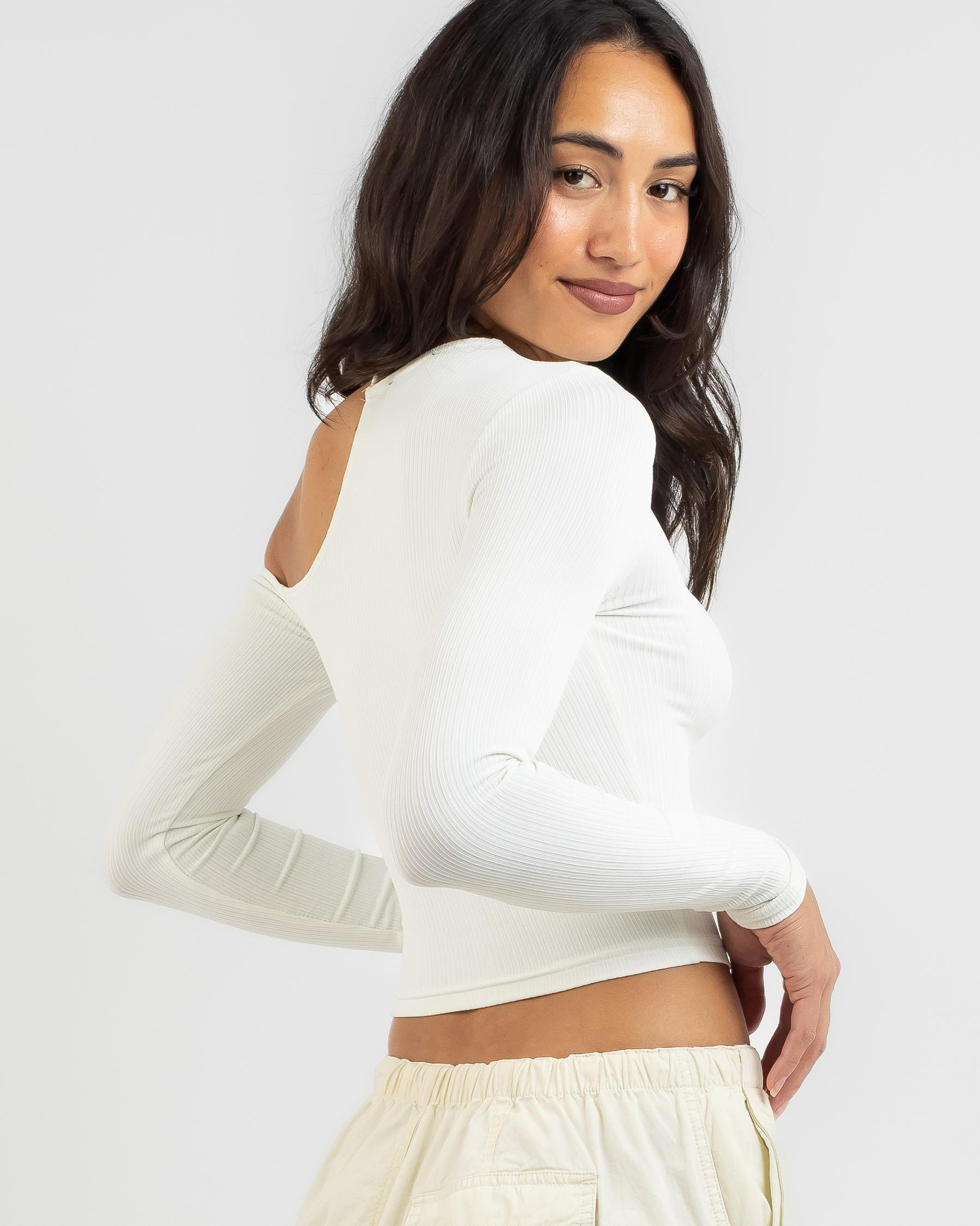 Add a touch of chic to your wardrobe with the Ava And Ever Carmen Cut Out Long Sleeve Top in White. Perfect for any outfit.