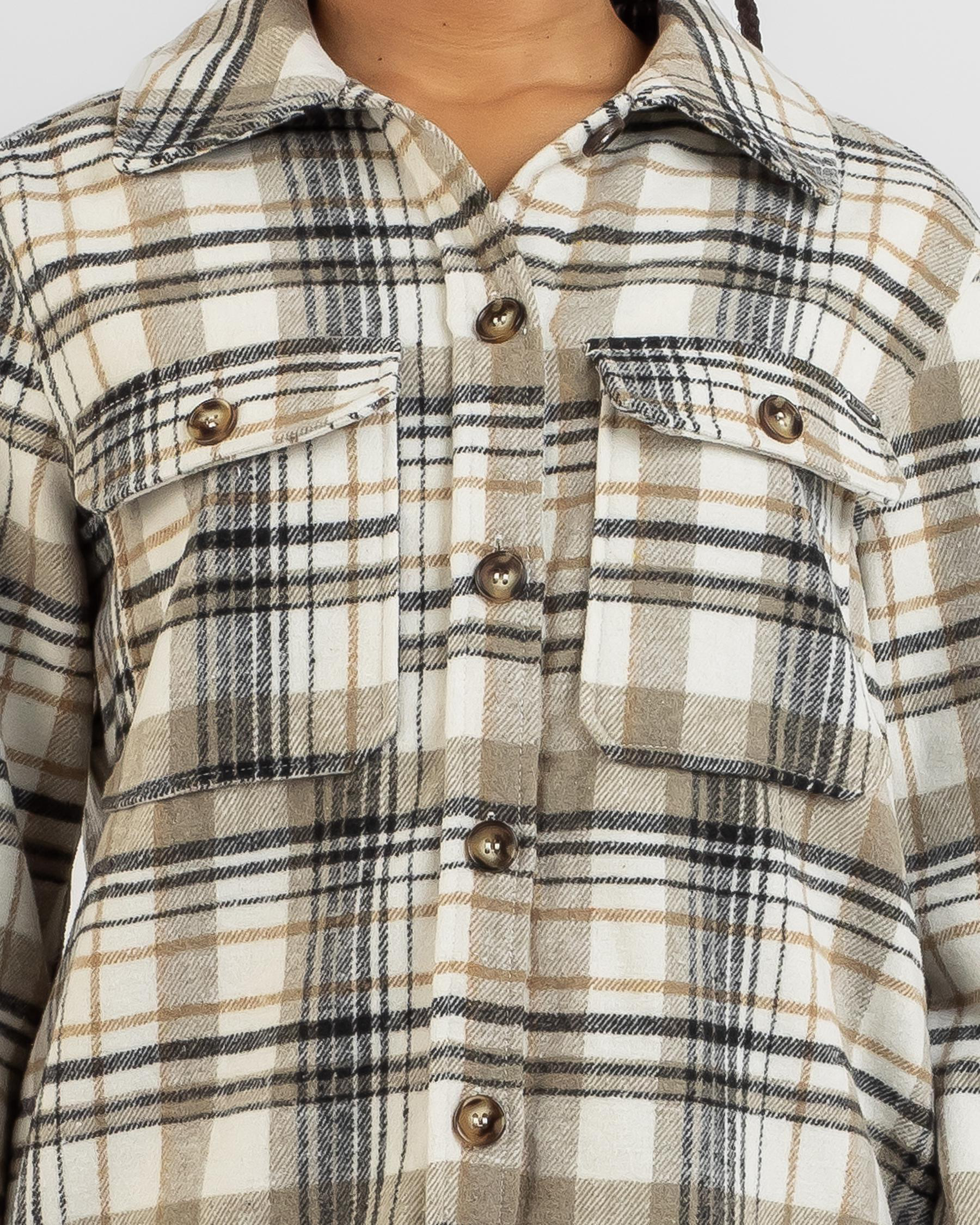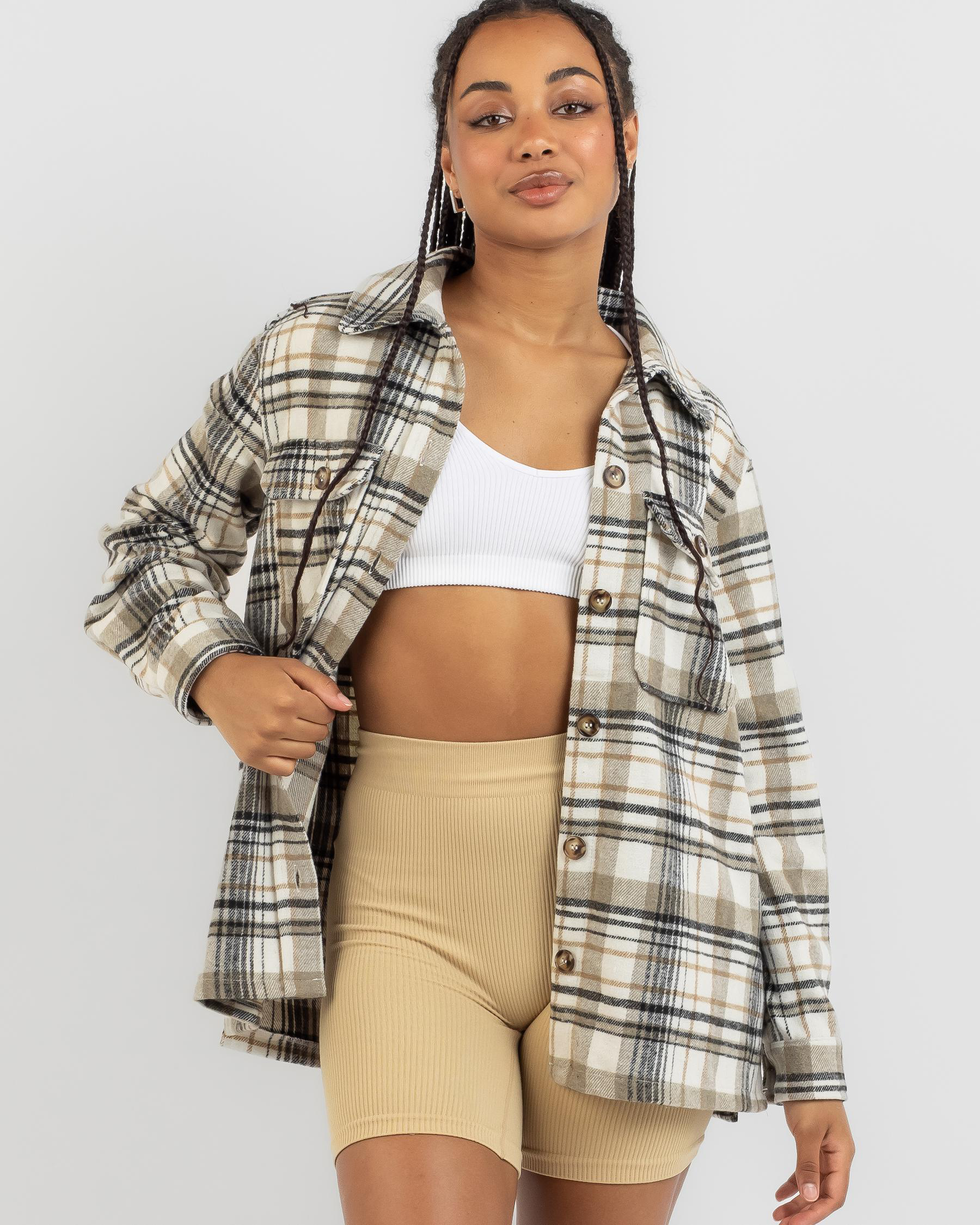 Elevate your street style with the Ava And Ever Ricky Shacket in White. This versatile piece features a black and tan check pattern, perfect for layering in any season.