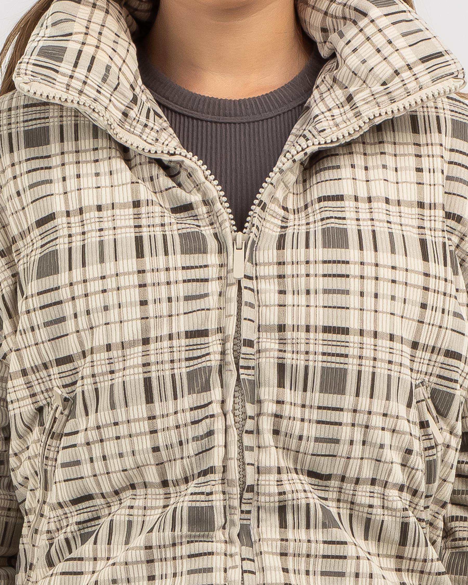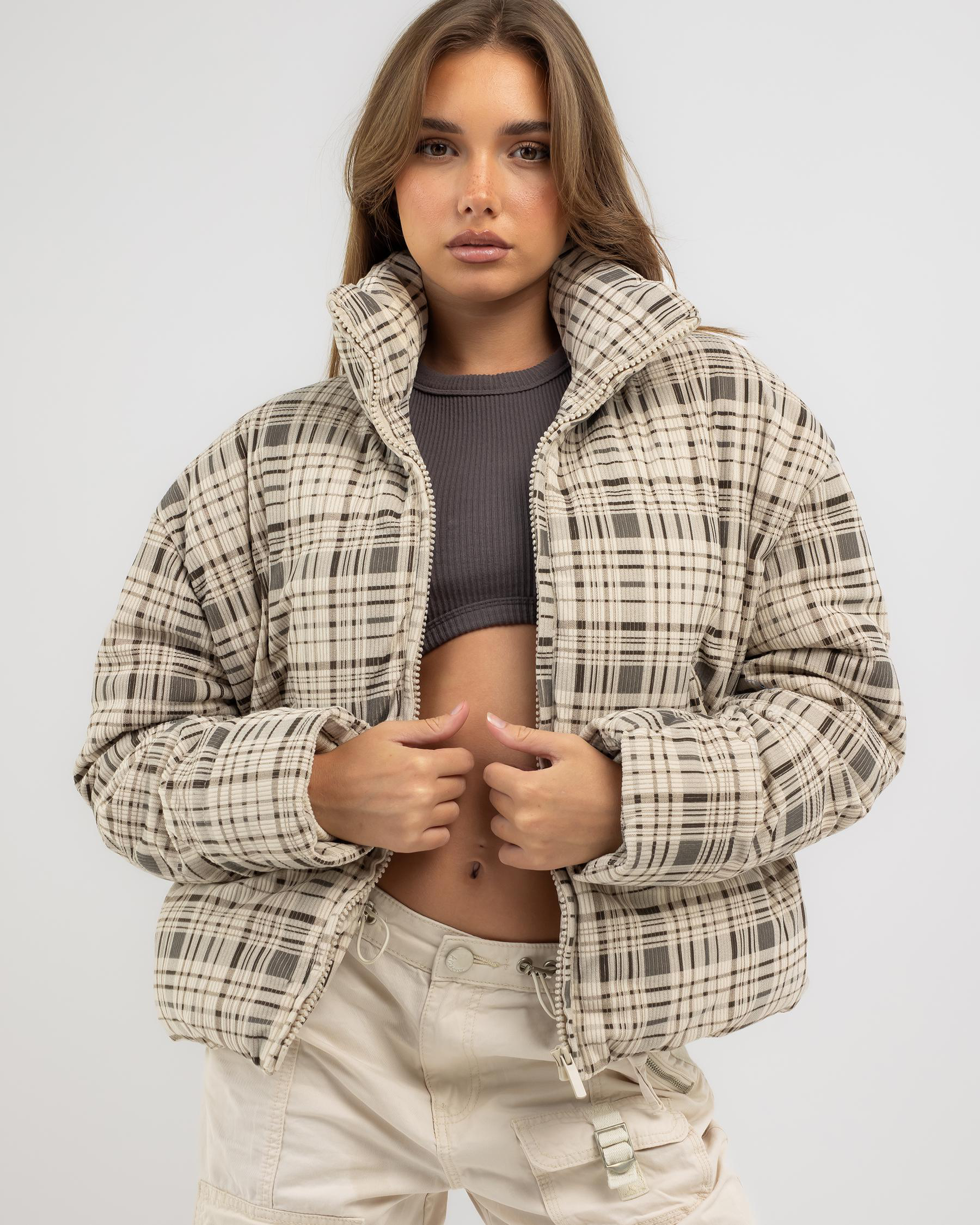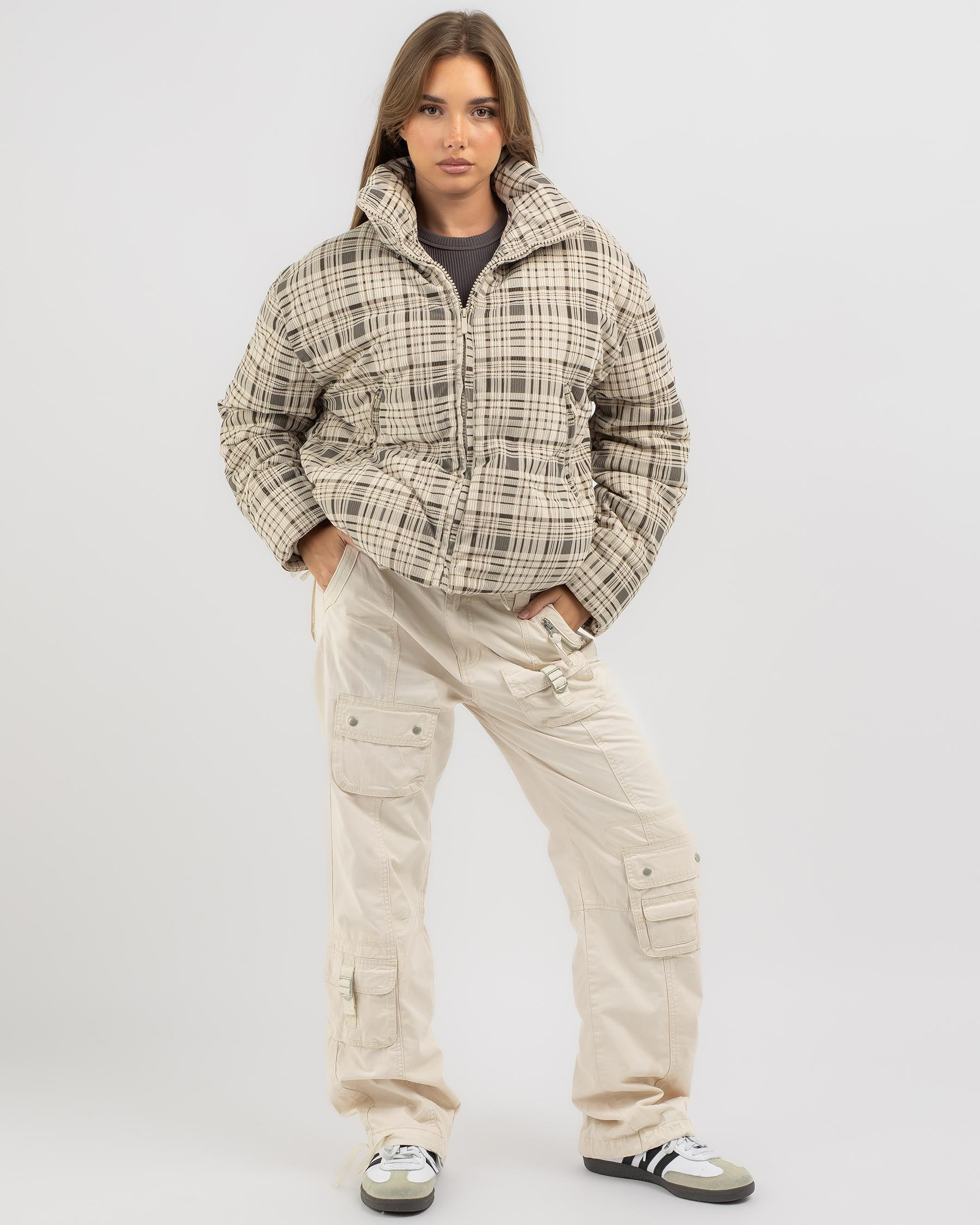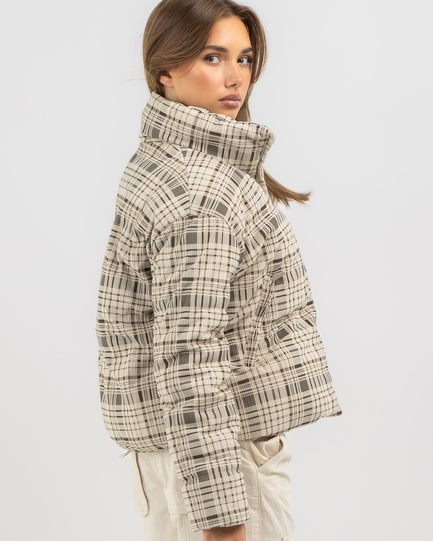 Stay warm and stylish in the Ava And Ever Wayfarer Puffer Jacket in Beige. This jacket features a trendy check pattern and is perfect for chilly days.