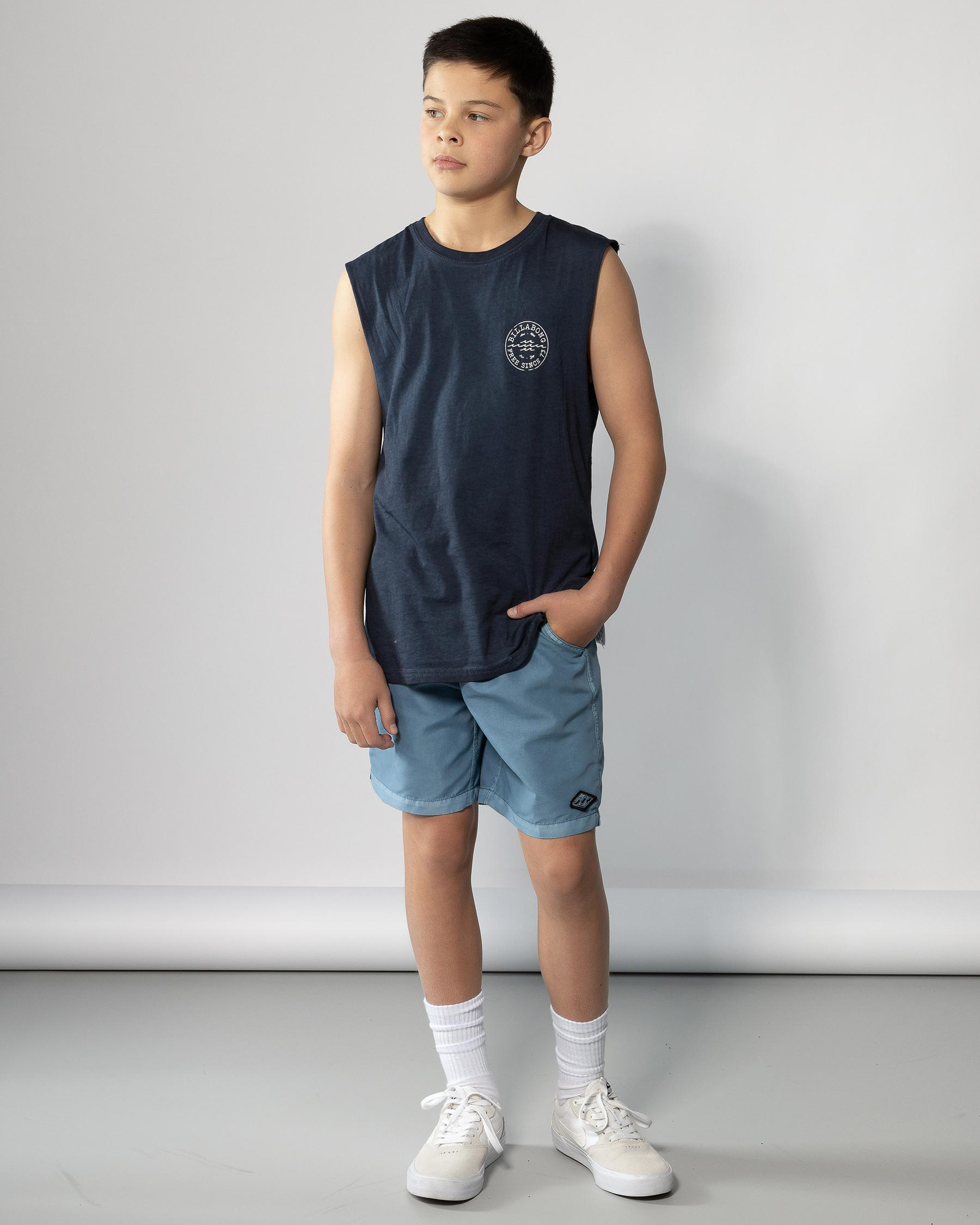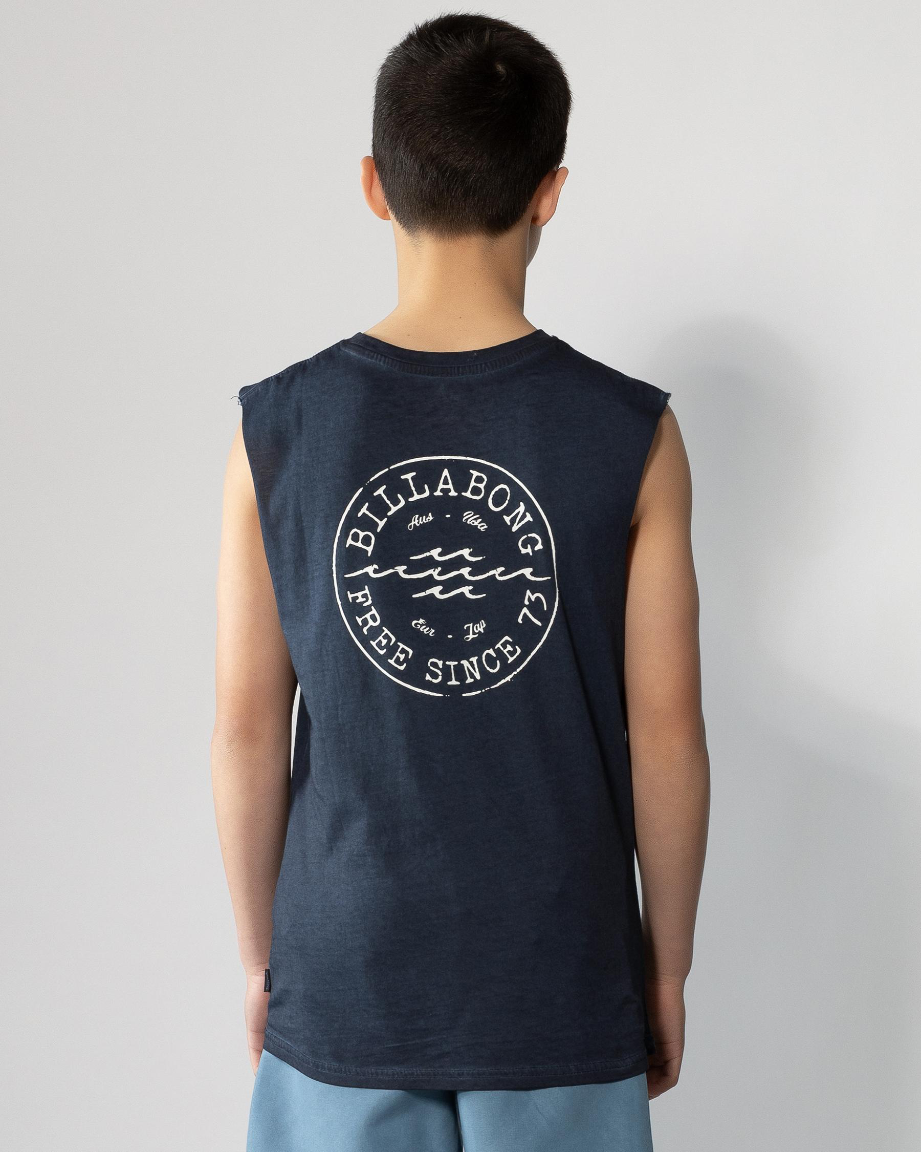Billabong Boys' Big Wave Daz Muscle Tank in Dusty Navy - Perfect for summer adventures. This tank features a cool wave design and comfy fit.