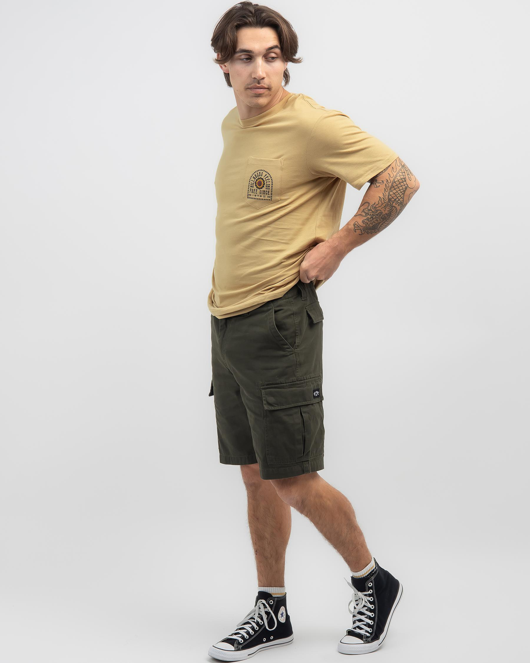 Introducing the Billabong Combat Cargo Shorts in Military Green. Made for style and functionality, these shorts are perfect for any adventure.