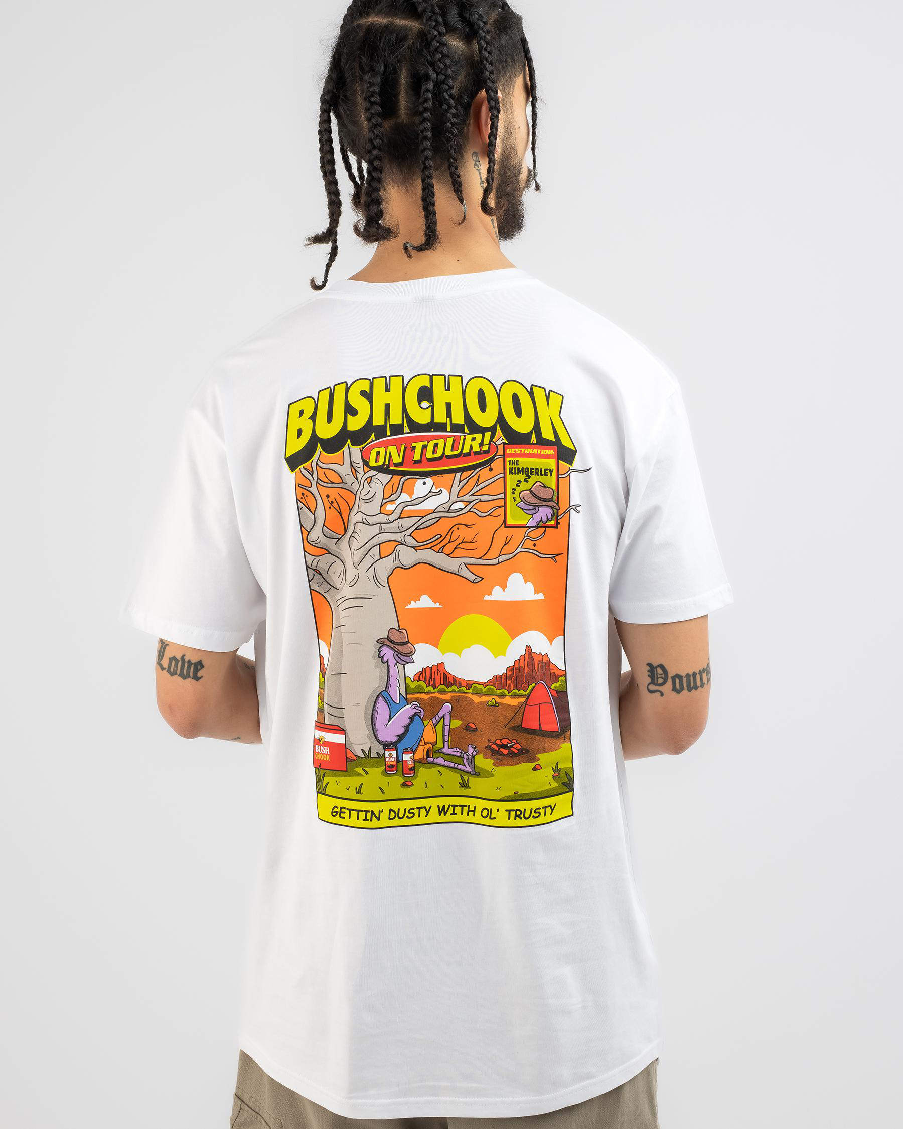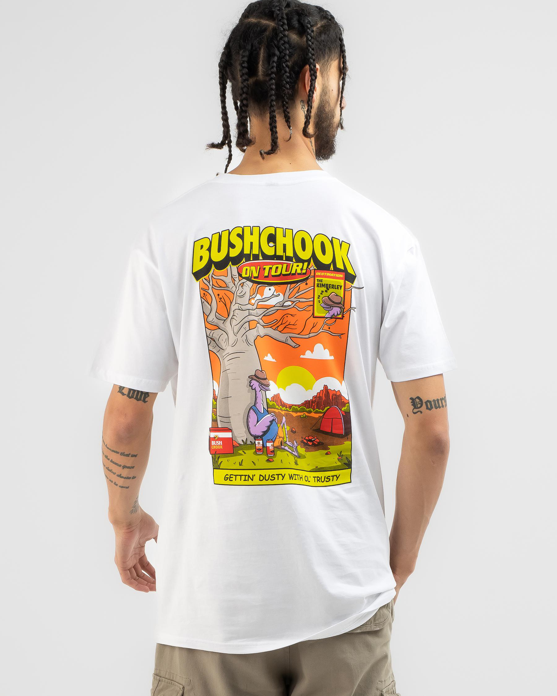 Get your hands on the Bush Chook On Tour Kimberly T-Shirt in White. Perfect for casual days out, this tee offers comfort and style in one.