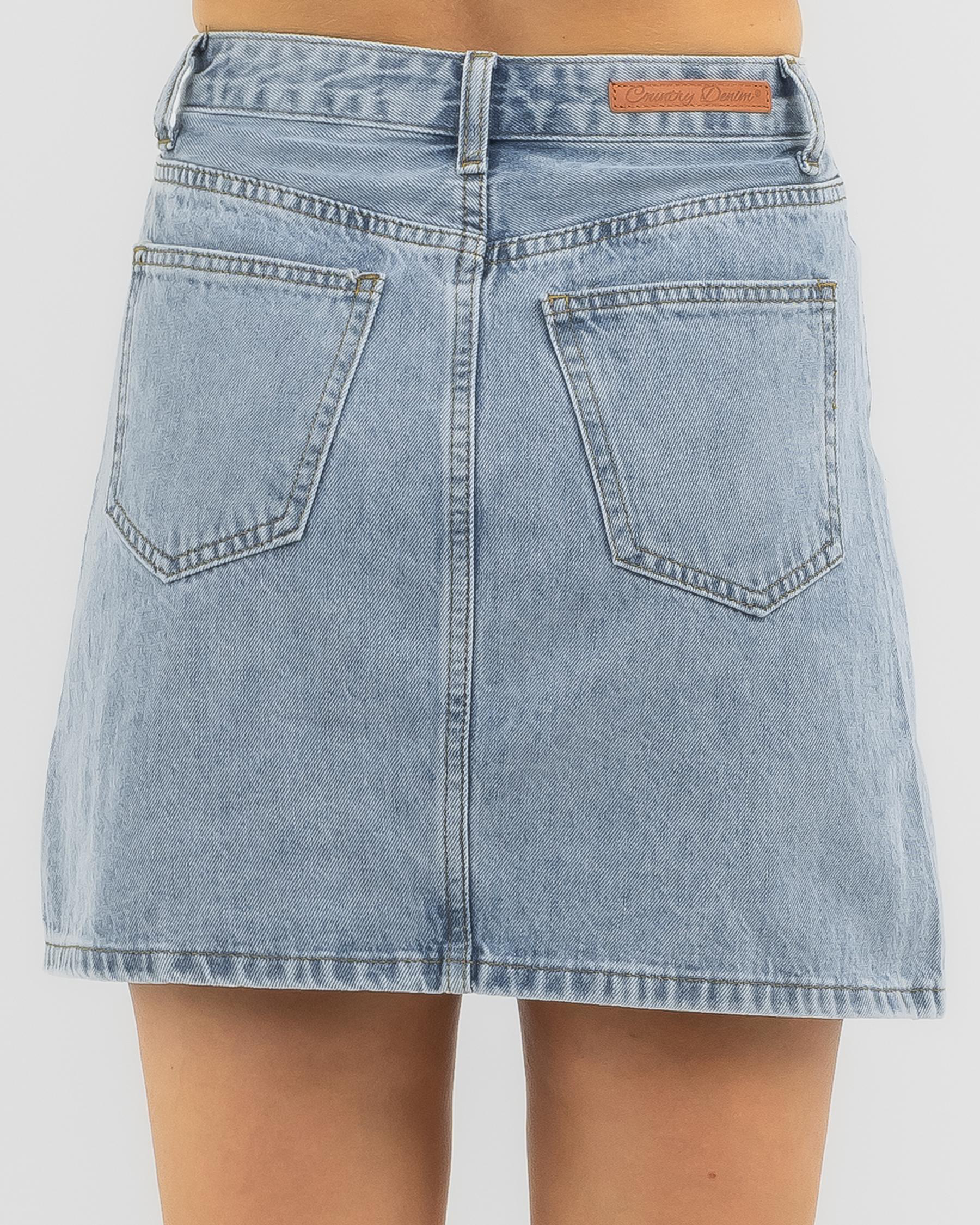 The Country Denim Nellie Denim Skirt in Light Blue is a versatile wardrobe staple, perfect for adding a touch of cool blue to your outfit.