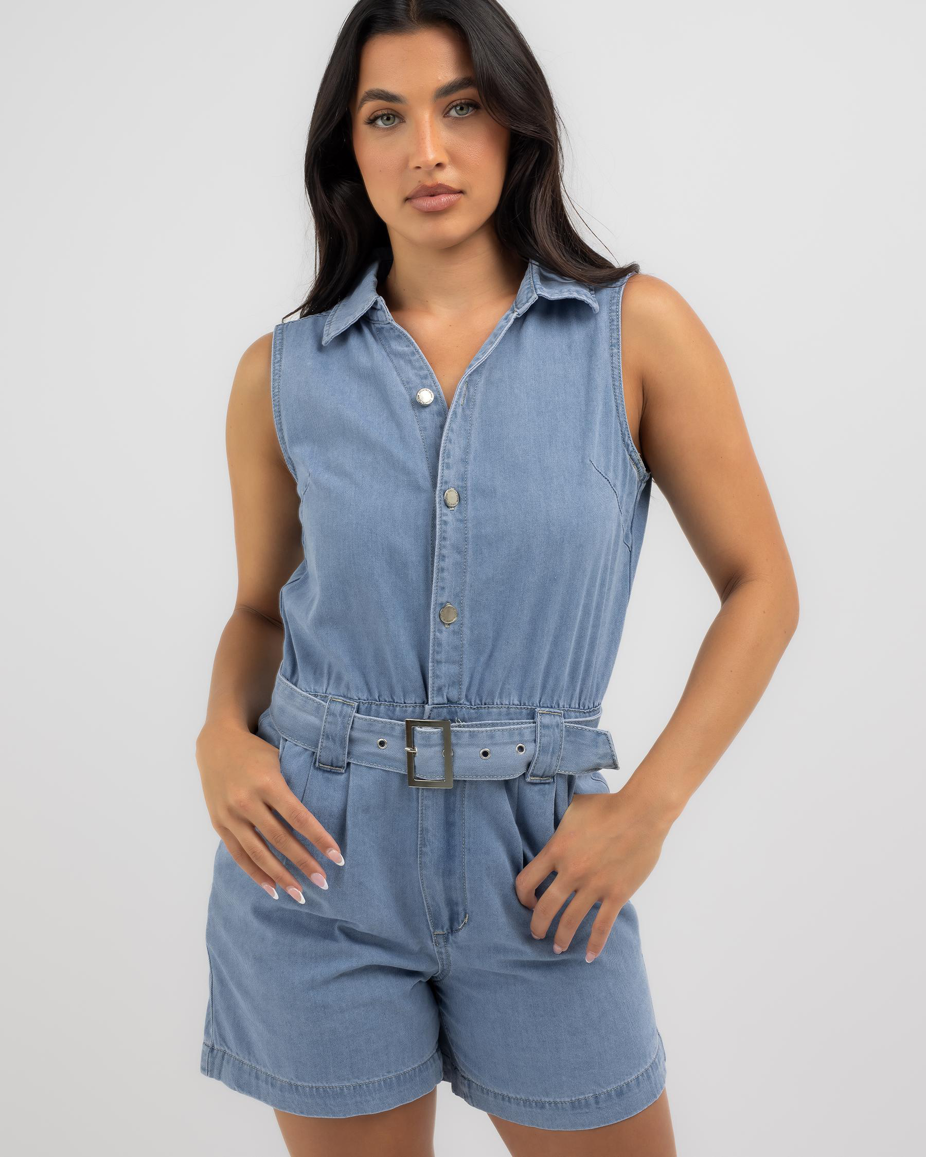 The Country Denim Savannah Playsuit in a charming mid blue hue is perfect for summer adventures and casual styling.