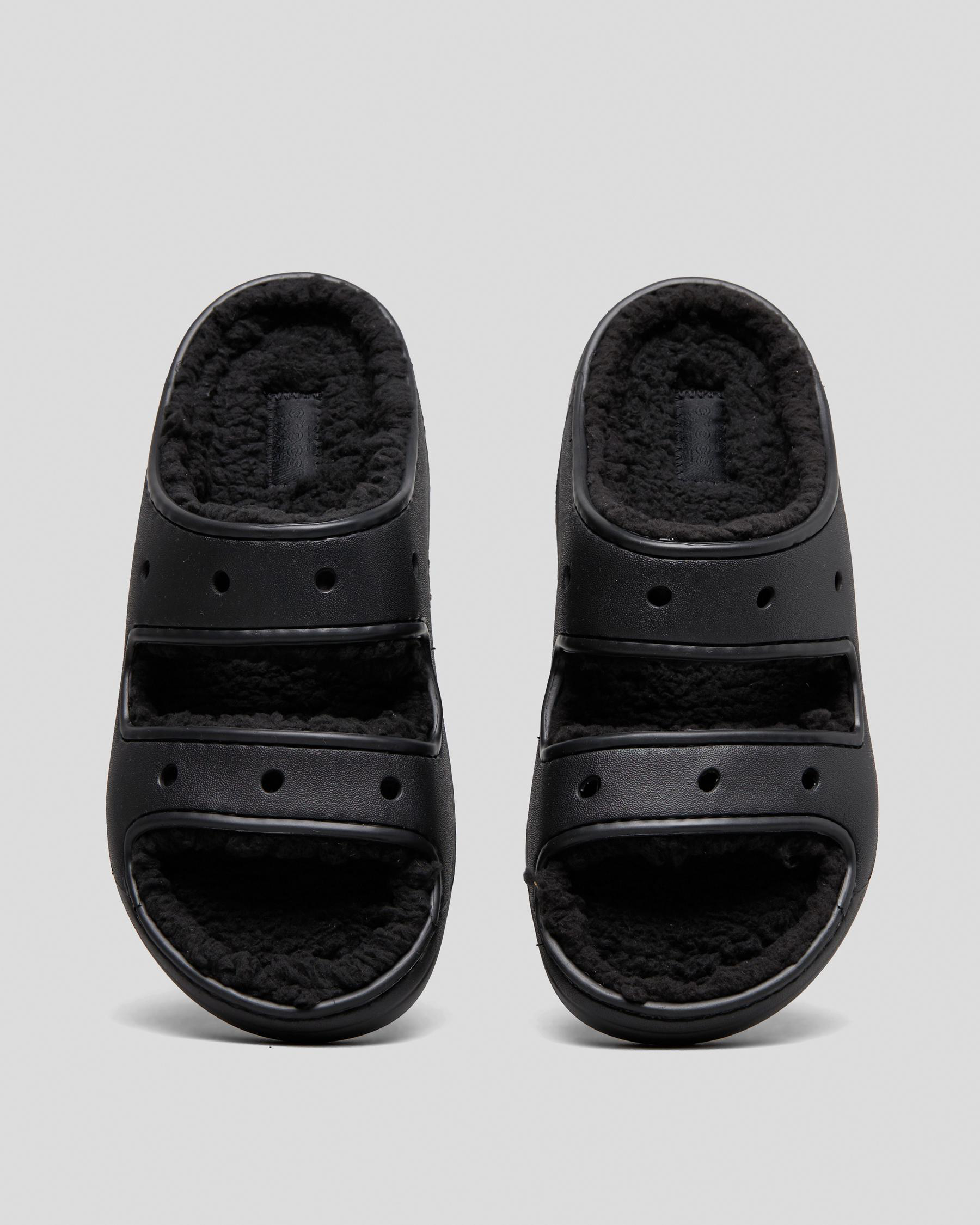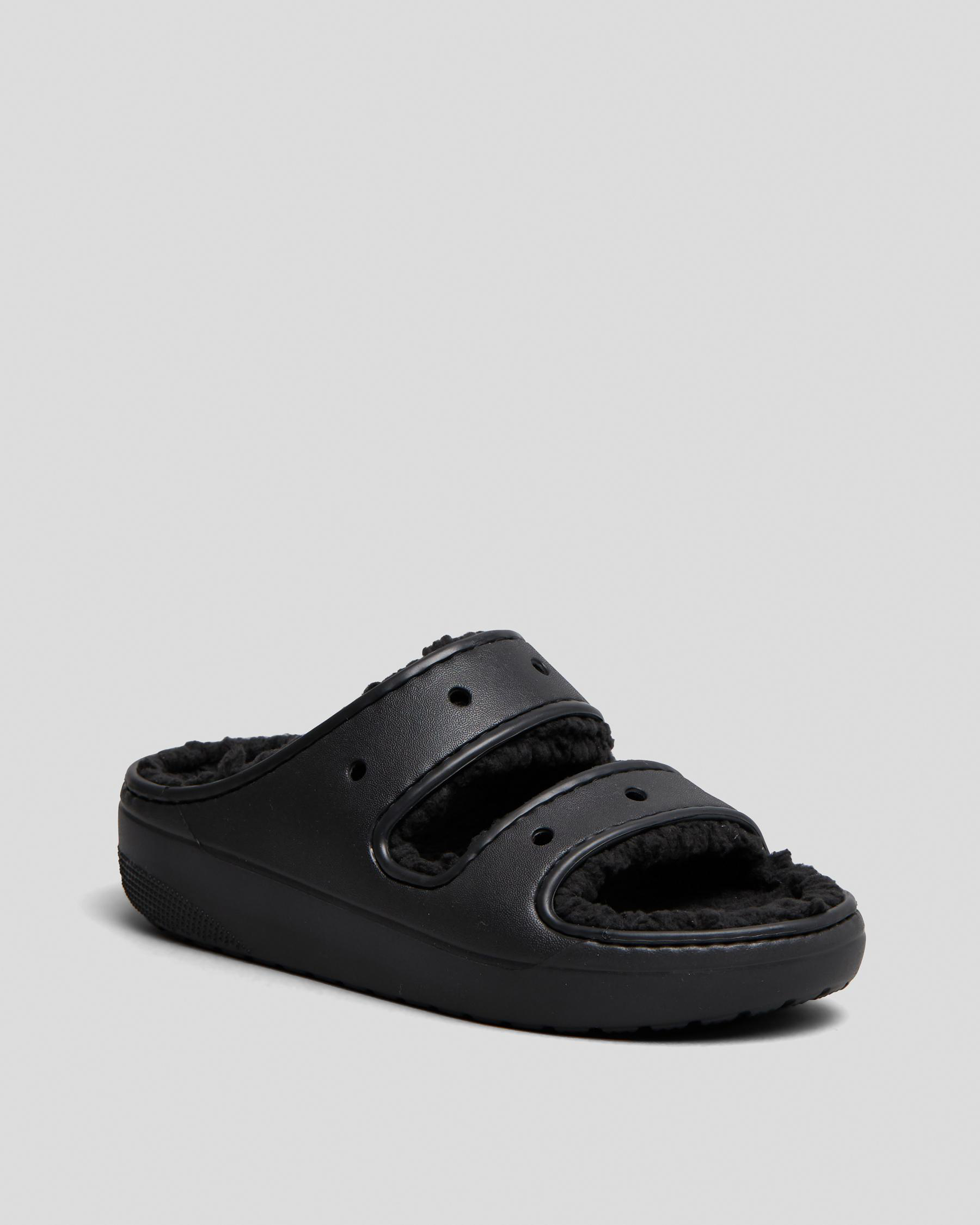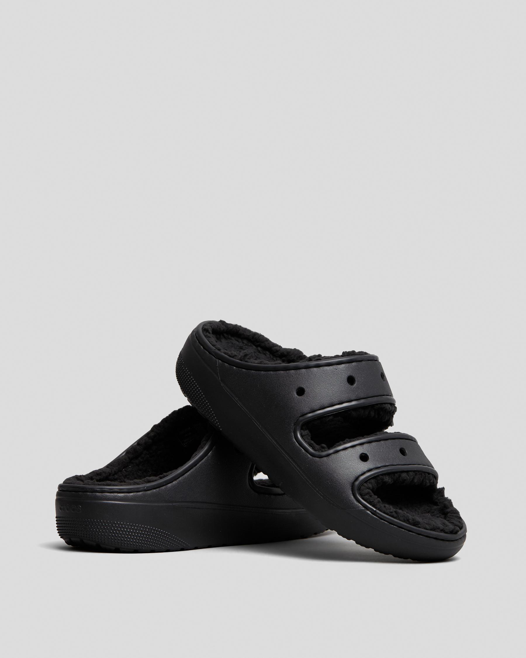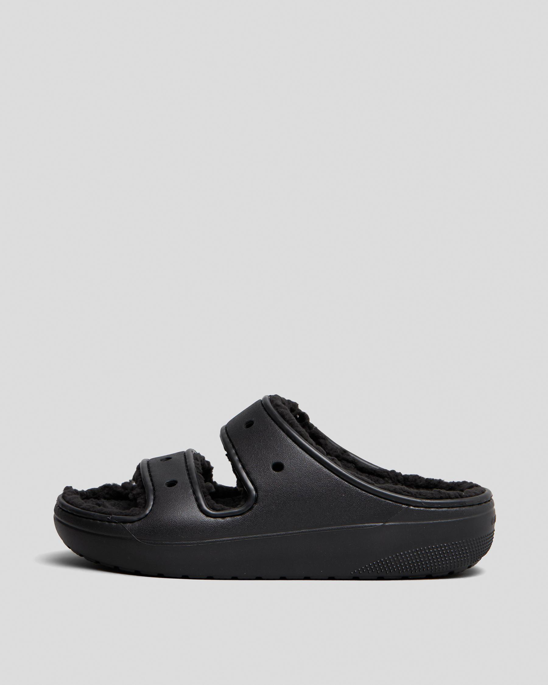 Step out in style with the Crocs Classic Cozzzy Sandals in sleek black. These cozy slip-on sandals offer ultimate comfort and versatility for any occasion.