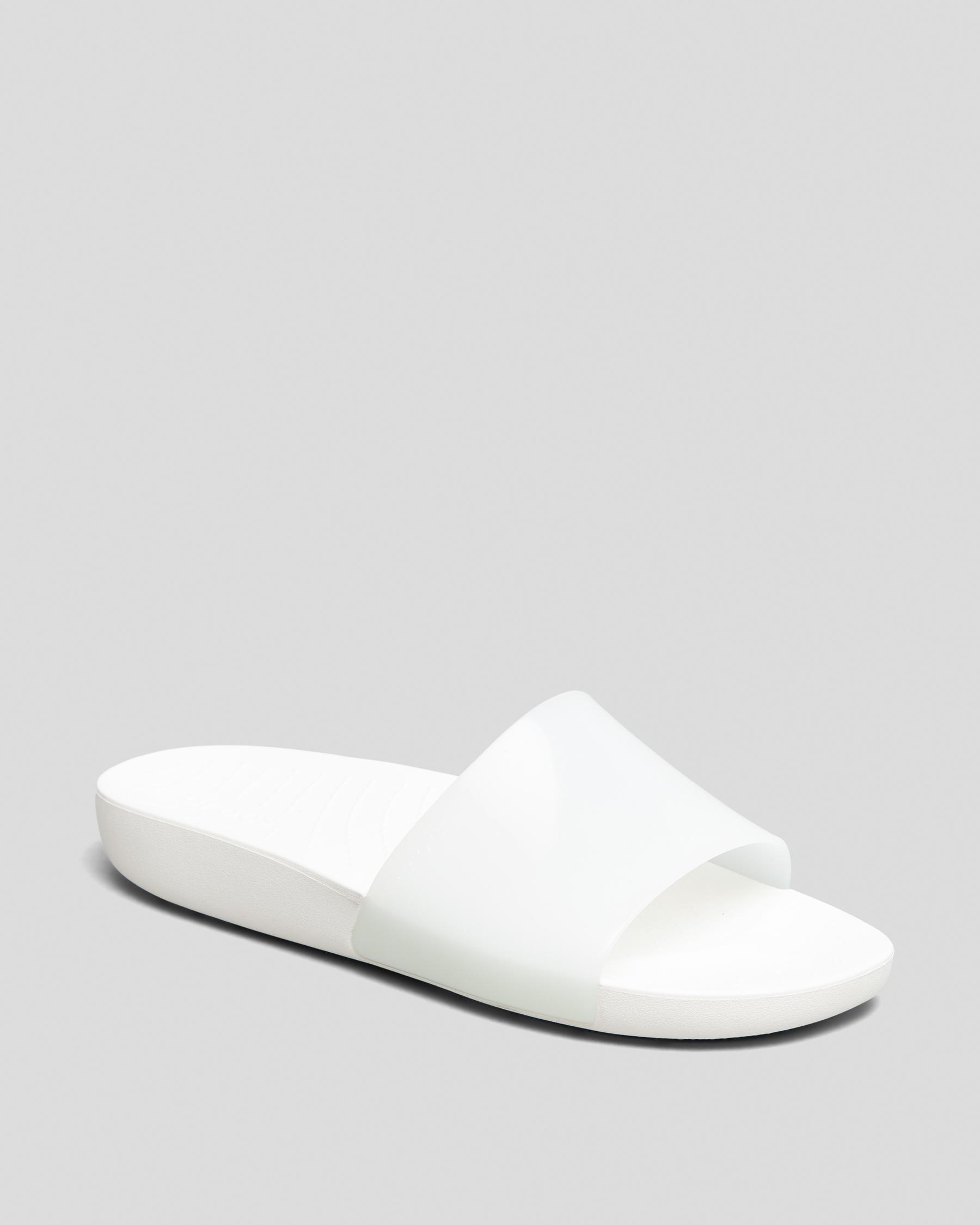 High shine glossy treatment on upper Cupped footbeds for sink-in comfort Soft TPU upper Water-friendly and buoyant Easy to clean and quick to dry