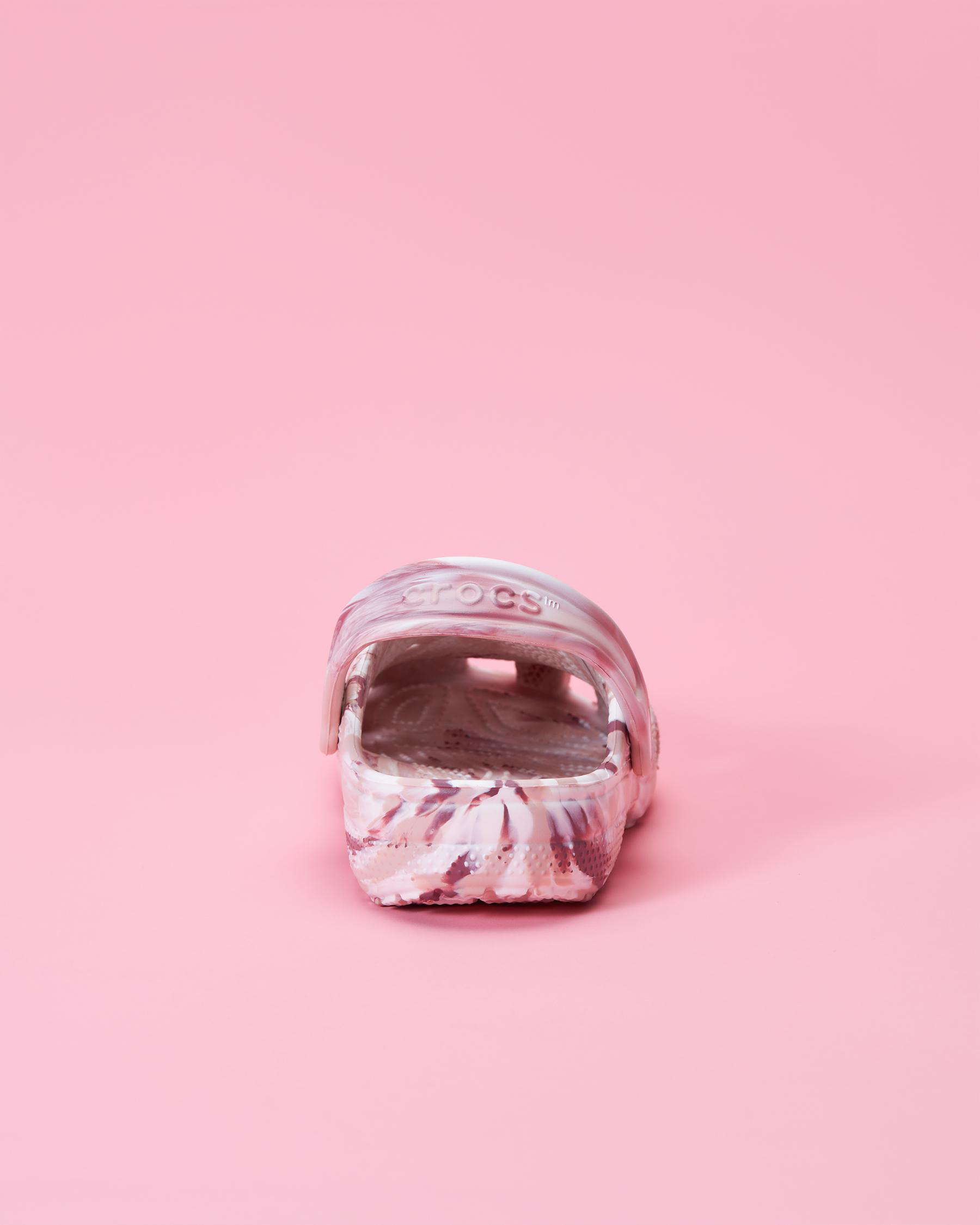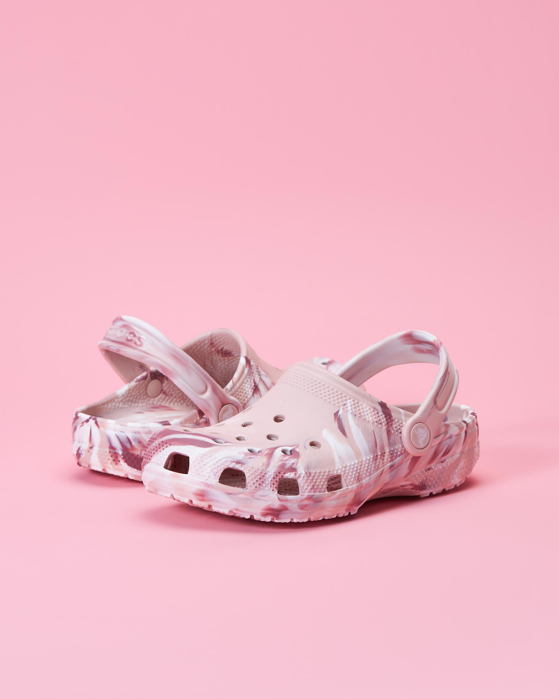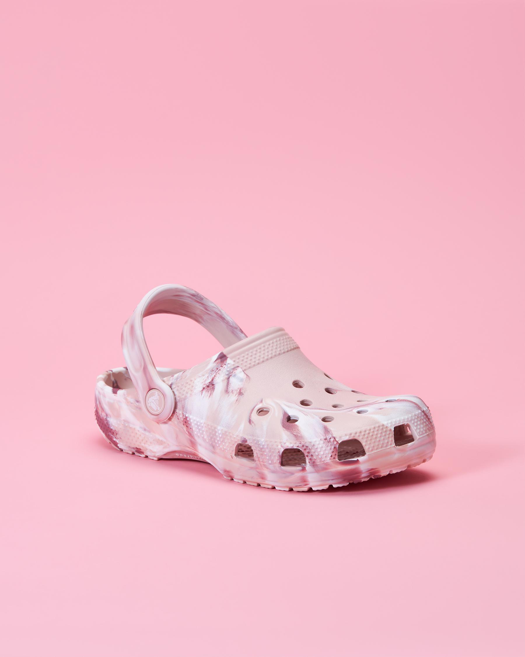 Crocs' Kids' Classic Marbled Clogs in Quartz features a unique swirl of pink and purple, perfect for adding a touch of fun to any outfit.