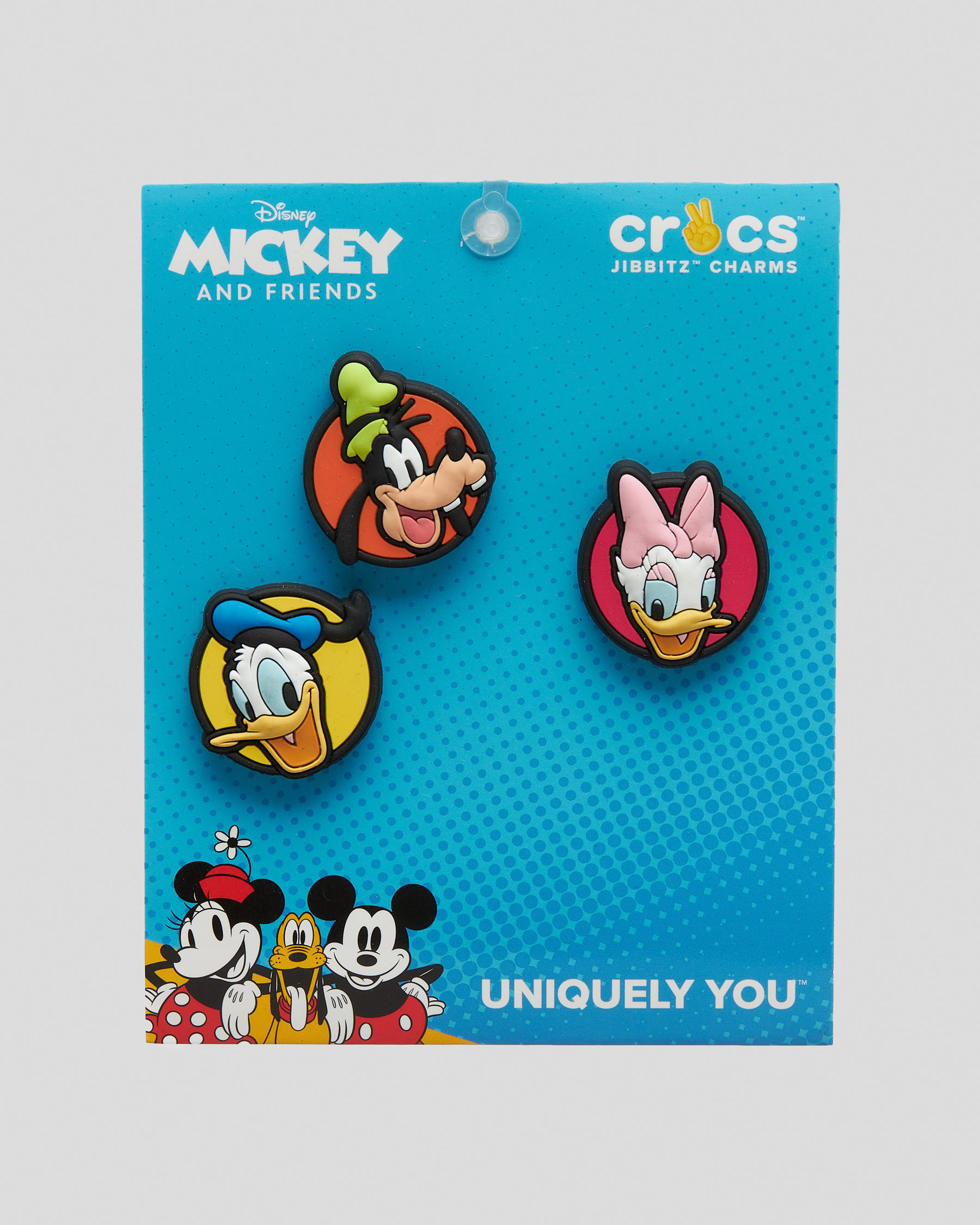 Disney fans of all ages will appreciate these Mickey Friends Jibbitz™ charms that allow them to personalize their favorite clogs. 3-Pack includes Donald Duck, Daisy Duck and Goofy.