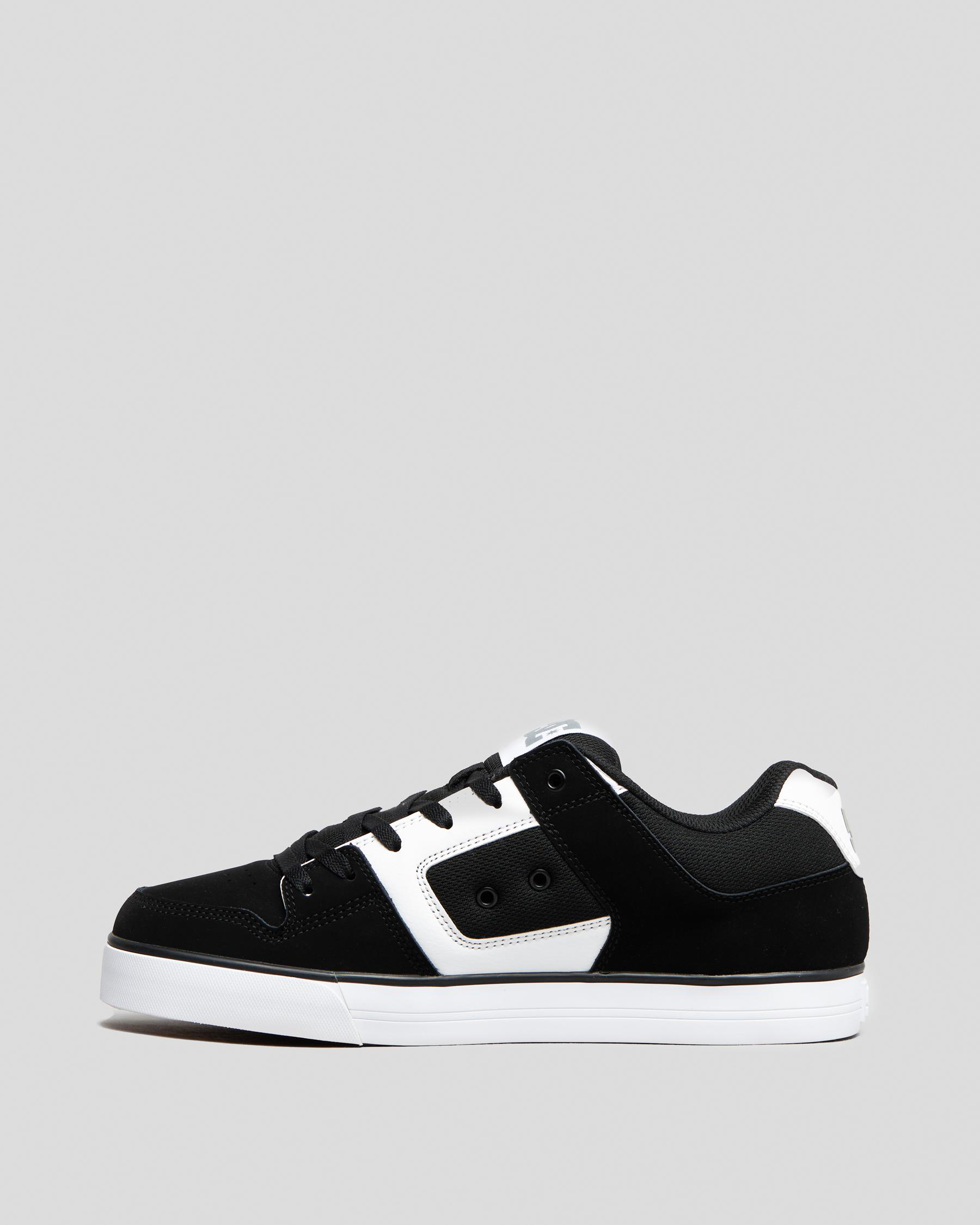 The DC Shoes Pure Shoes in Black are classic yet stylish, with a pop of white and gum sole for a modern twist. Perfect for everyday wear.