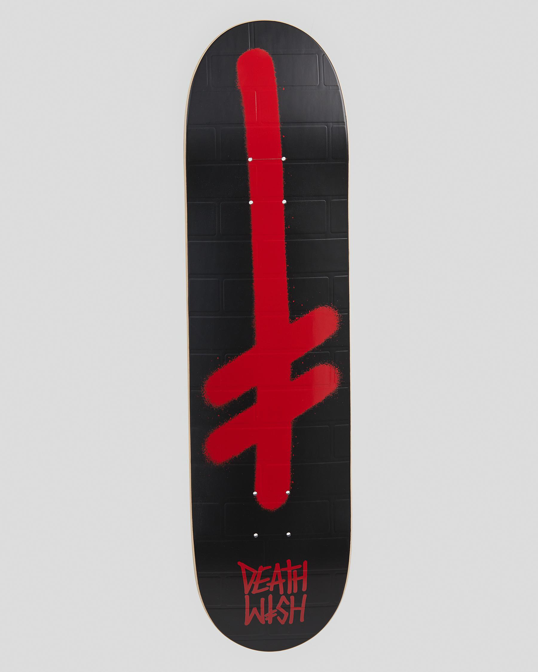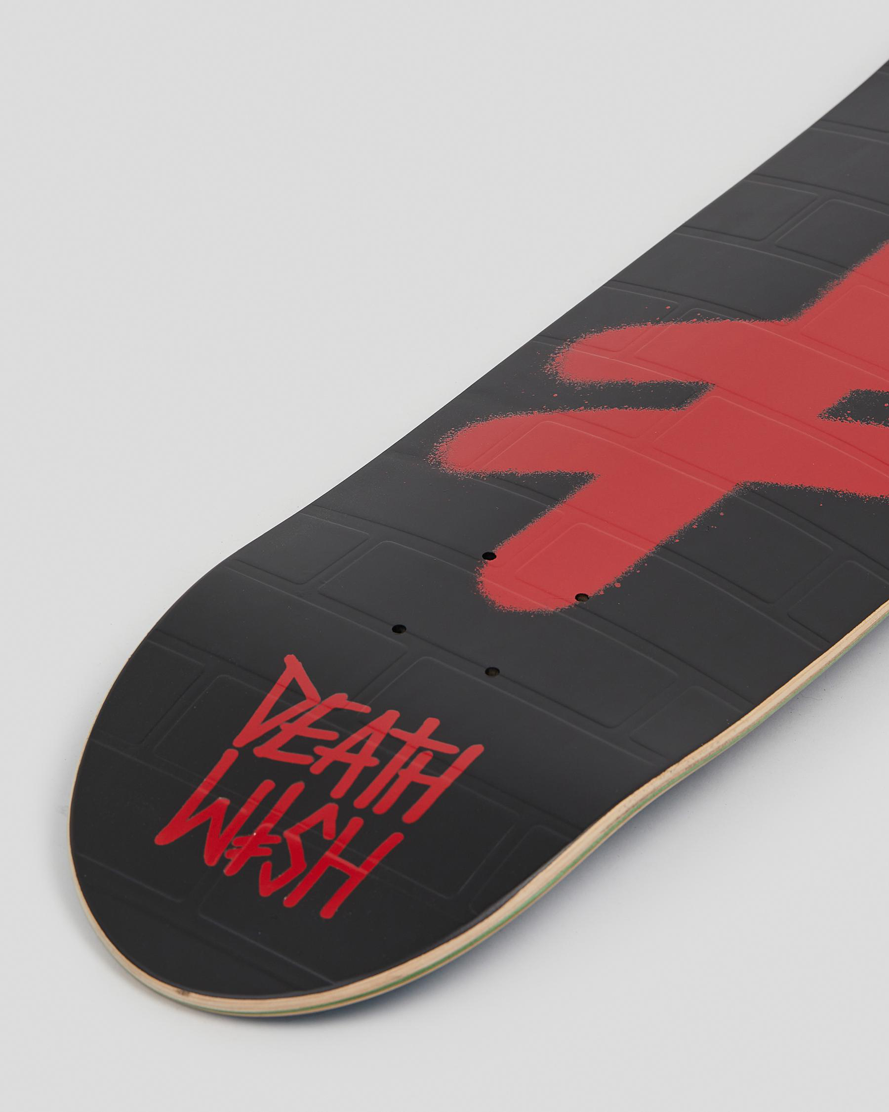 Decked out in bold black and red, the Deathwish Gang Logo 8.0 Skateboard Deck stands out against the backdrop of city streets and skate parks.