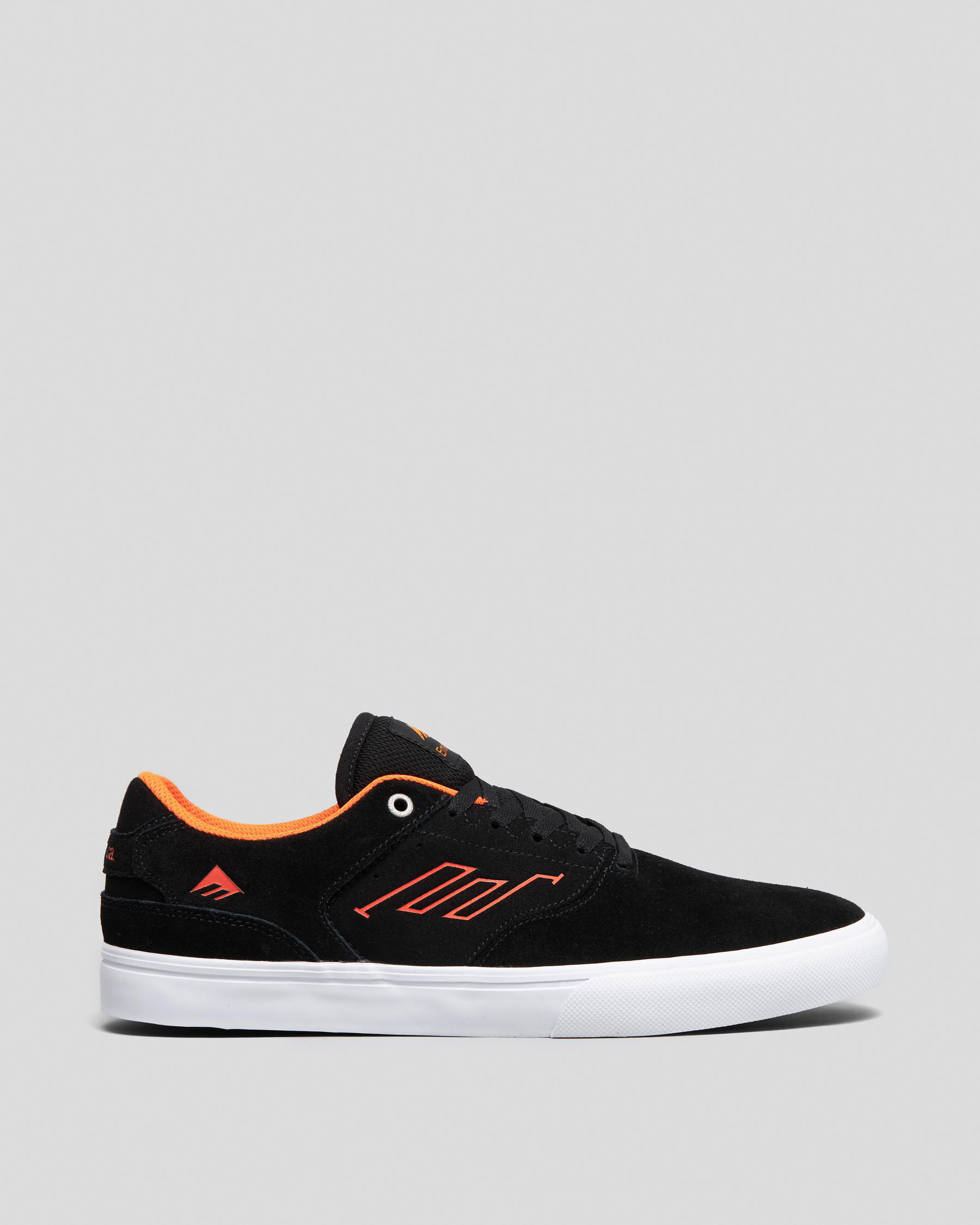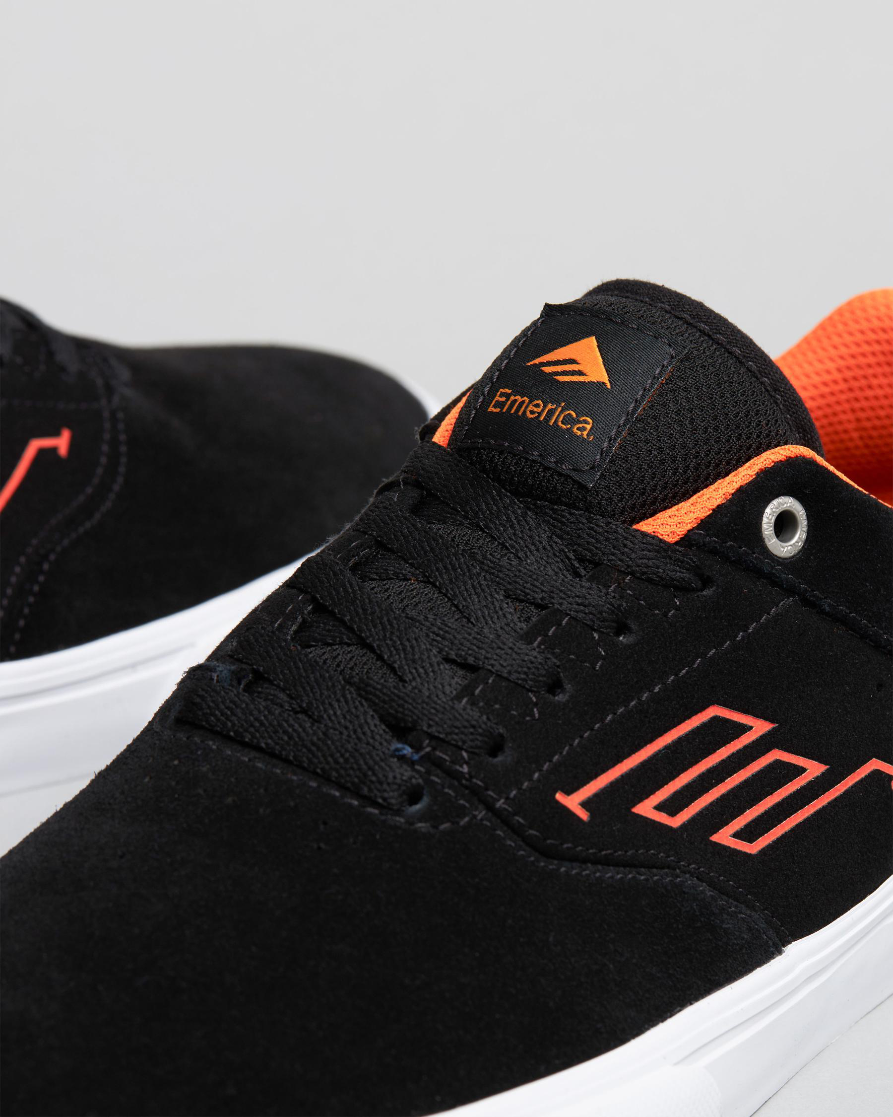 The Emerica Low Vulc Shoes in Black are a sleek and stylish option for any skateboarding enthusiast. With a pop of orange, these shoes are sure to stand out on the streets.