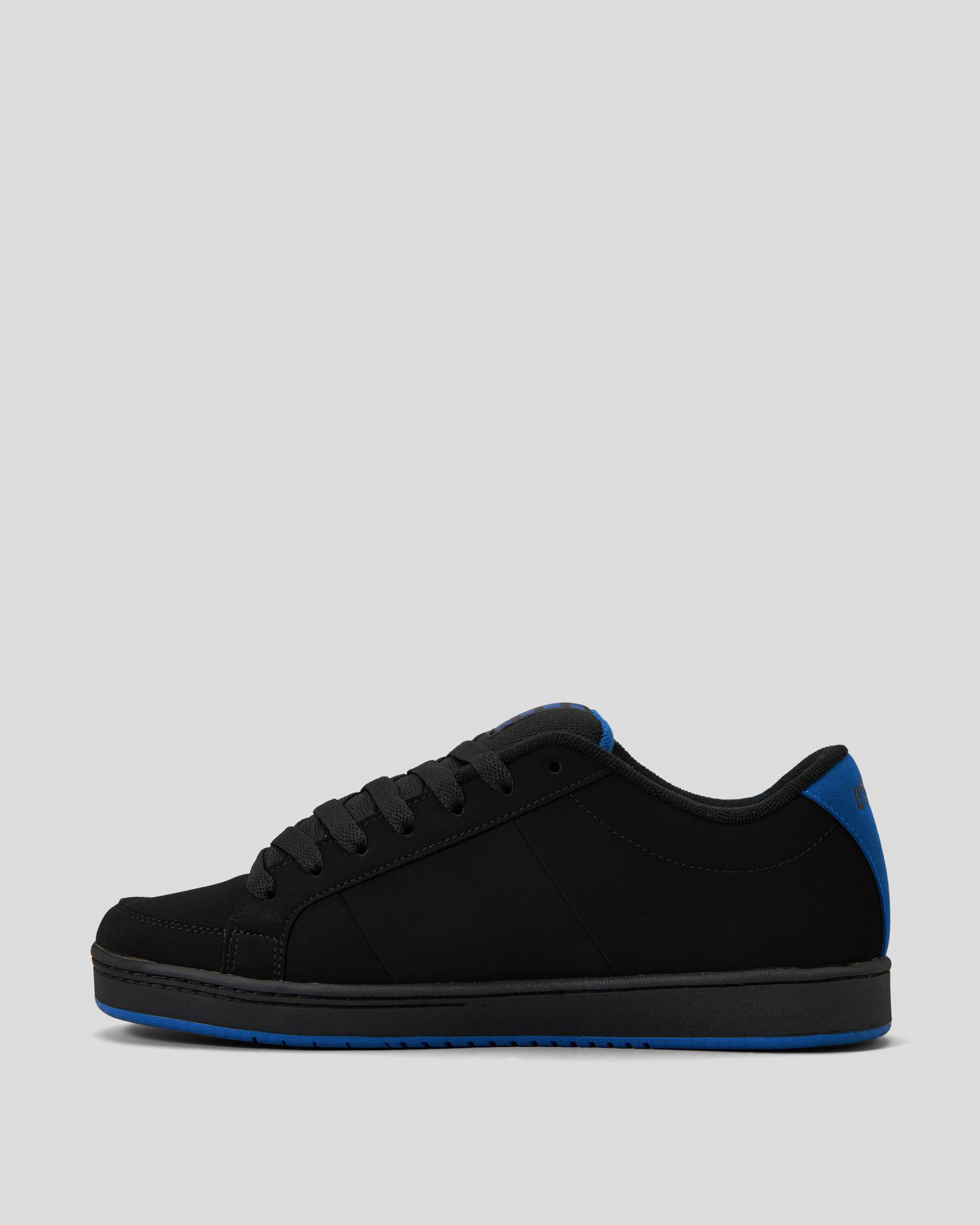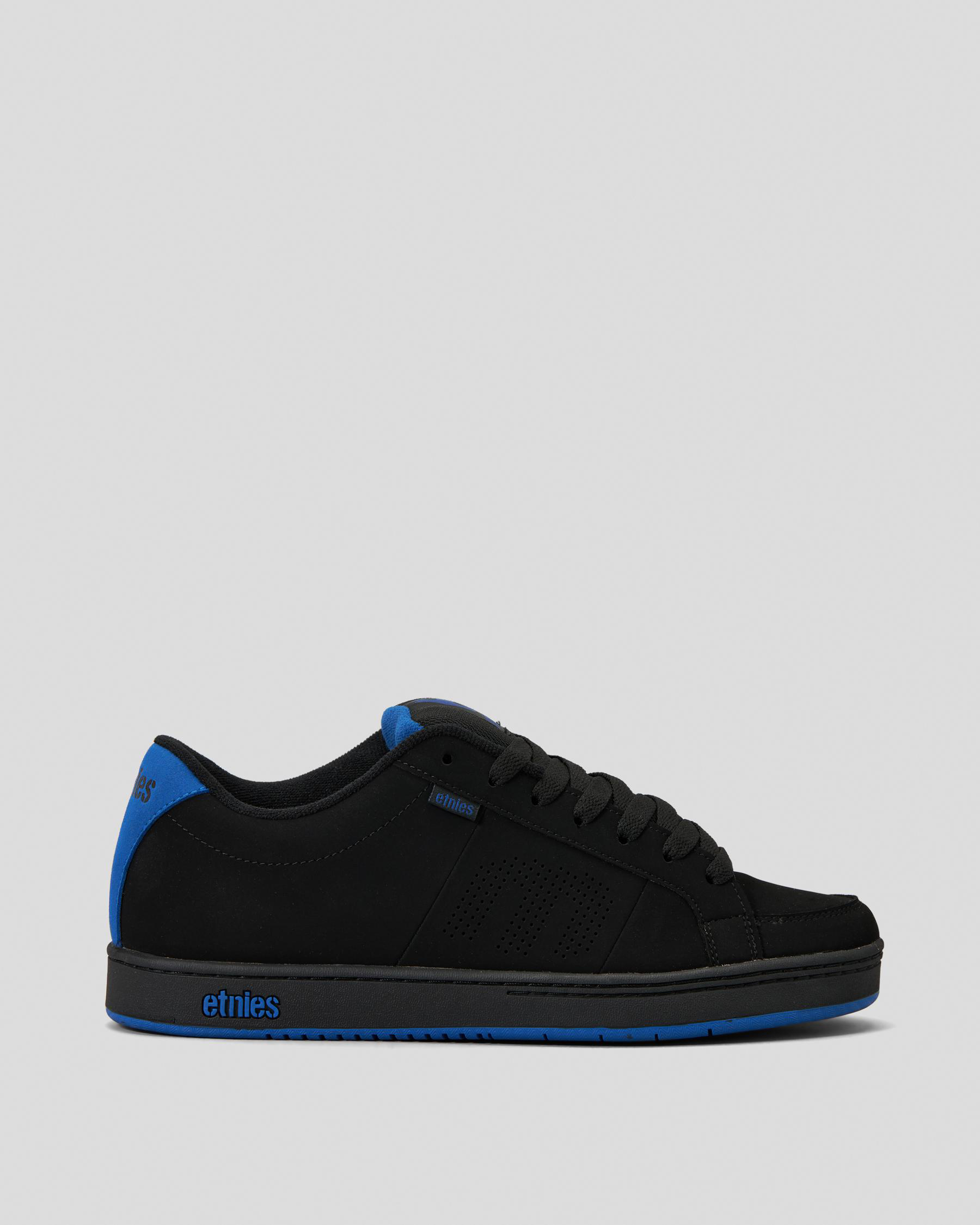 The Etnies Kingpin Shoes in Black feature a sleek design with a pop of blue, perfect for adding a touch of style to your everyday look.