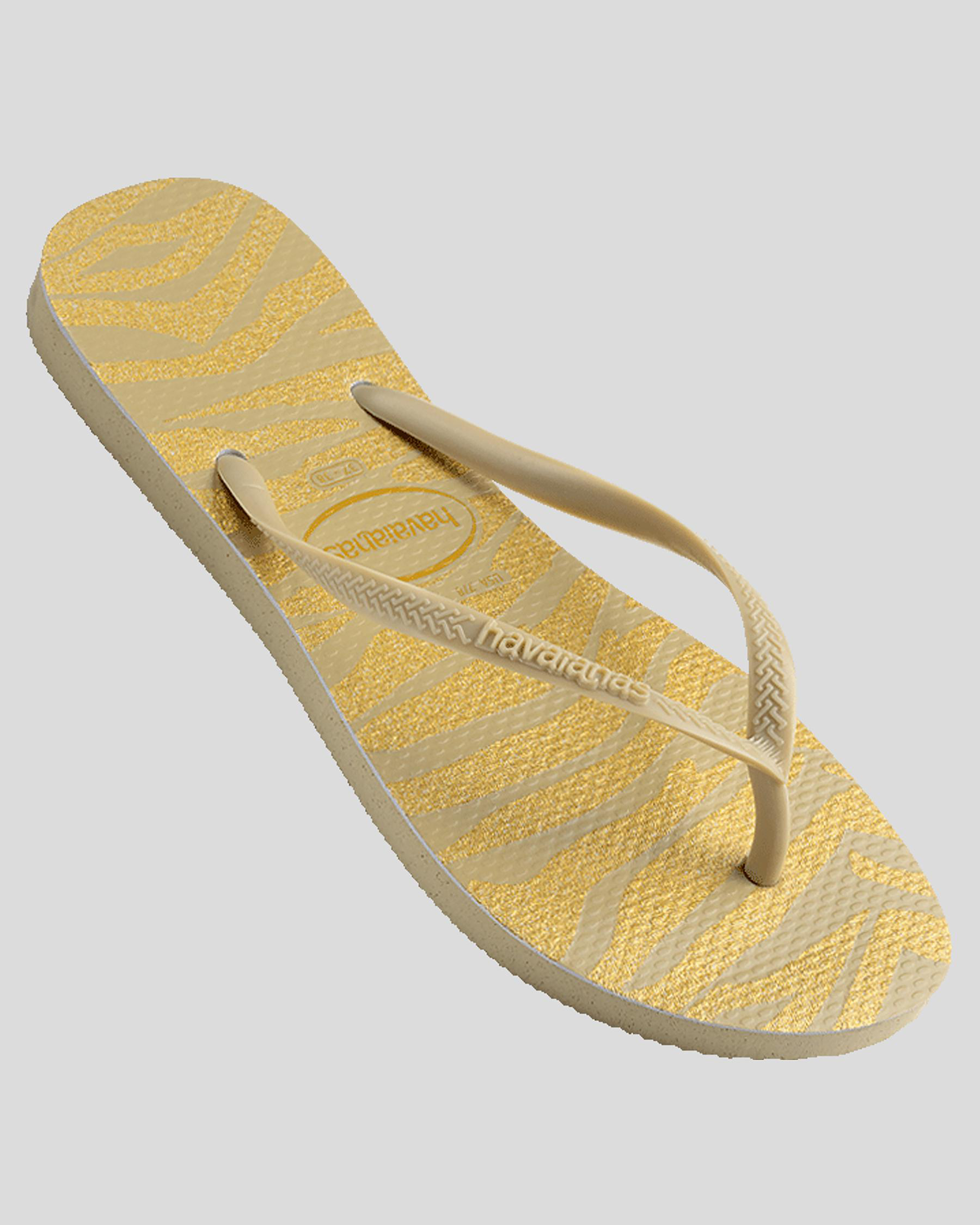 Slim straps, Textured footbed, Printed footbed, Rubber logo