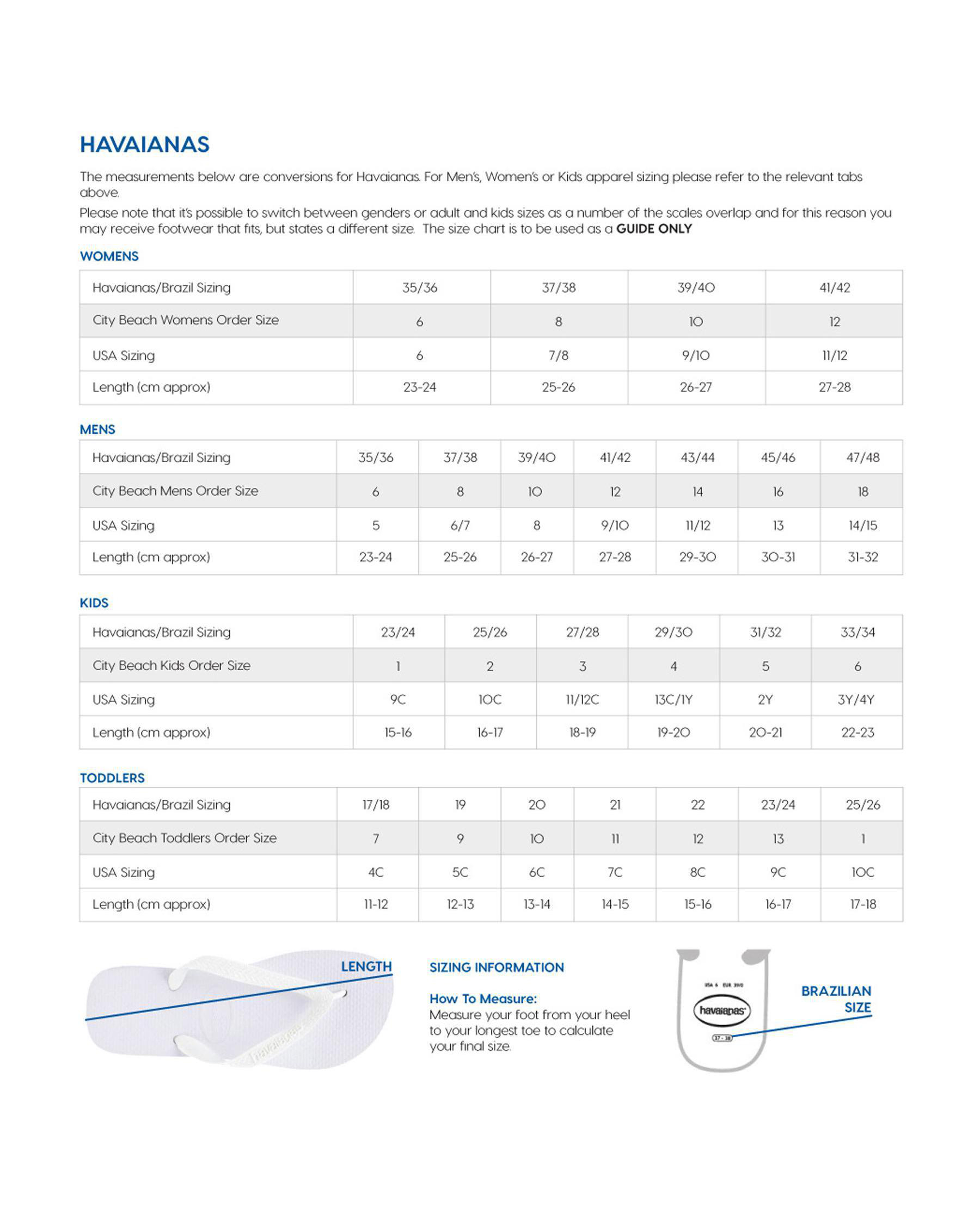 The measurements below are conversions for Havaianas.