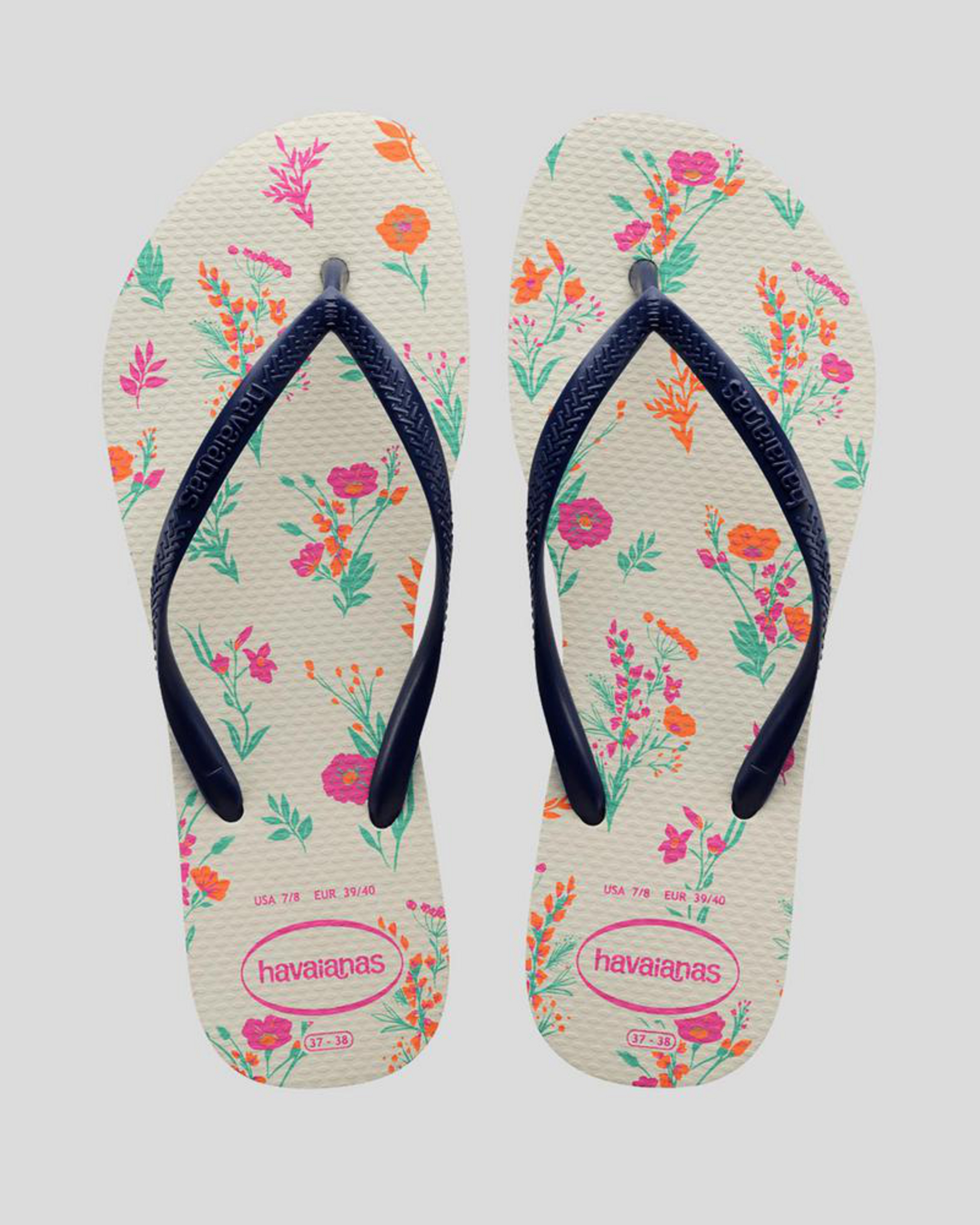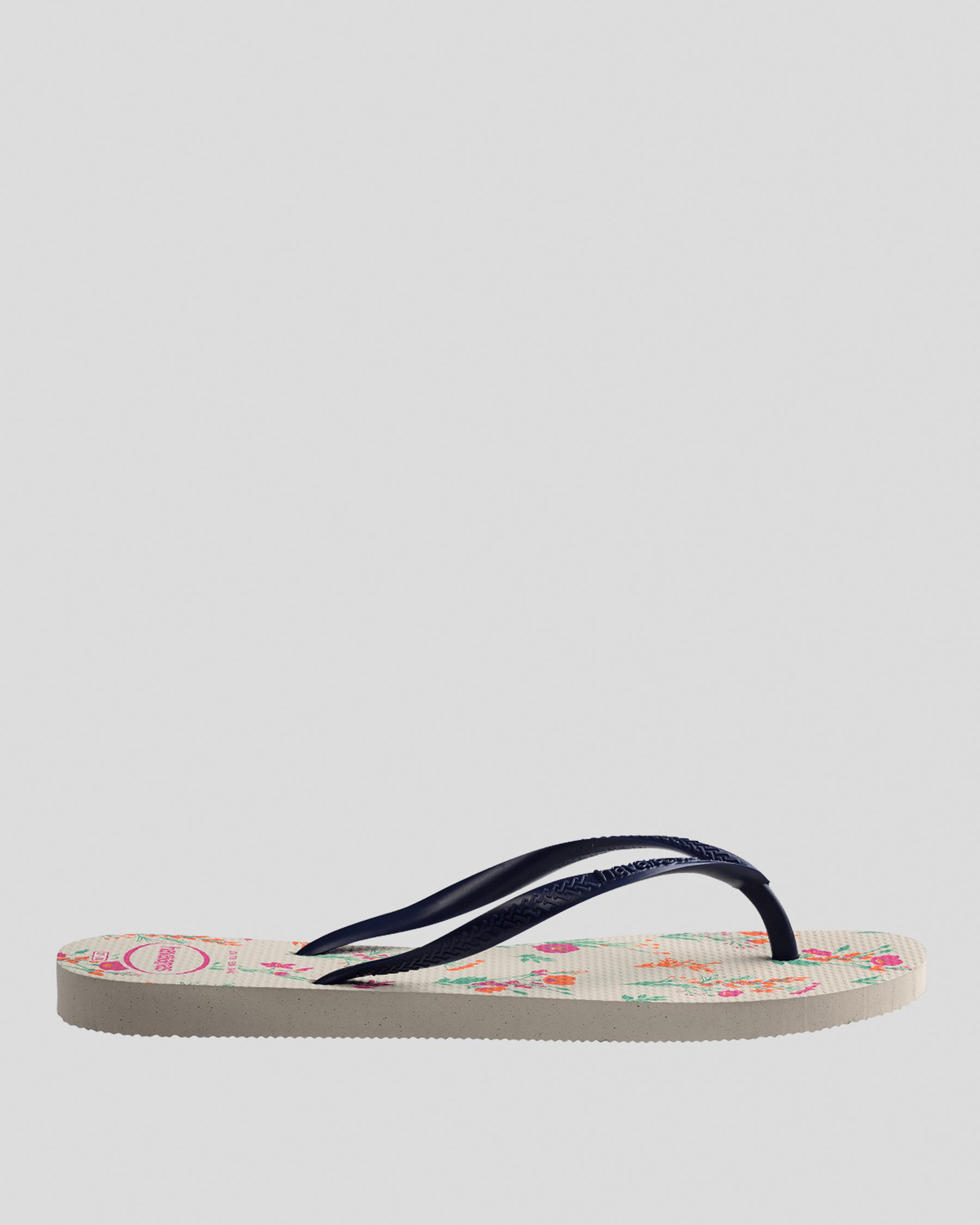 Add a touch of nautical charm to your summer wardrobe with these white/navy blue Slim Romance Thongs. Perfect for beach days and casual outings.