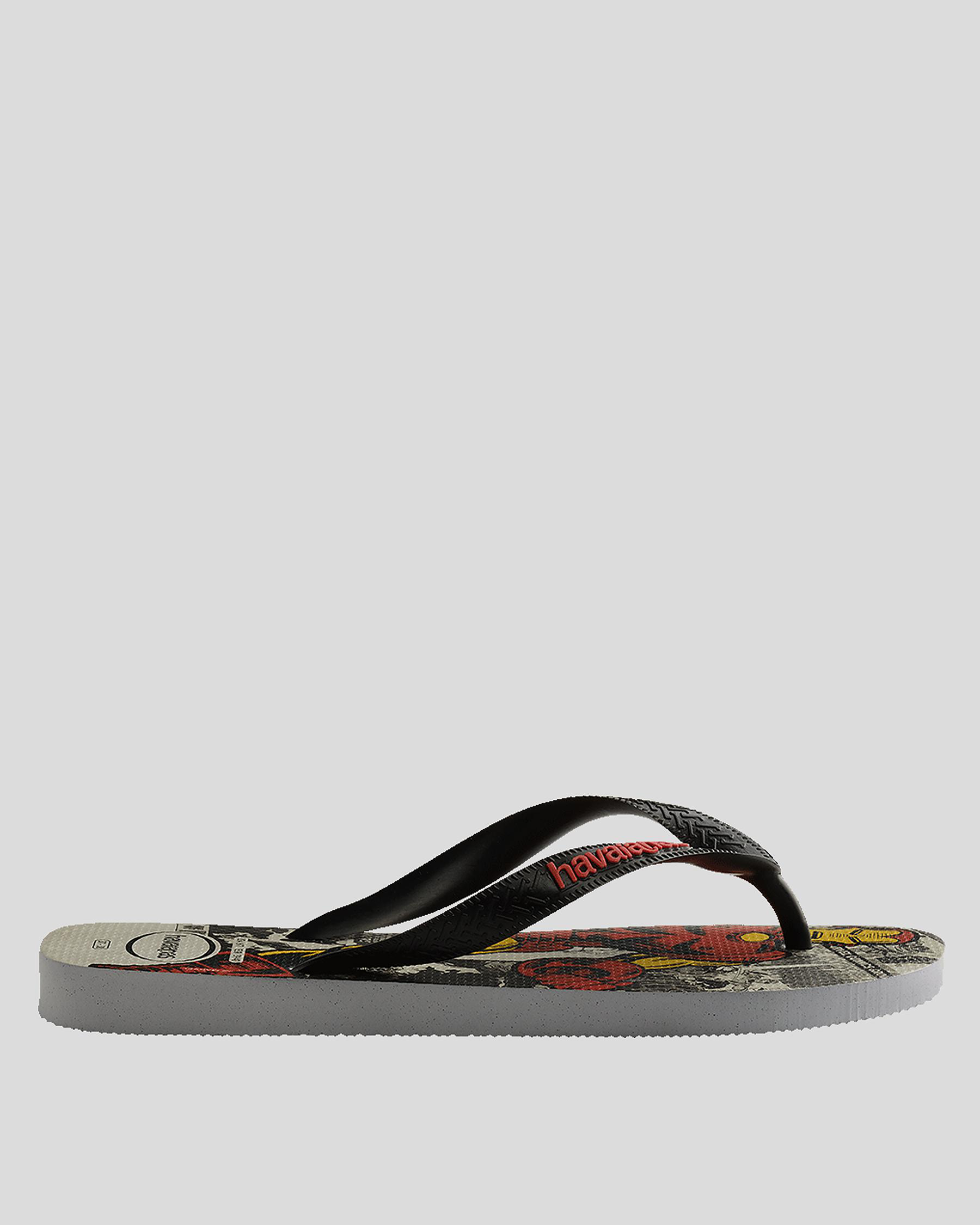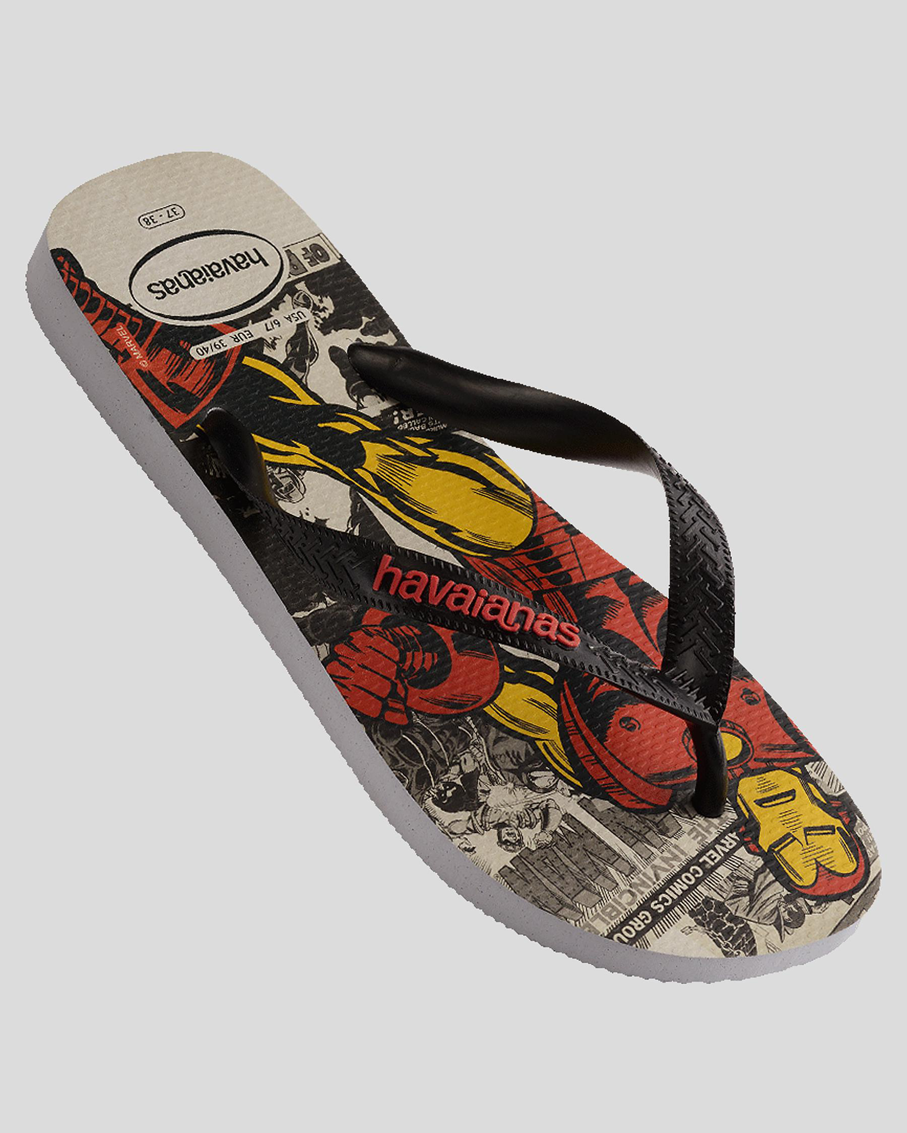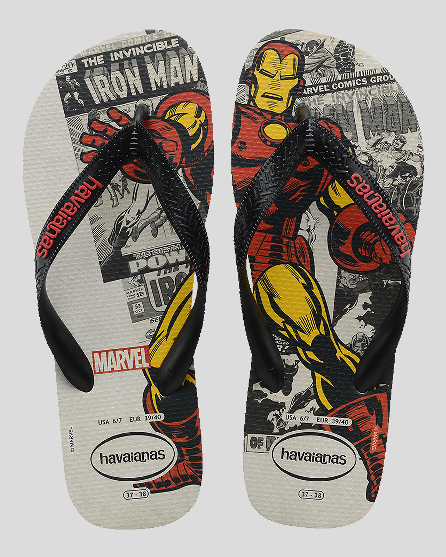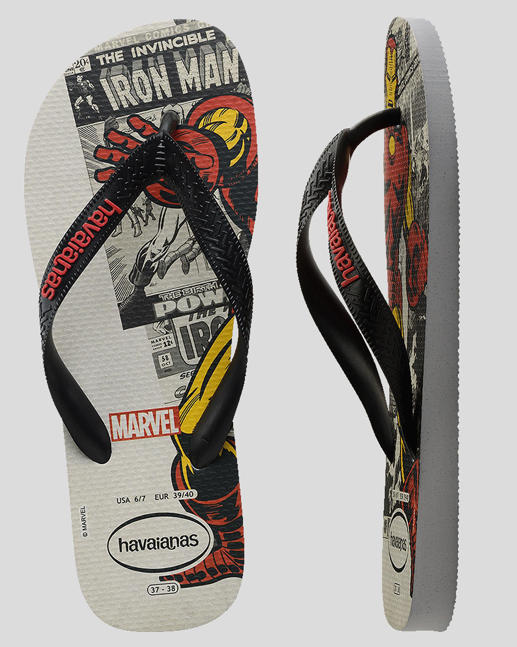 Step out in style with the Havaianas Top Marvel Iron Man Thongs in Ice Grey. Featuring a sleek singular color, these thongs are a must-have for any Iron Man fan.
