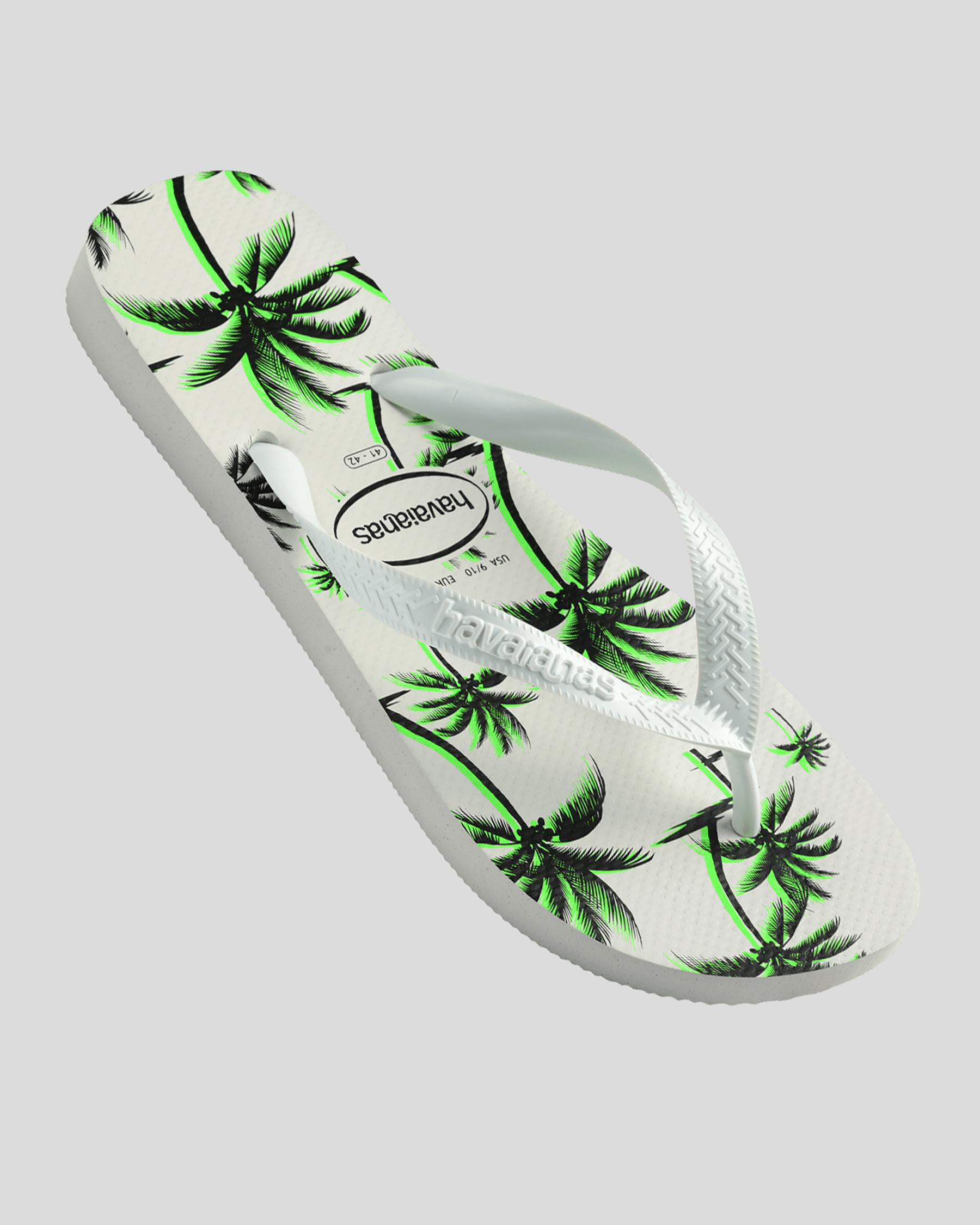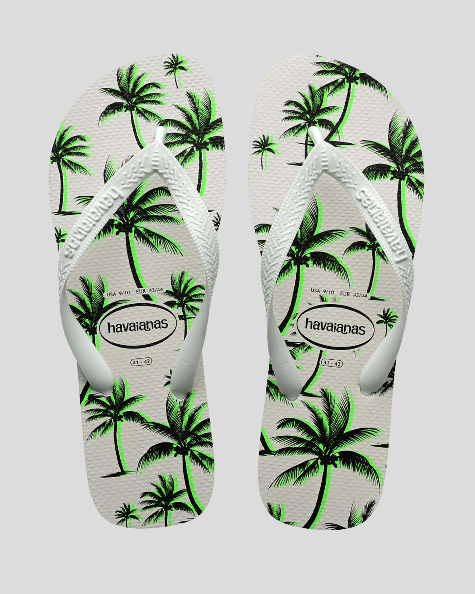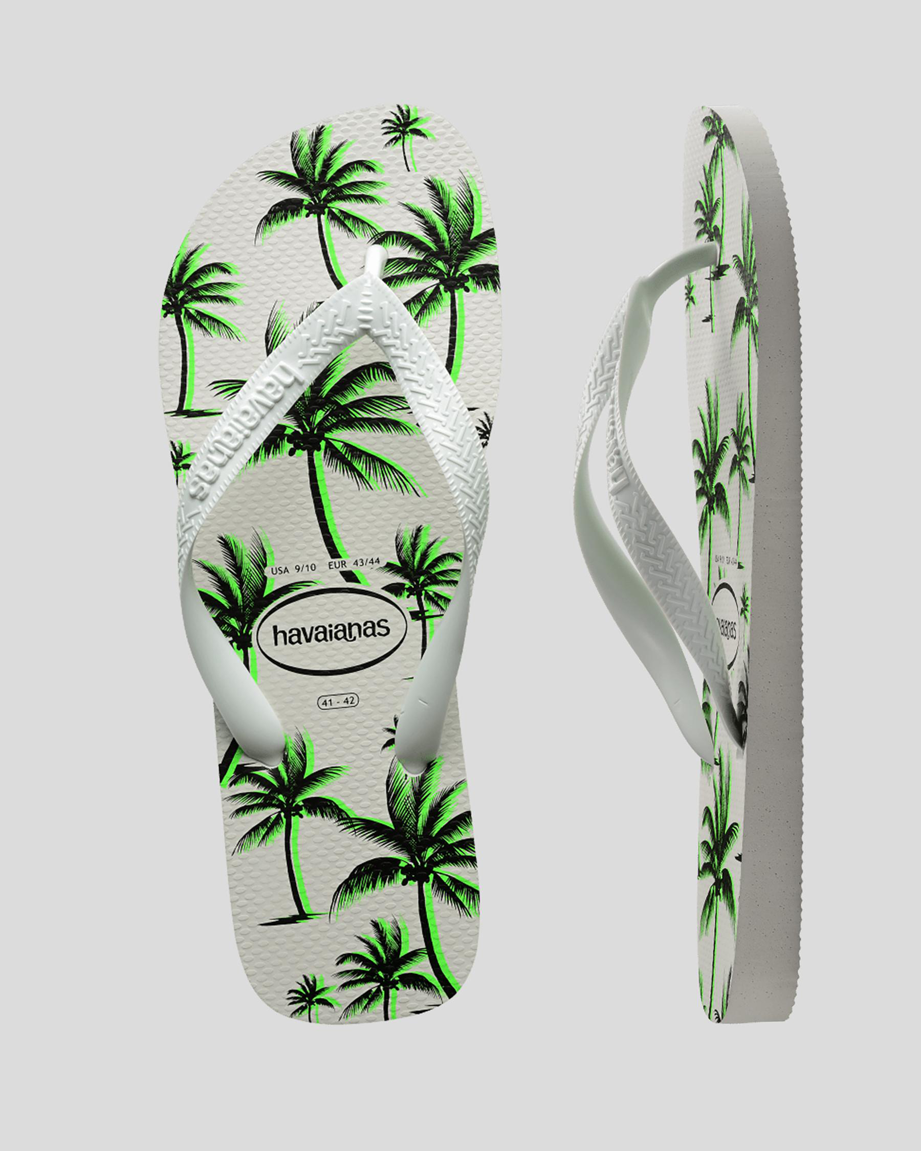 The Havaianas Top Print Aloha Thongs in green are adorned with a playful white floral pattern, perfect for adding a touch of tropical flair to your summer wardrobe.