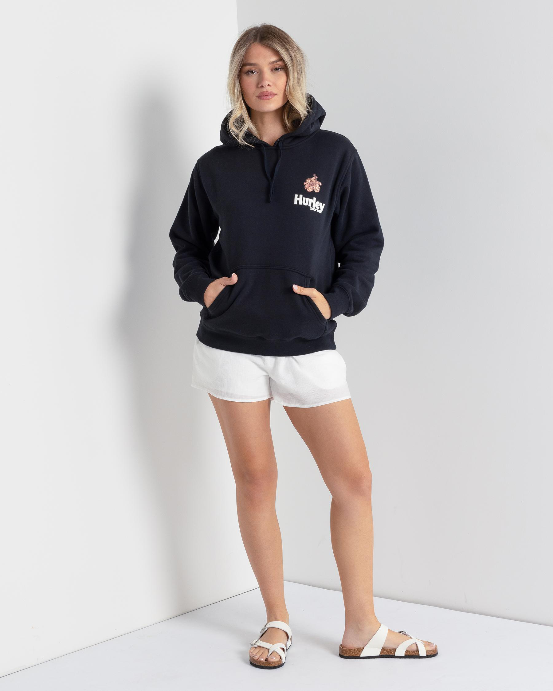Front hand pockets, Ribbed cuffs, Ribbed hem, Draw cord hood