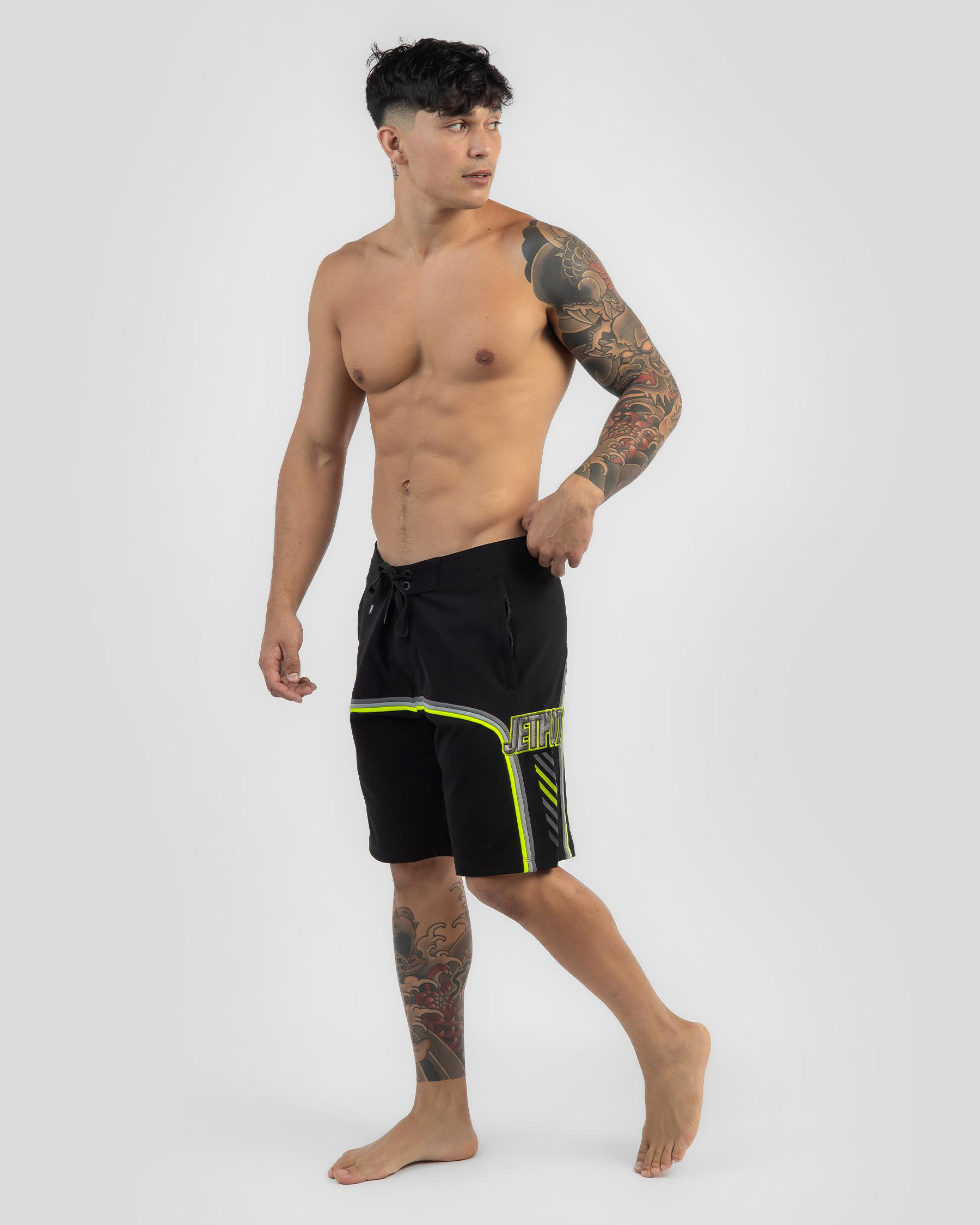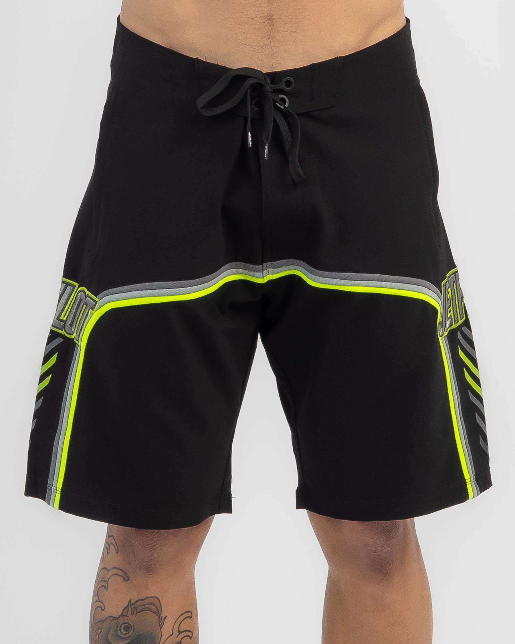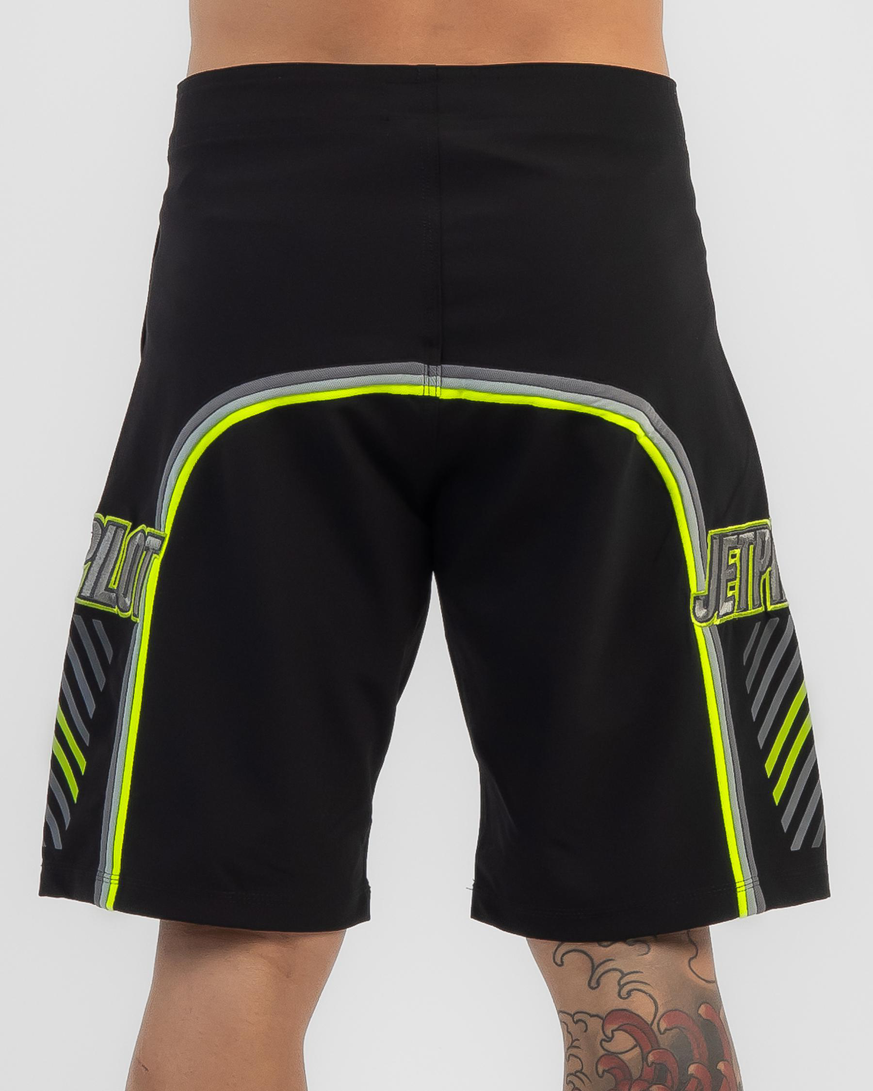 The Jetpilot F4 Board Shorts in black are a sleek and stylish addition to your summer wardrobe. With pops of green, these shorts offer a modern twist on a classic design.