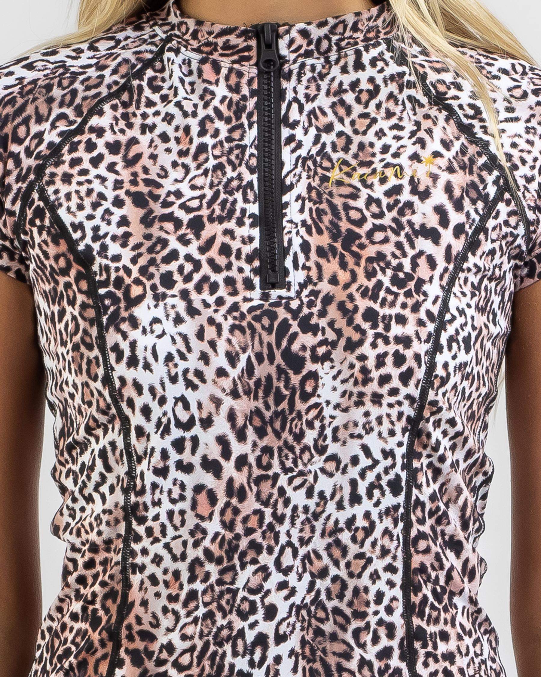 The Kaiami Amber Cap Sleeve Rash Vest in Leopard is a fierce and stylish choice for your next beach outing.