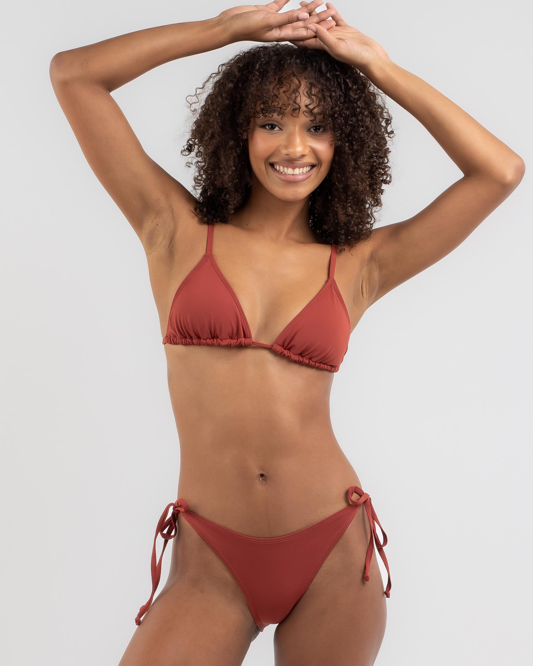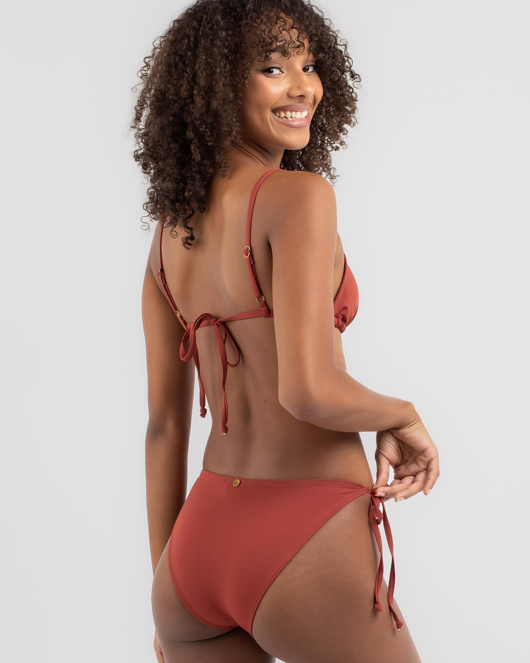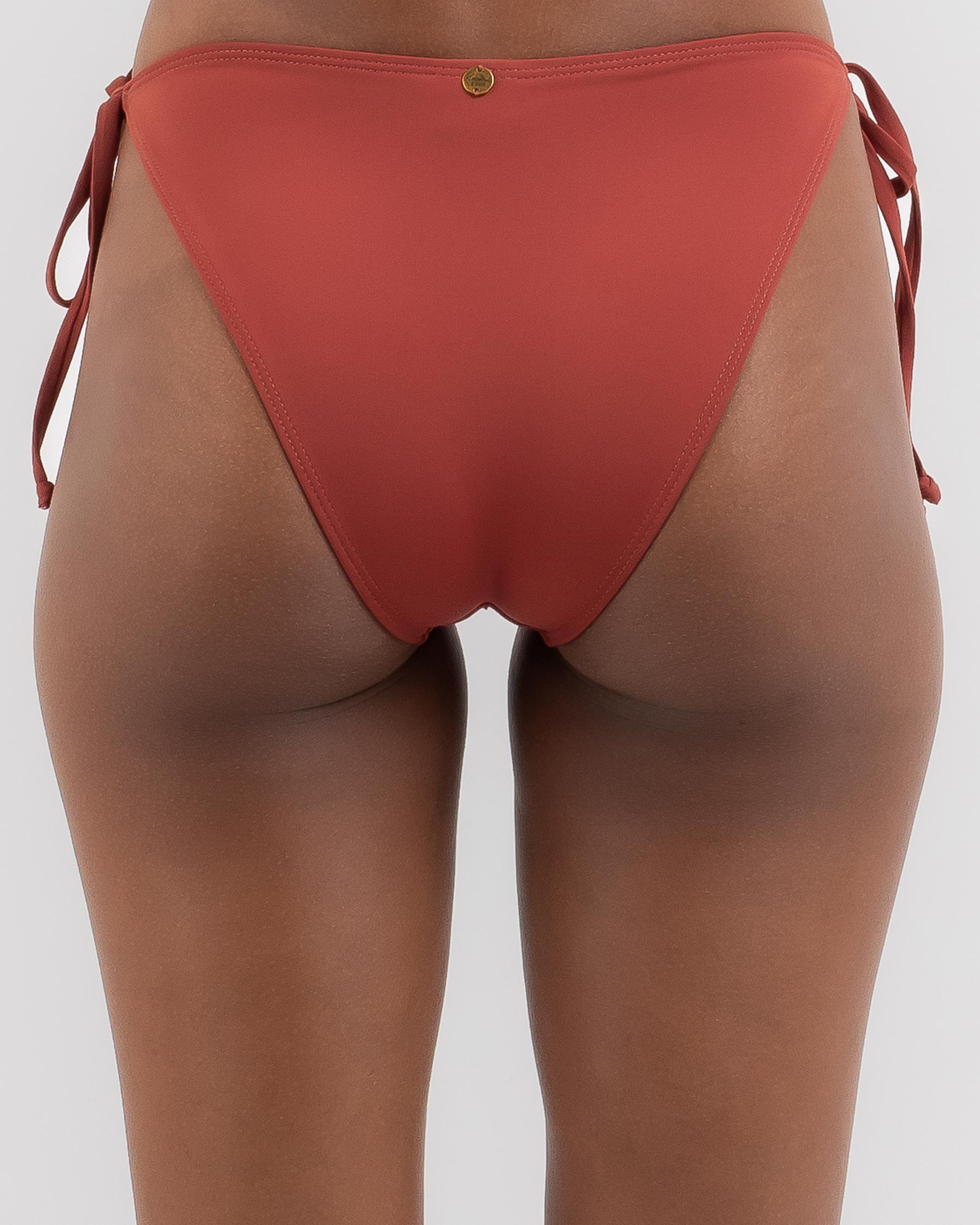 The Kaiami Lara Classic Tie Side Bikini Bottom in Terracotta is a must-have swimwear piece for a stylish beach look.