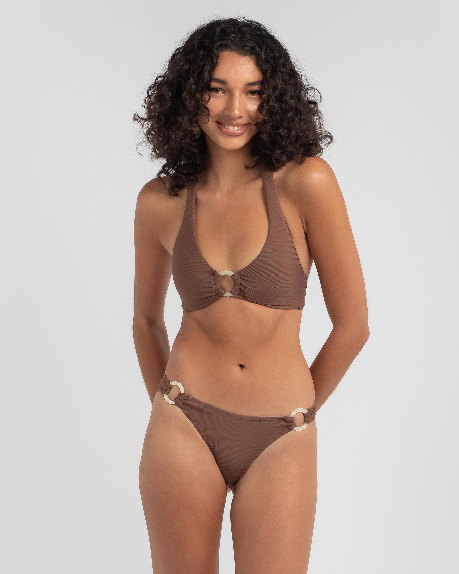 The Kaiami Norah Ring High Cut Bikini Bottom in Coffee exudes chic simplicity with its sleek design and flattering high cut style.