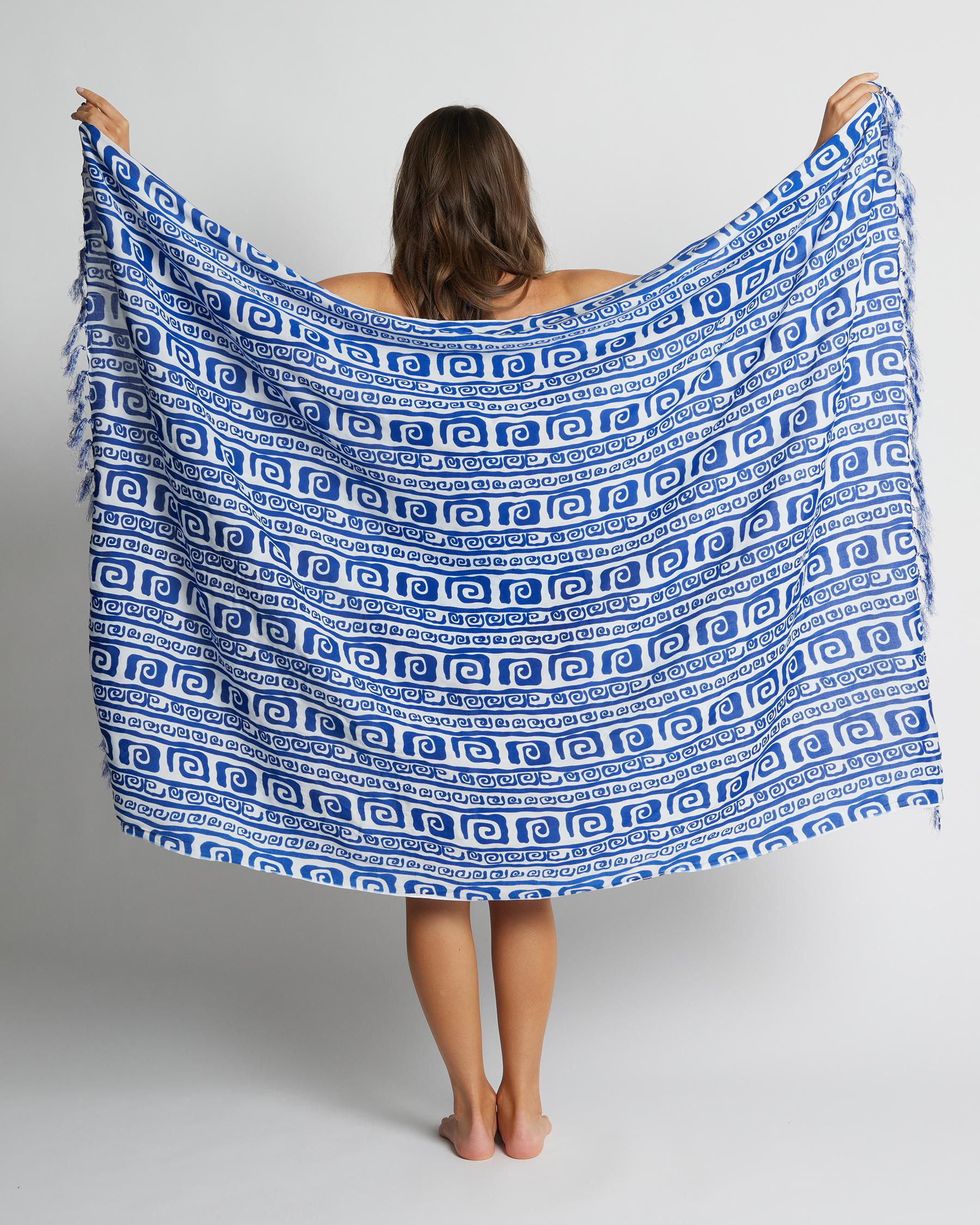 The Kaiami Pela Sarong in Blue is a versatile beach essential with a stylish white design. Perfect for lounging by the water in style.