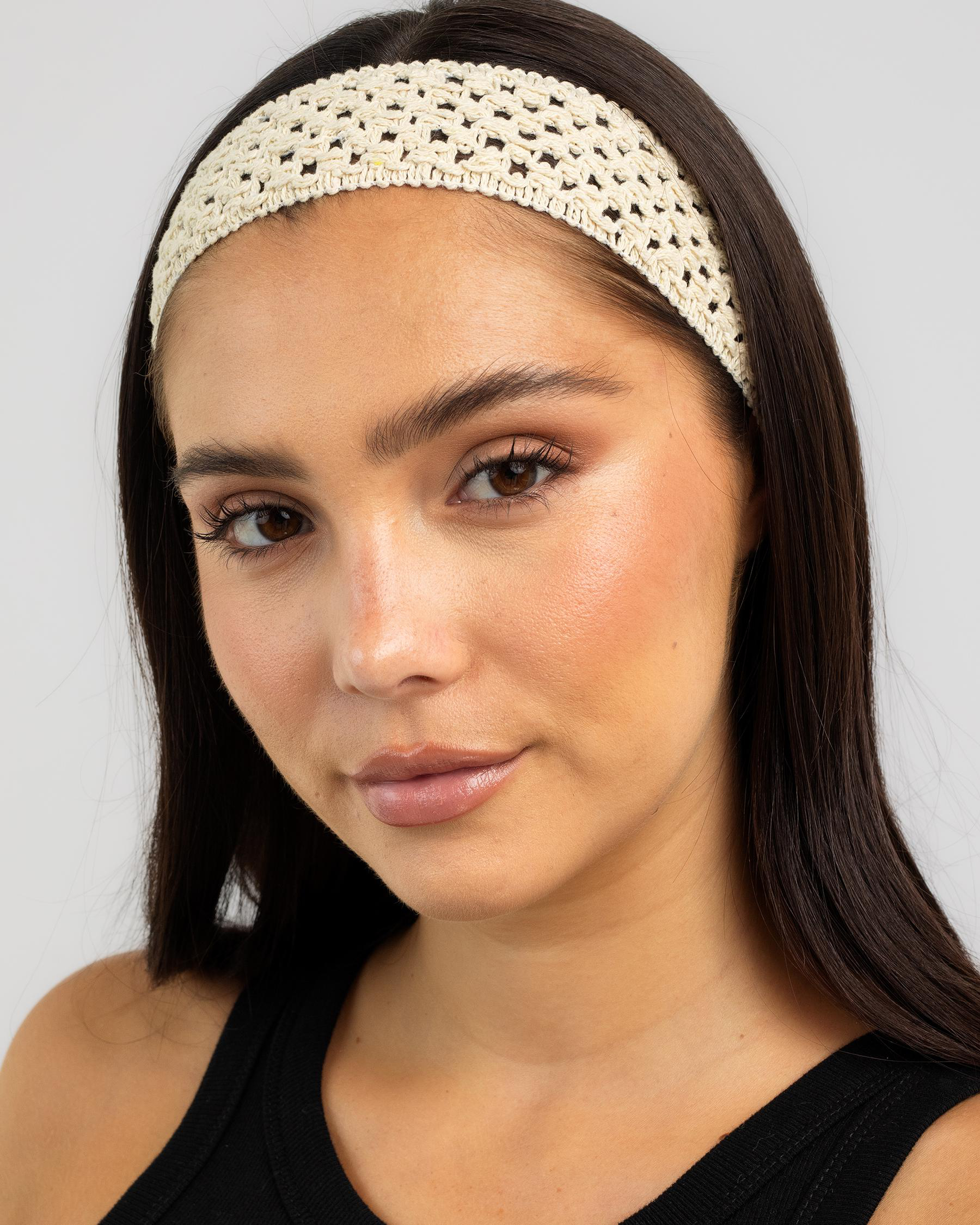 The Karyn In LA Tulum Crochet Headband in Alabaster is a chic accessory for adding a boho touch to your outfit.