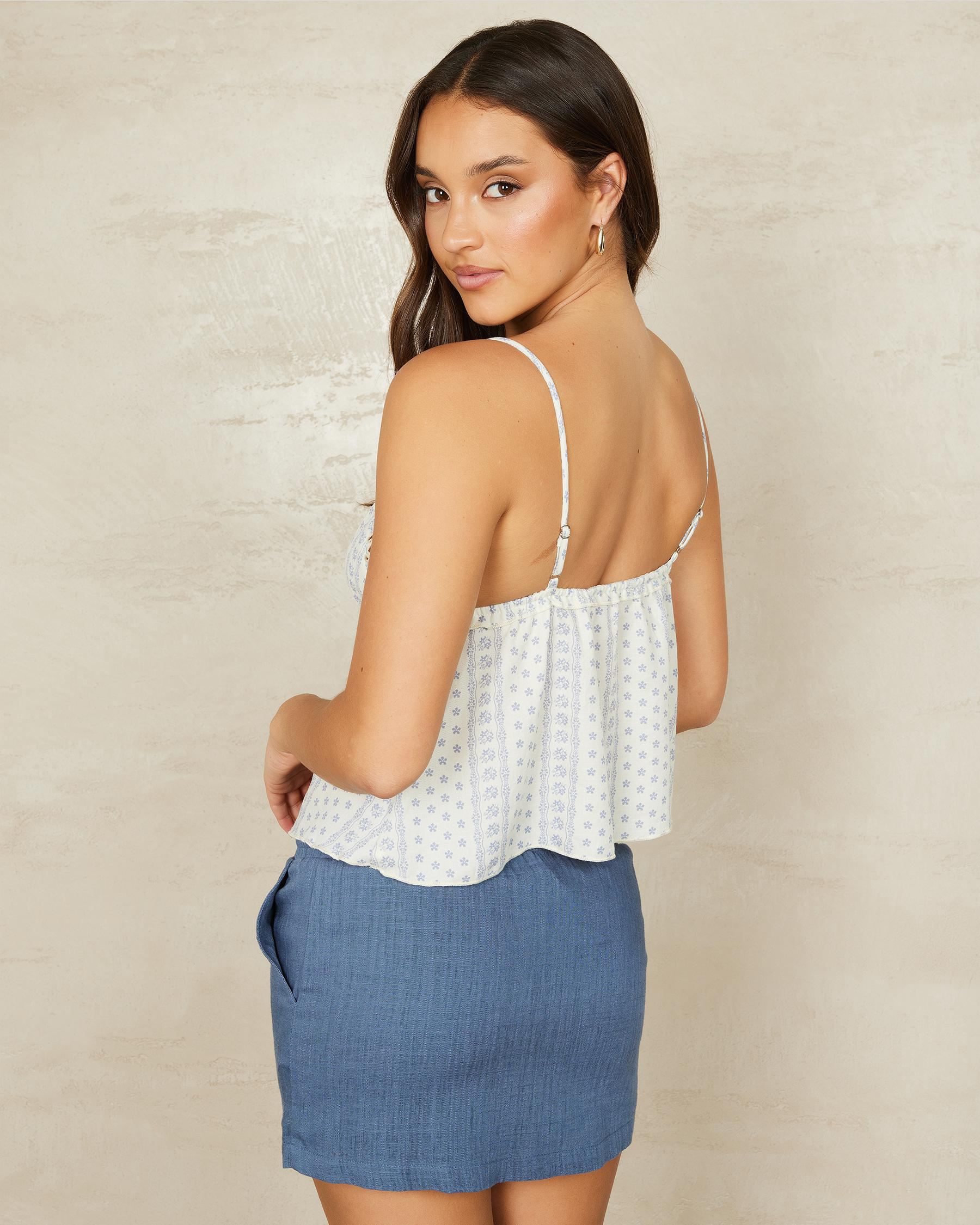 The Mooloola Elise Top in Blue is a chic and versatile addition to your wardrobe. The blue and cream color combination adds a touch of elegance to any outfit.