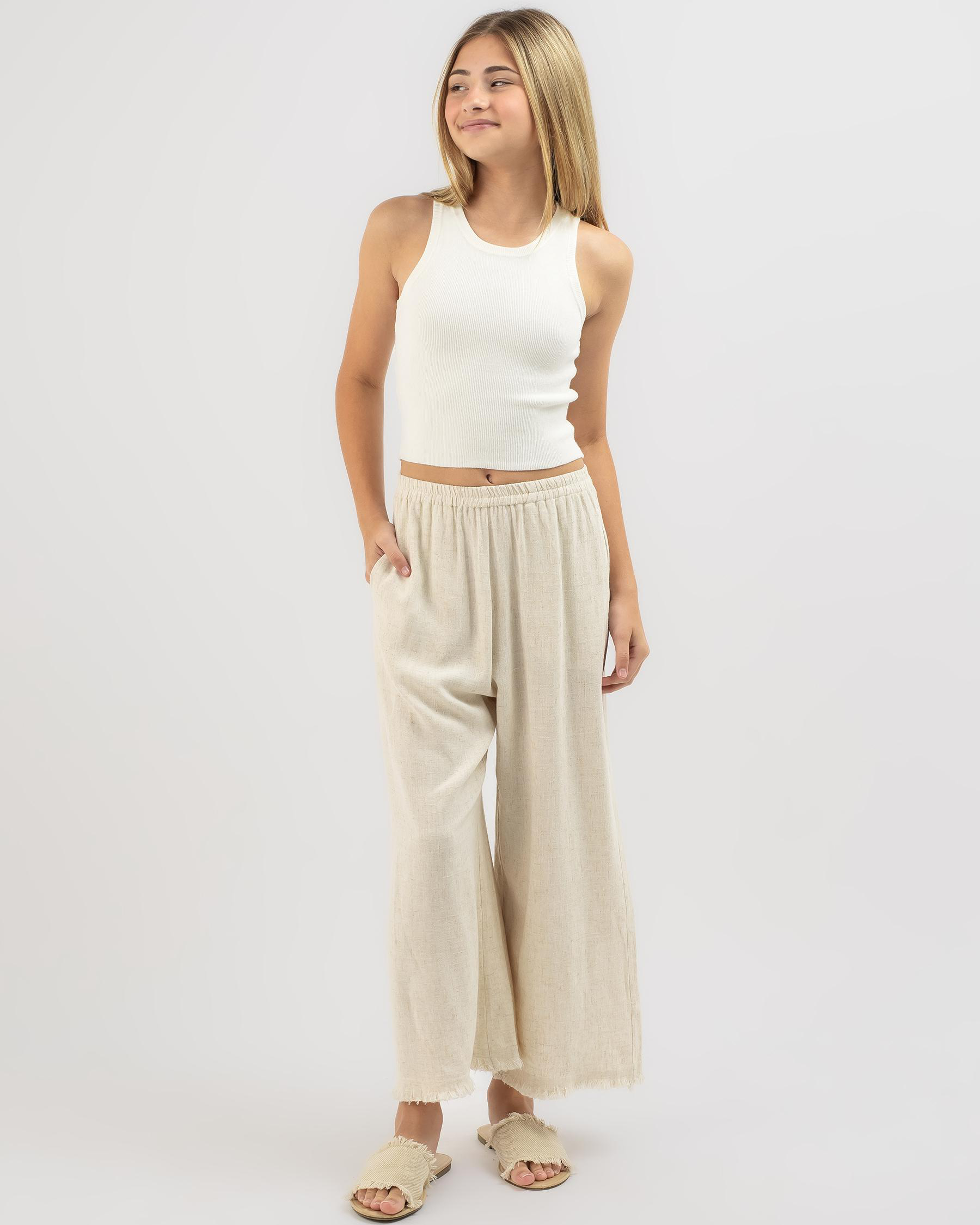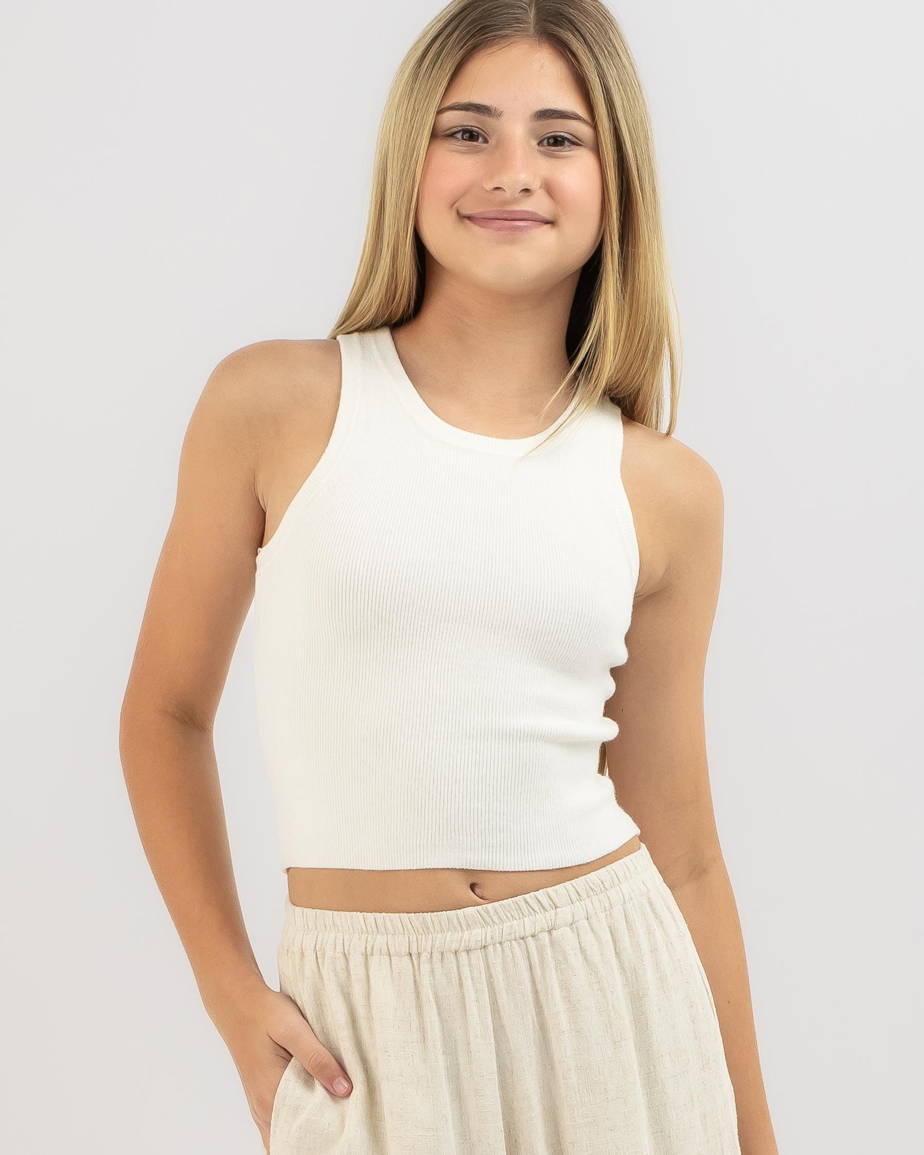 Shop the Mooloola Girls' Basic Racer Back Knit Top in cream. This versatile top is perfect for everyday wear and can be easily styled for any occasion.