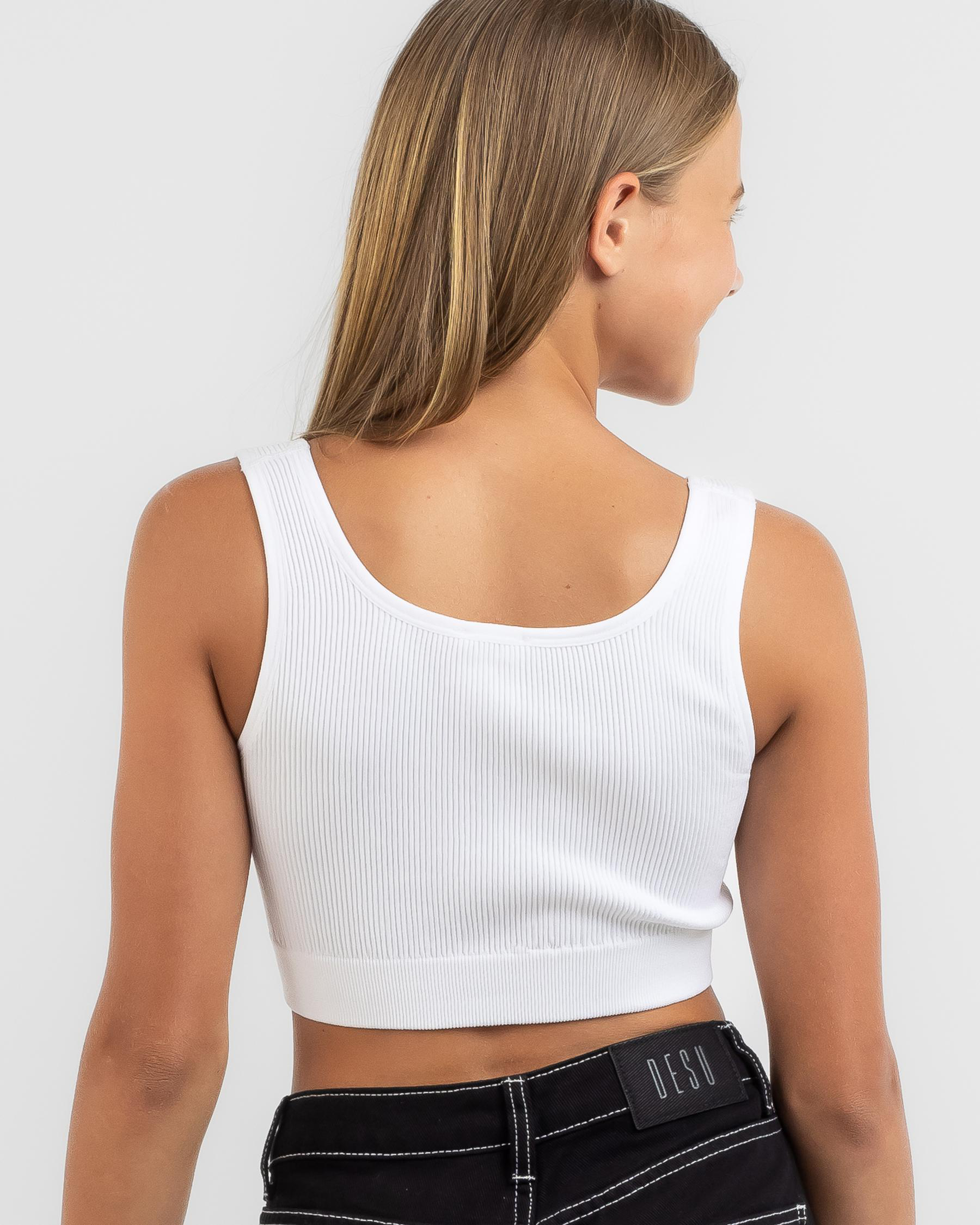 The Mooloola Girls' Basic Seamfree Crop Top in White offers a sleek and comfortable fit for everyday wear.