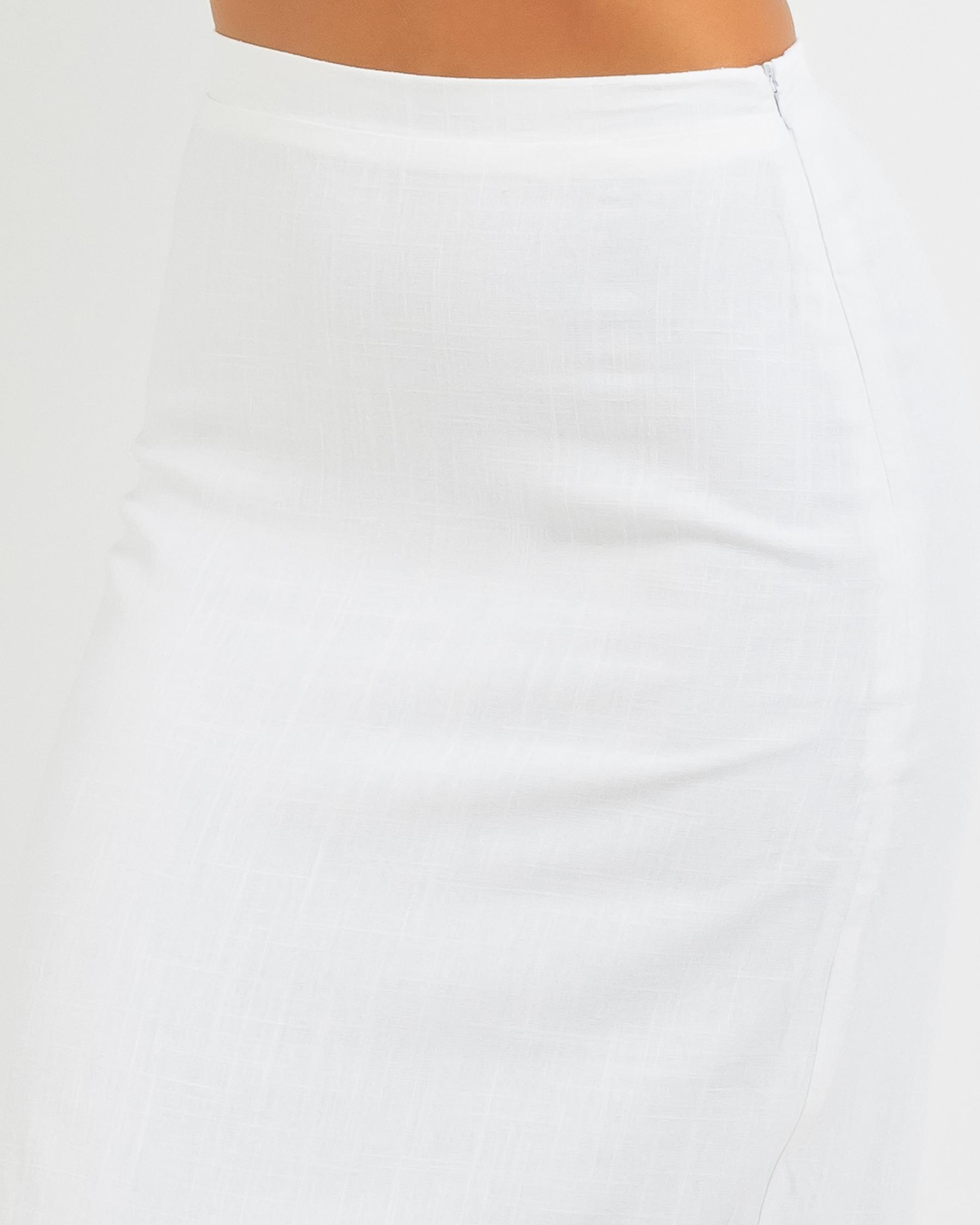 The Mooloola Jessica Maxi Skirt in White is a versatile and stylish addition to any wardrobe, perfect for summer days and beach outings.