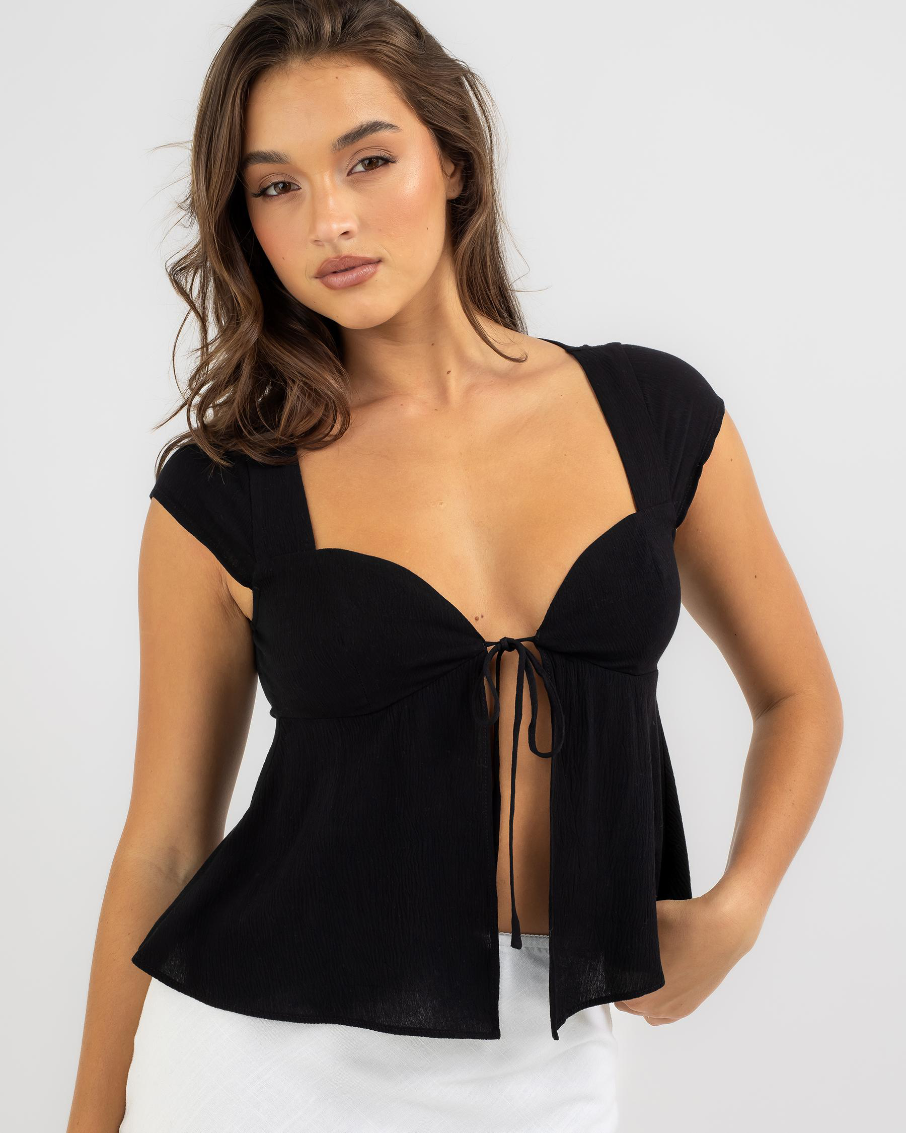 The Mooloola Lilibet Tie Front Top in sleek black is a stylish essential for any wardrobe. The perfect piece for effortless chic style.