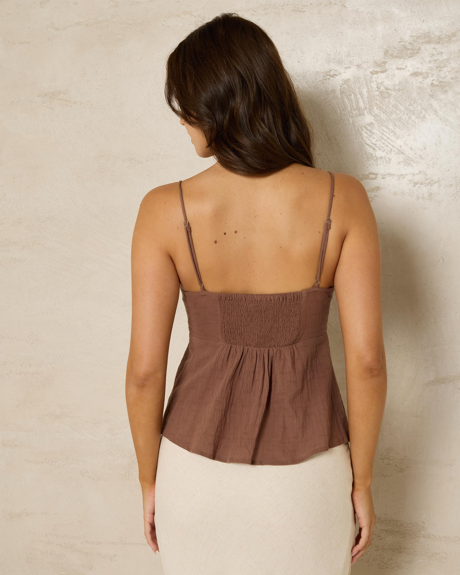 Indulge in the rich hue of choc with the Mooloola Lissi Split Top. A chic and versatile piece for your wardrobe.