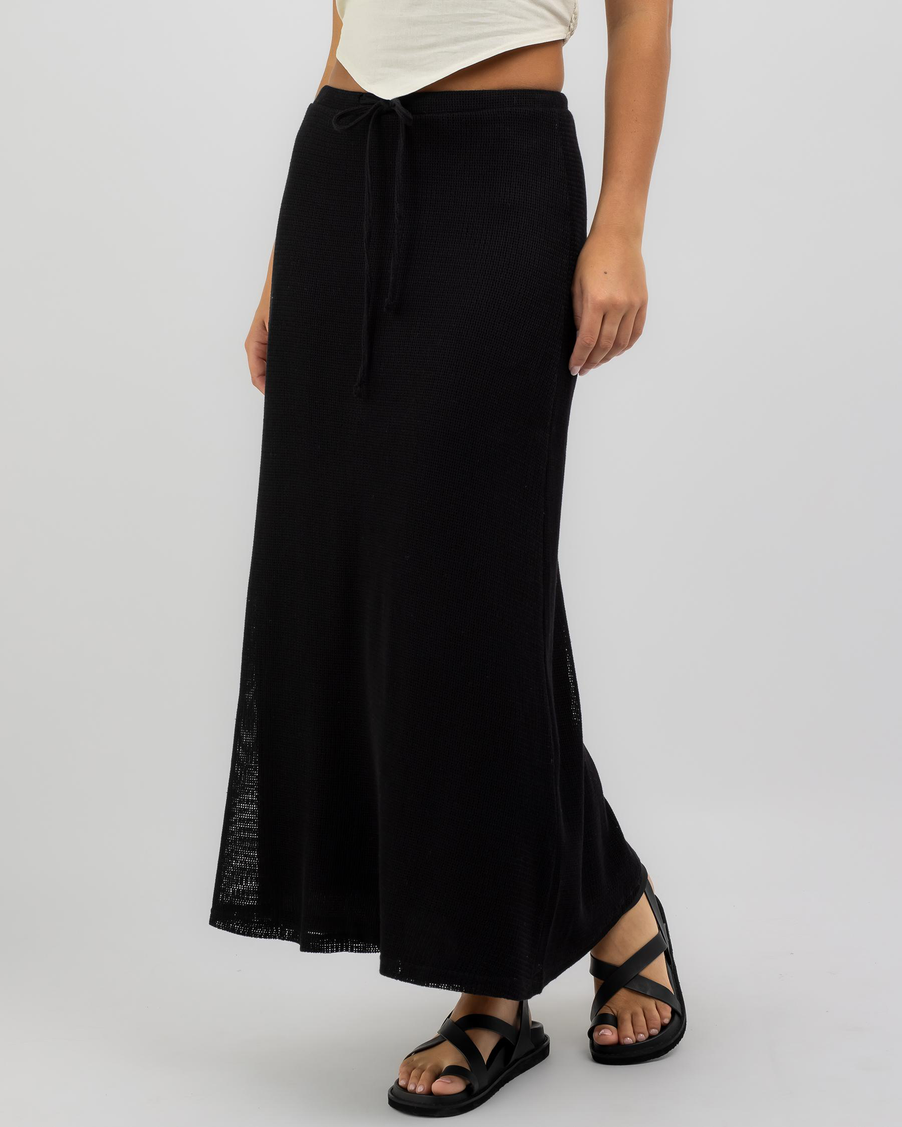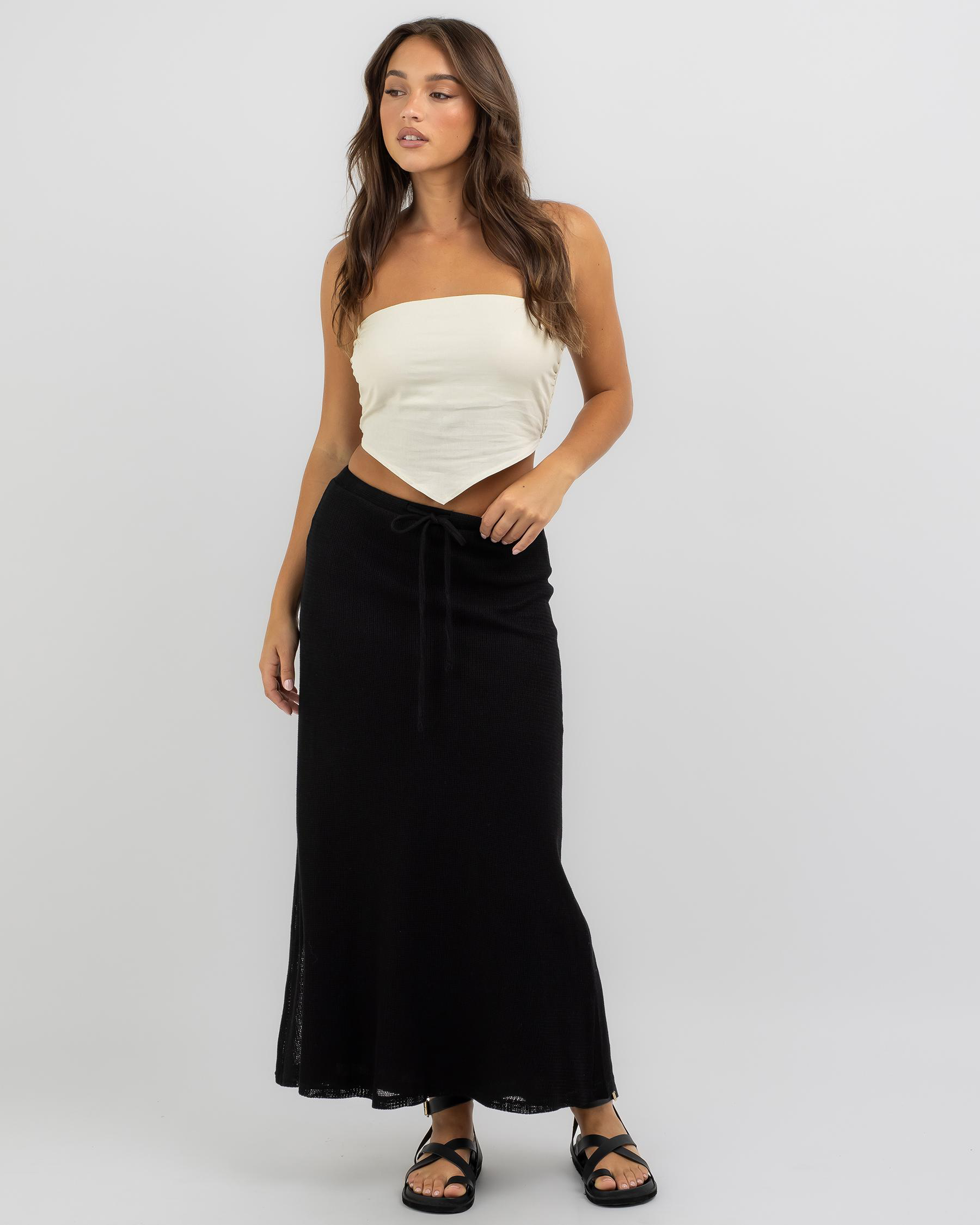 The Mooloola Madelyn Maxi Skirt in White exudes effortless elegance with its flowing design and crisp white color. Perfect for summer outings.