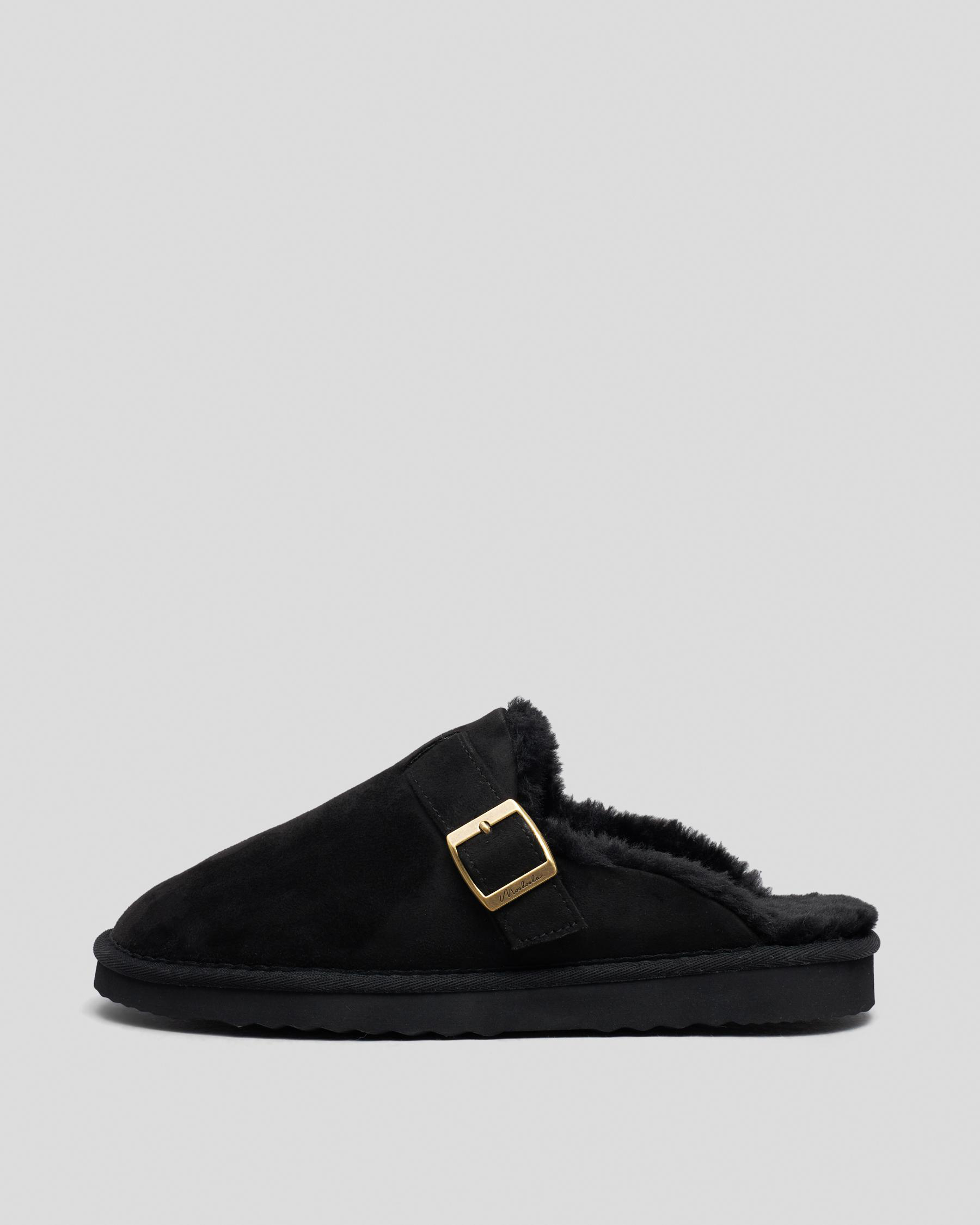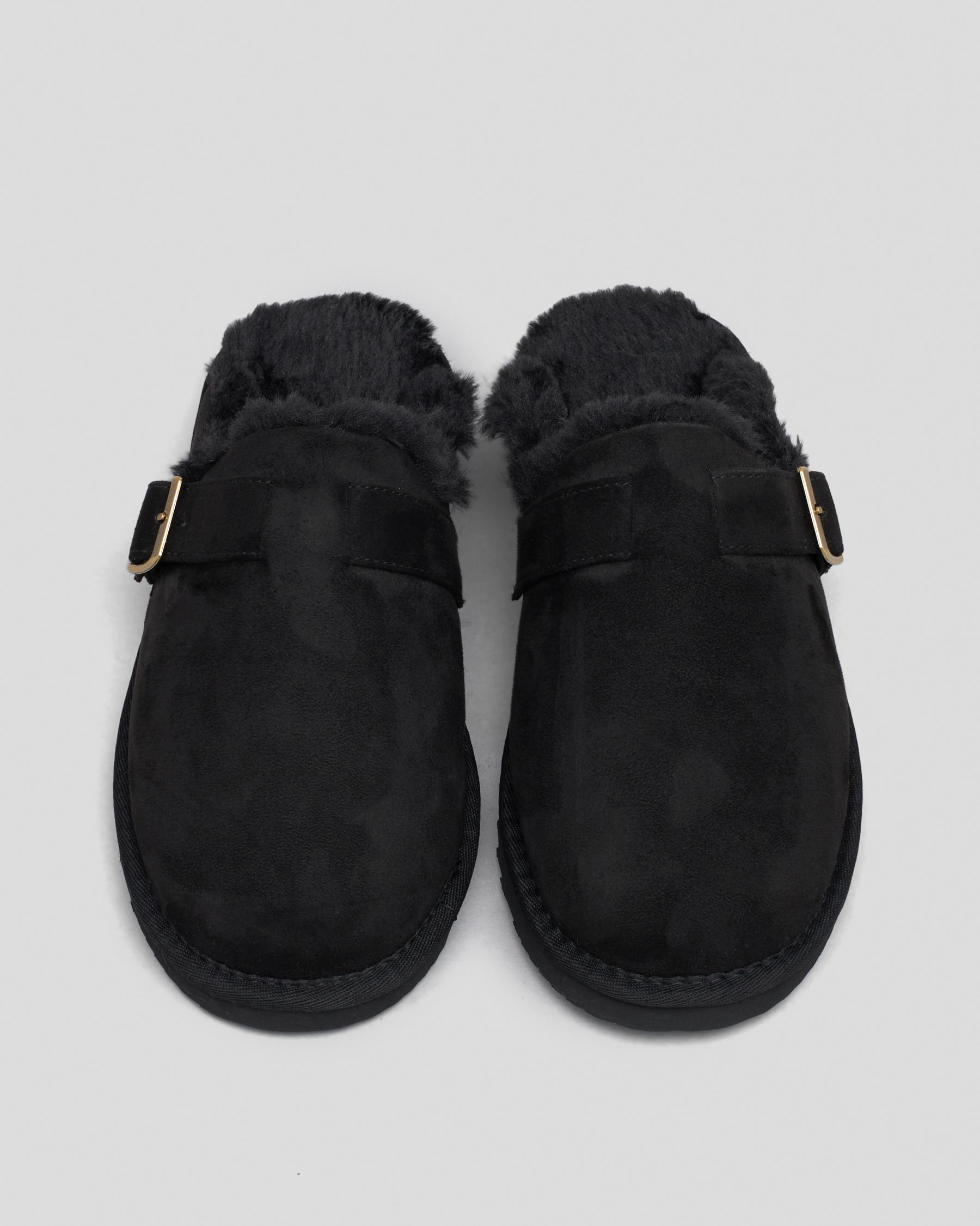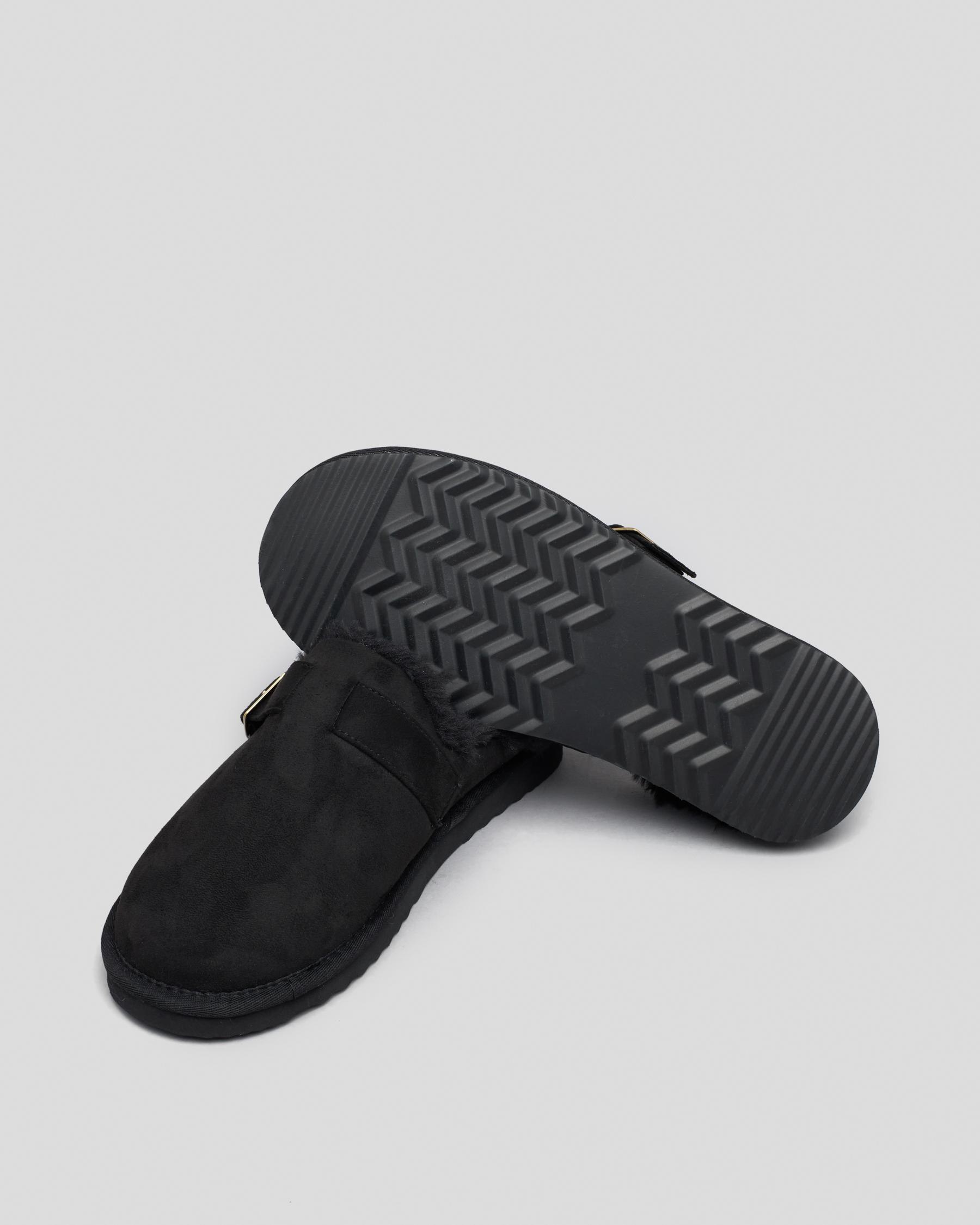 Stay cozy in the Mooloola Peter Slipper in classic black. These slippers feature a stylish cream trim, perfect for lounging in style.
