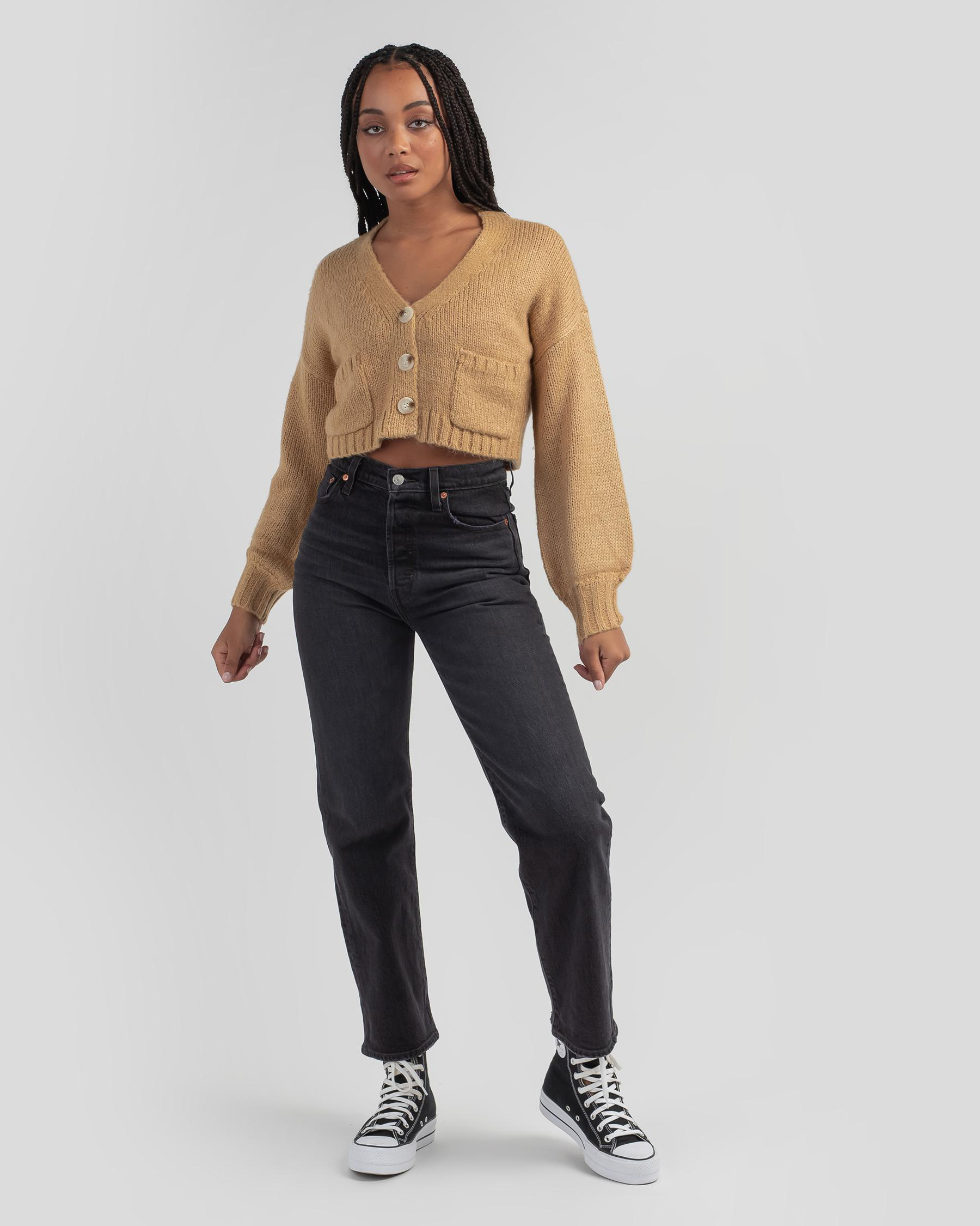 Wrap yourself in the cozy warmth of the Mooloola She's On It Knit Cardigan in Sand. This versatile cardigan in a neutral sand hue will be your go-to layering piece all season long.