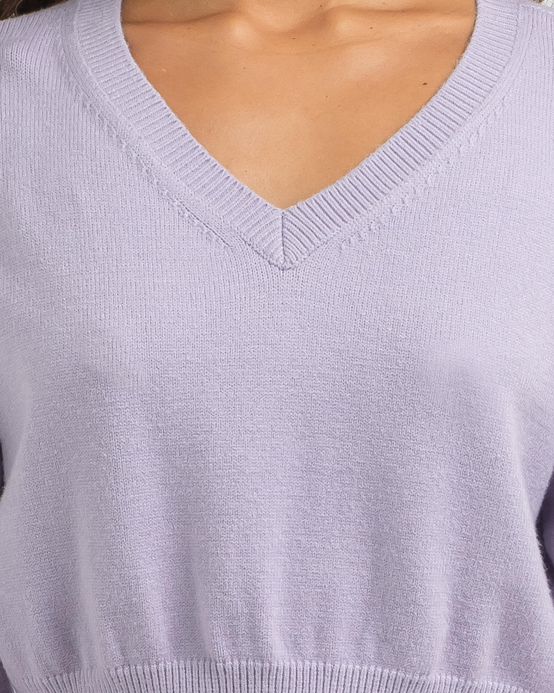 Stay cozy and stylish in the Mooloola Sundown Knit Jumper in lilac. Perfect for adding a pop of colour to your winter wardrobe.
