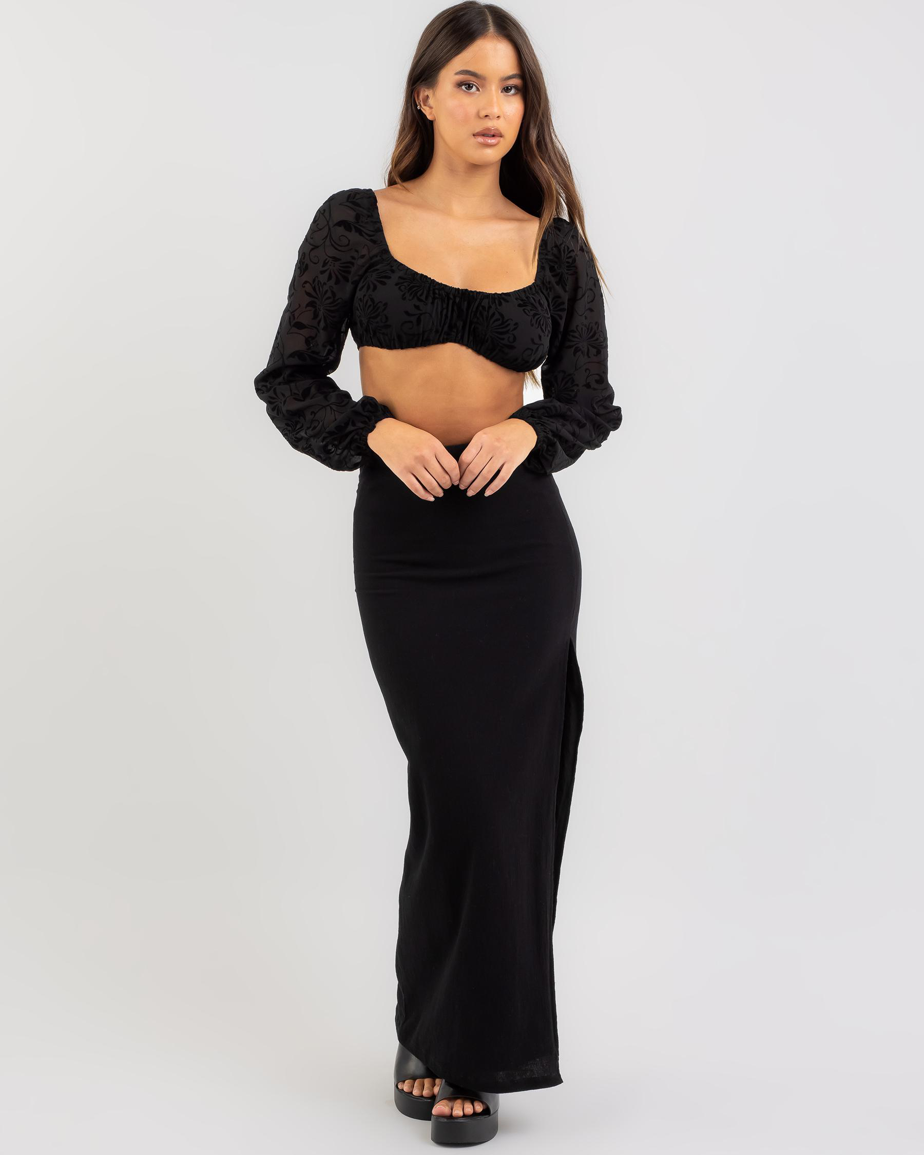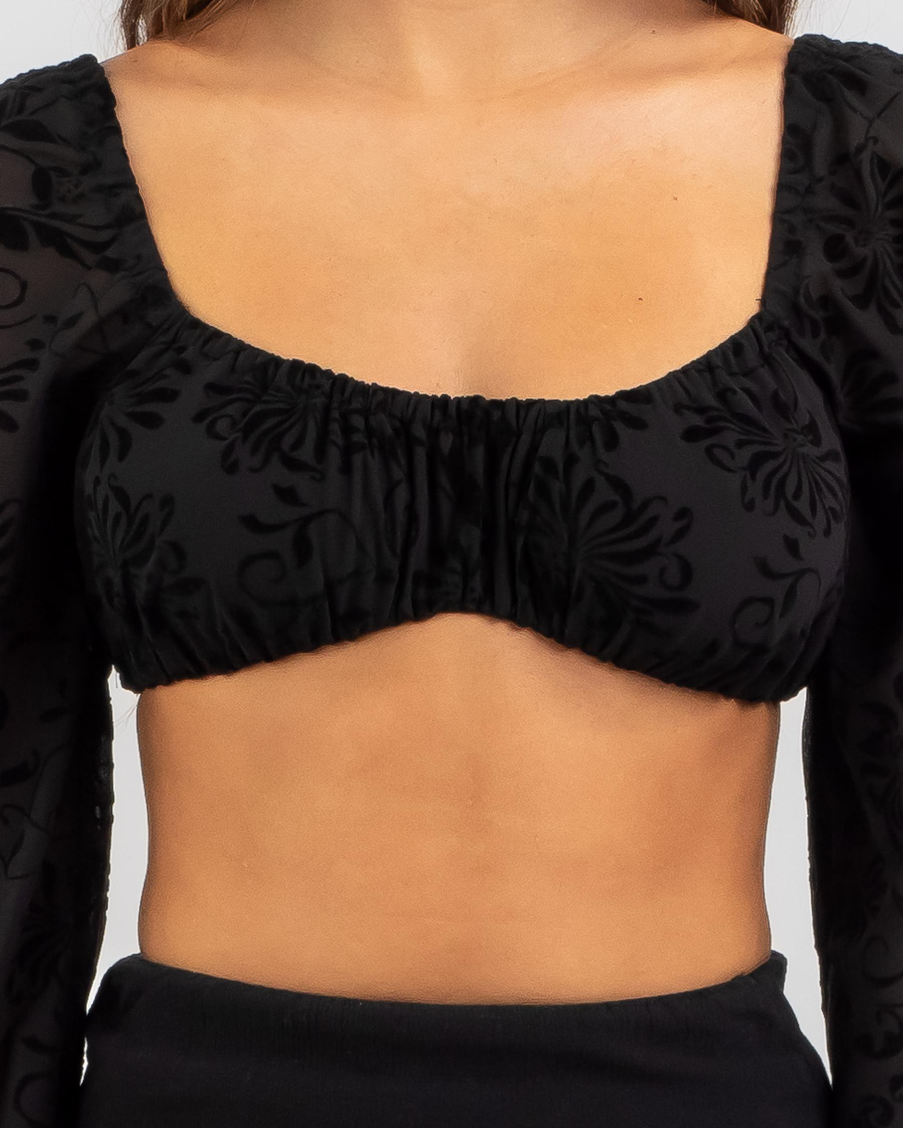 The Mooloola Wednesday Top in Black Flocking is a sleek and sophisticated piece for any wardrobe. Perfect for a night out or special occasion.