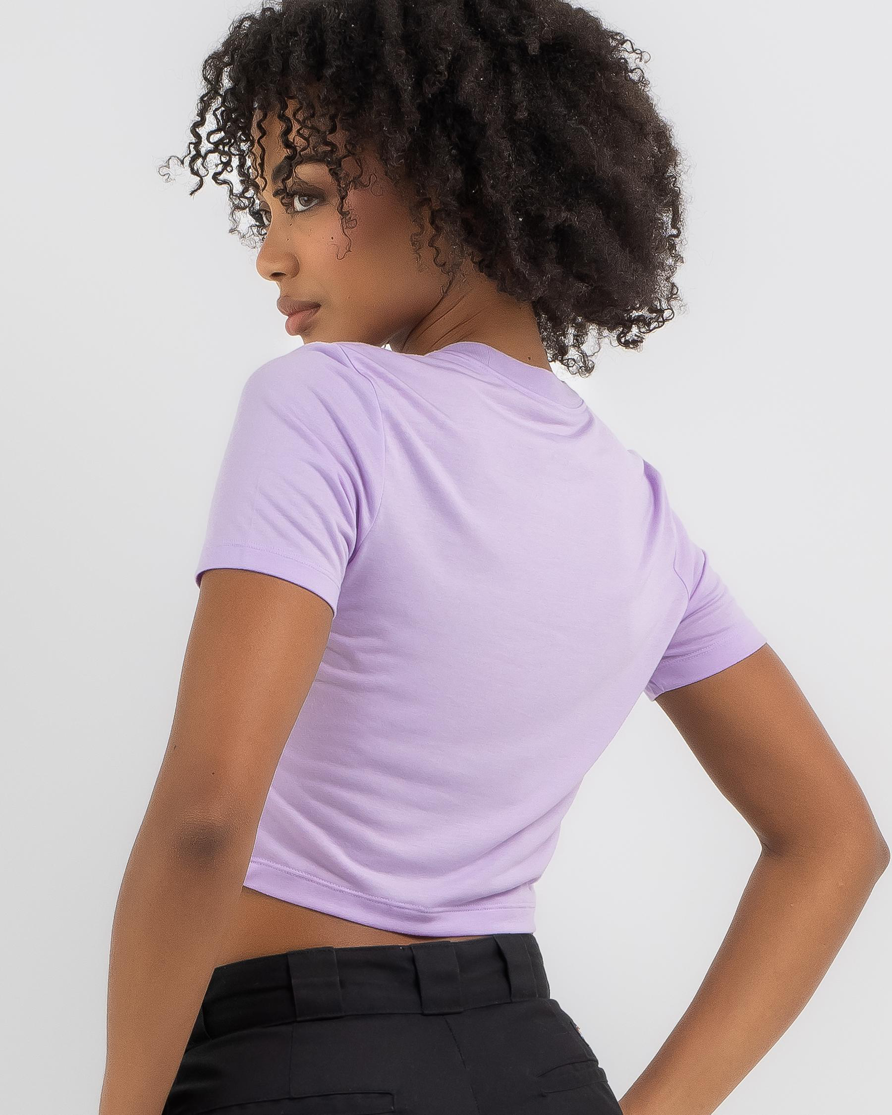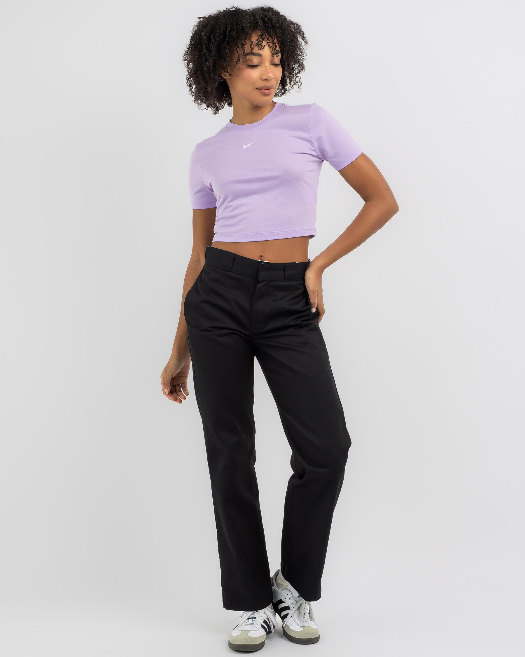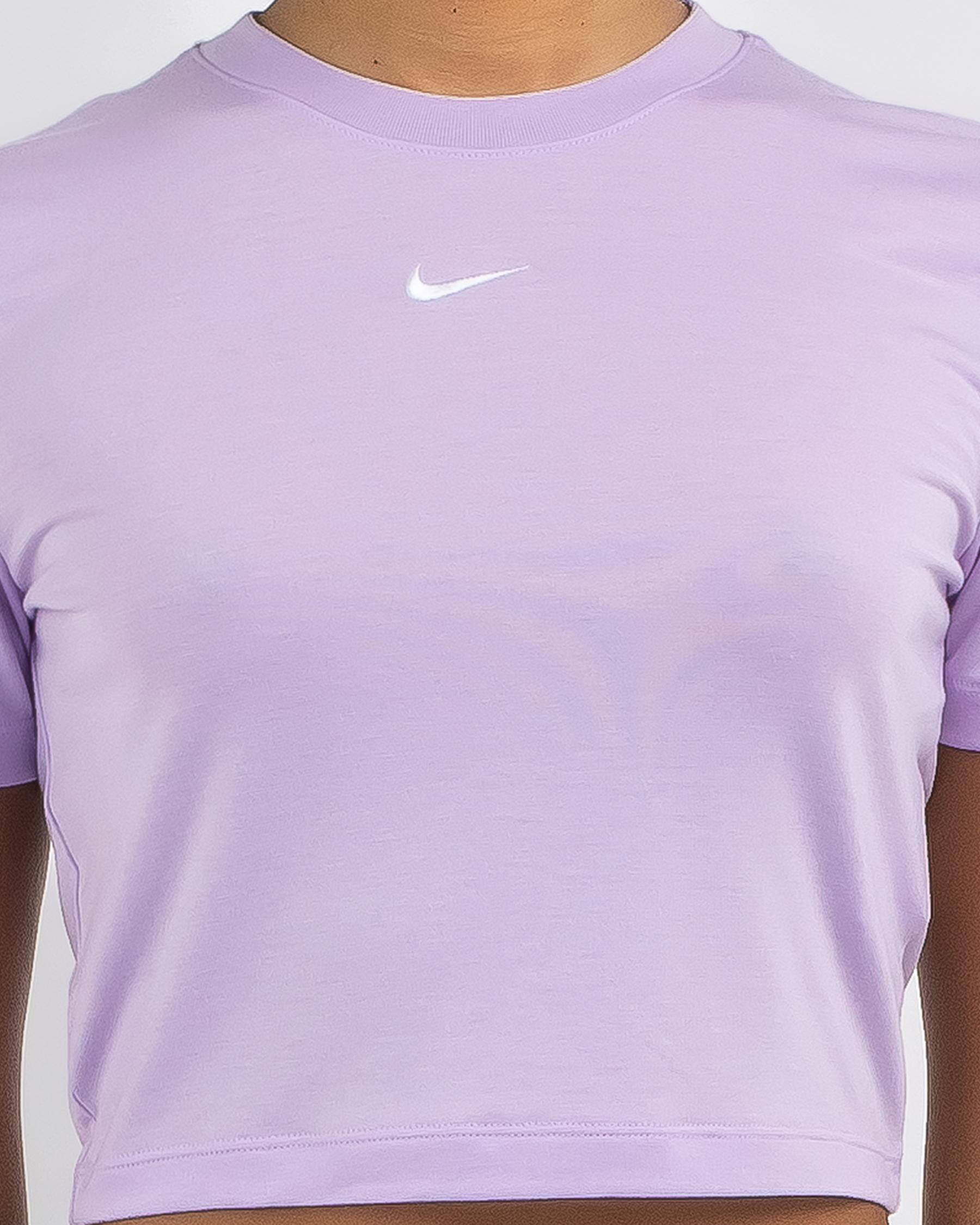 The Nike Essential Slim Cropped T-Shirt in Violet Mist is a stylish wardrobe essential. Its vibrant color adds a pop of femininity to any outfit.