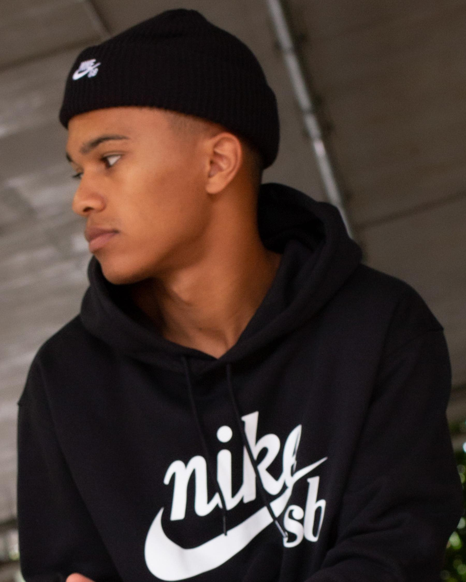 It doesn’t get better than the Nike SB Fisherman Beanie. This black beanie boasts a turn up brim featuring a white embroidered logo. Wear this Nike SB beanie all winter.
