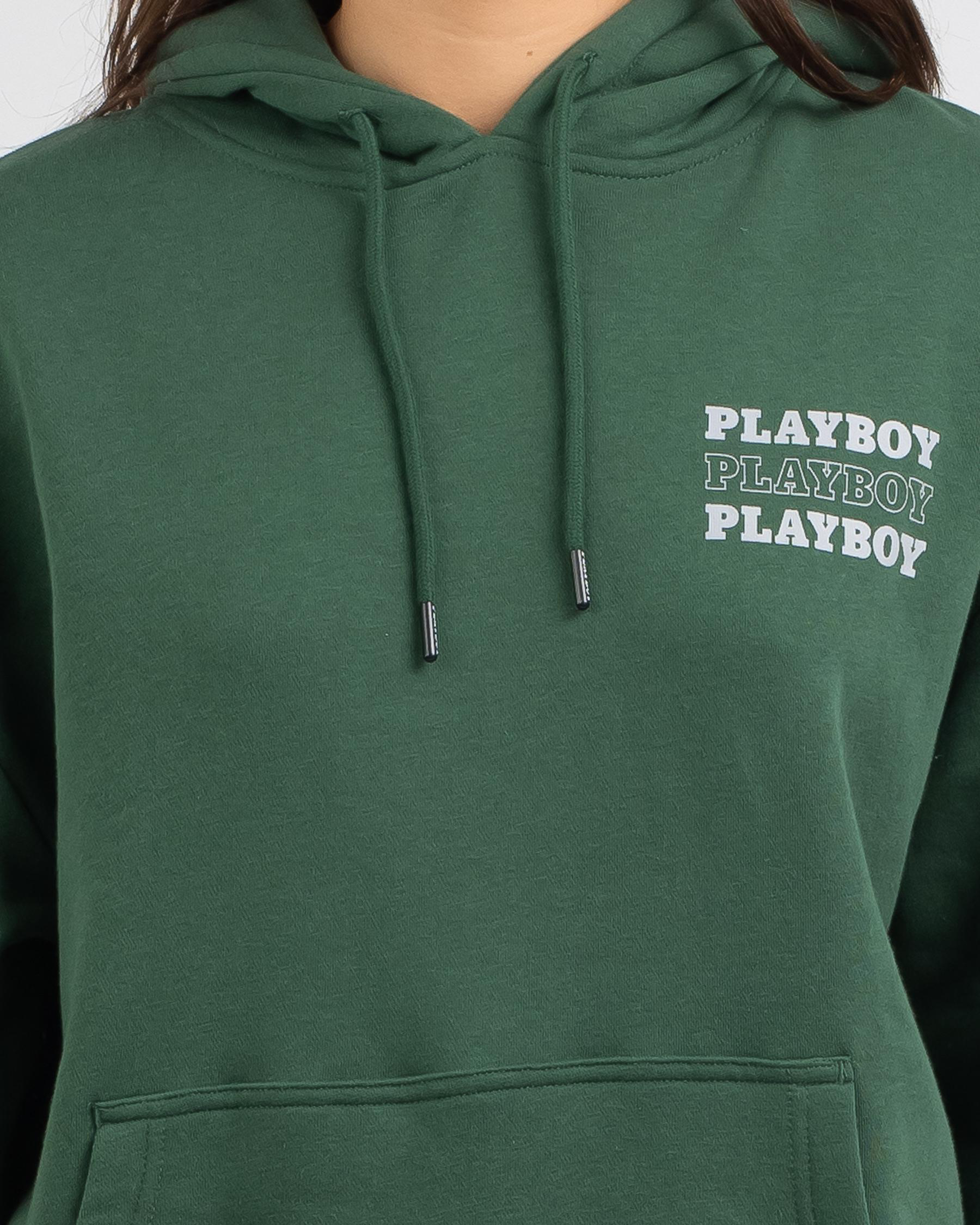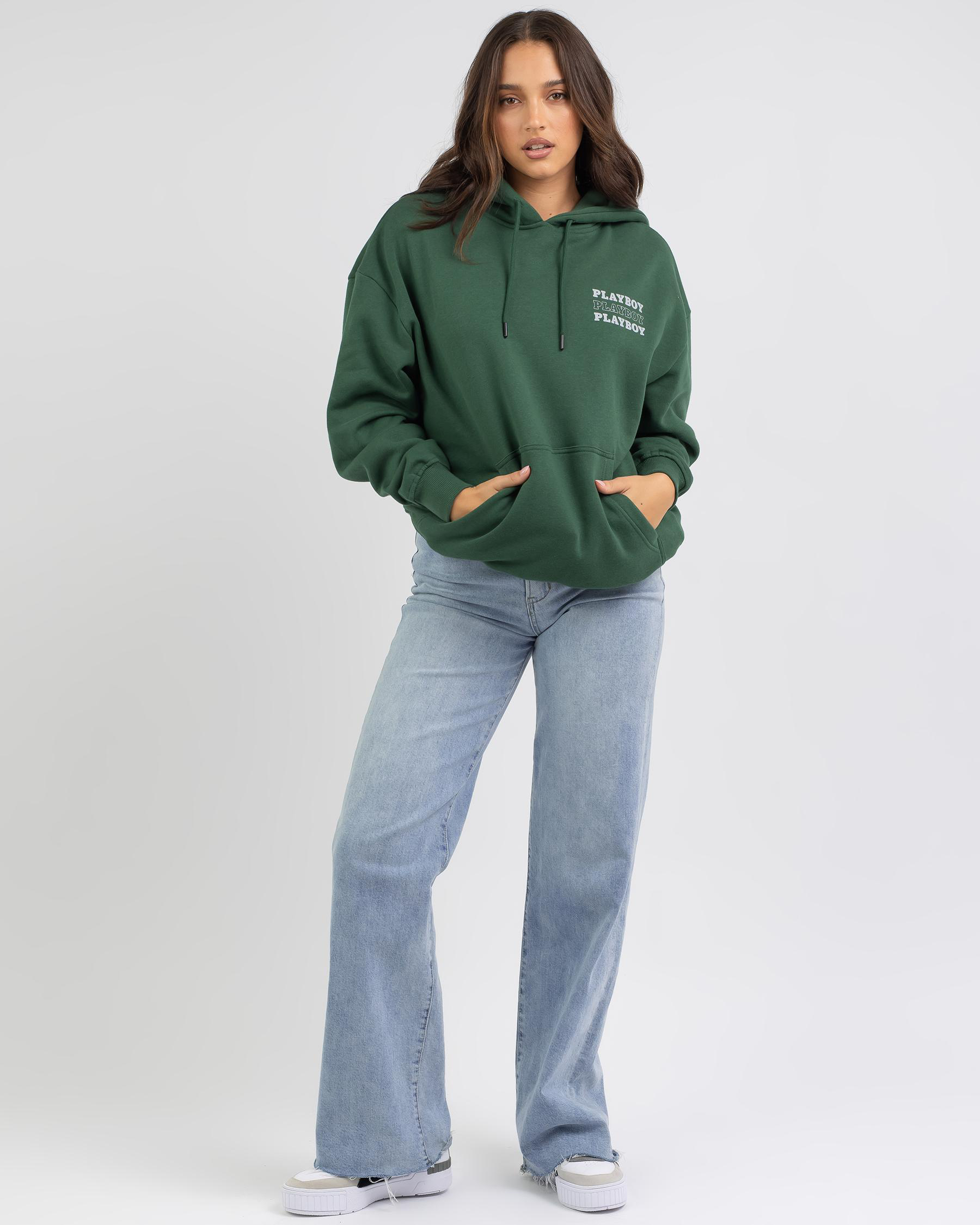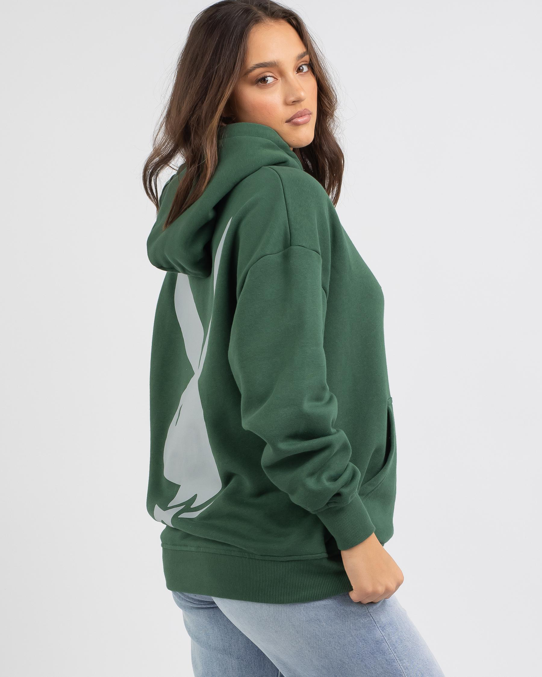 The Playboy Bunny Stack Hoodie in emerald green is a stylish and bold choice for staying cozy and on-trend.