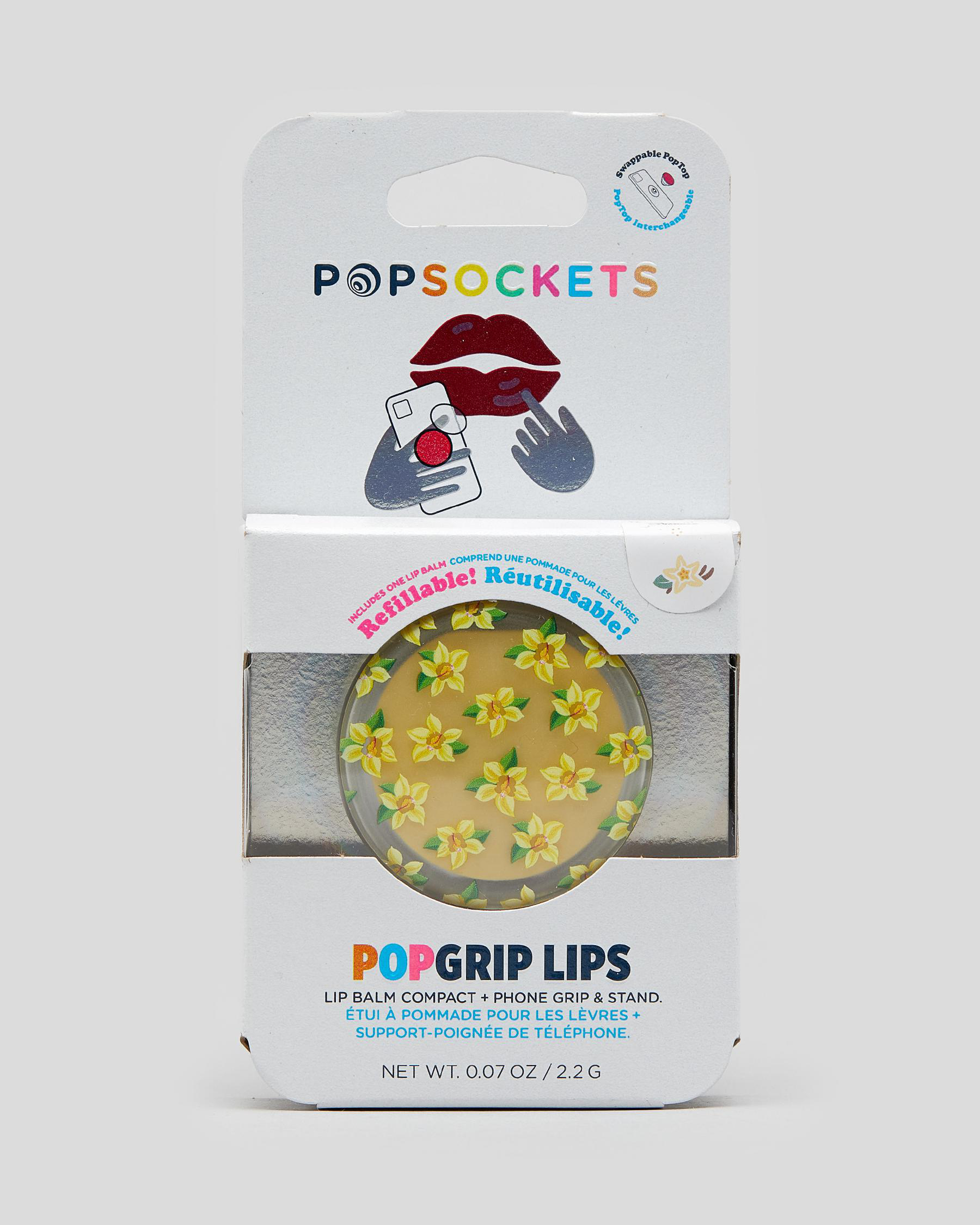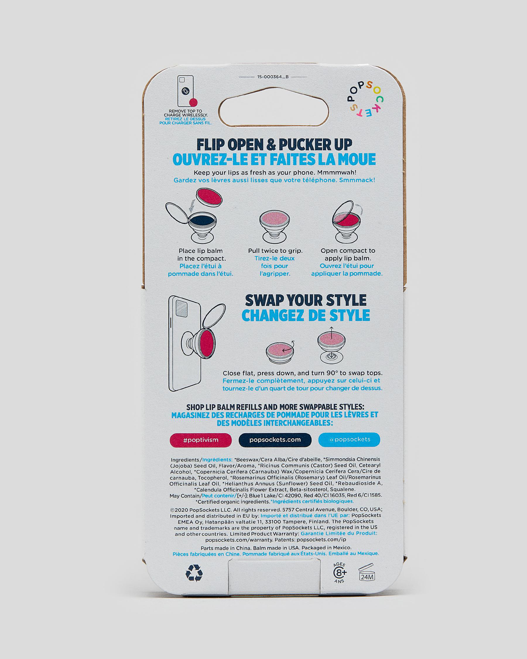 A PopGrip with built-in vanilla lip balm compact keeps your lip balm within reach at all times. This PopGrip also has a swappable top. You can swap in a new PopTop or do a little wireless charging.