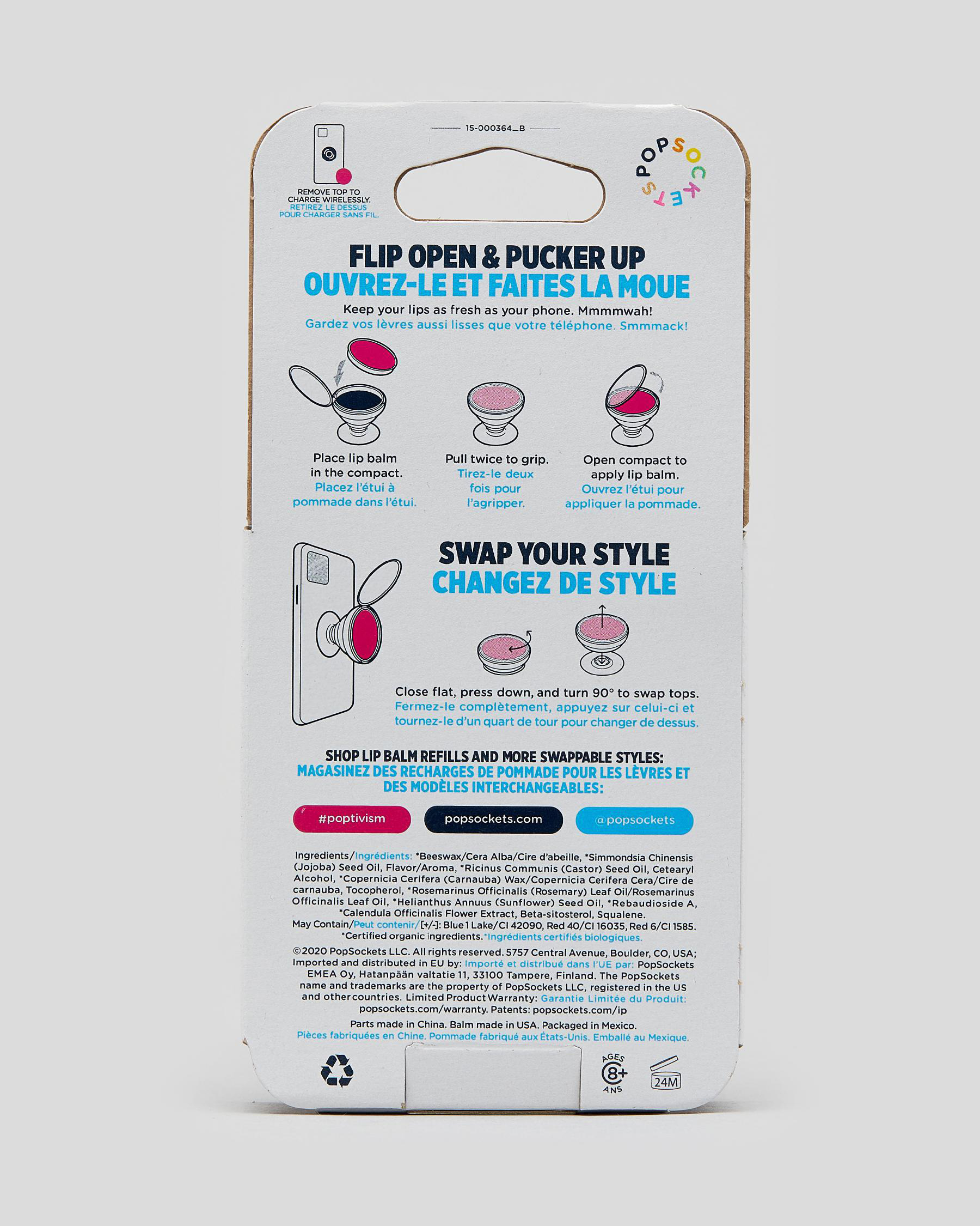 A PopGrip with built-in vanilla lip balm compact keeps your lip balm within reach at all times. This PopGrip also has a swappable top. You can swap in a new PopTop or do a little wireless charging.