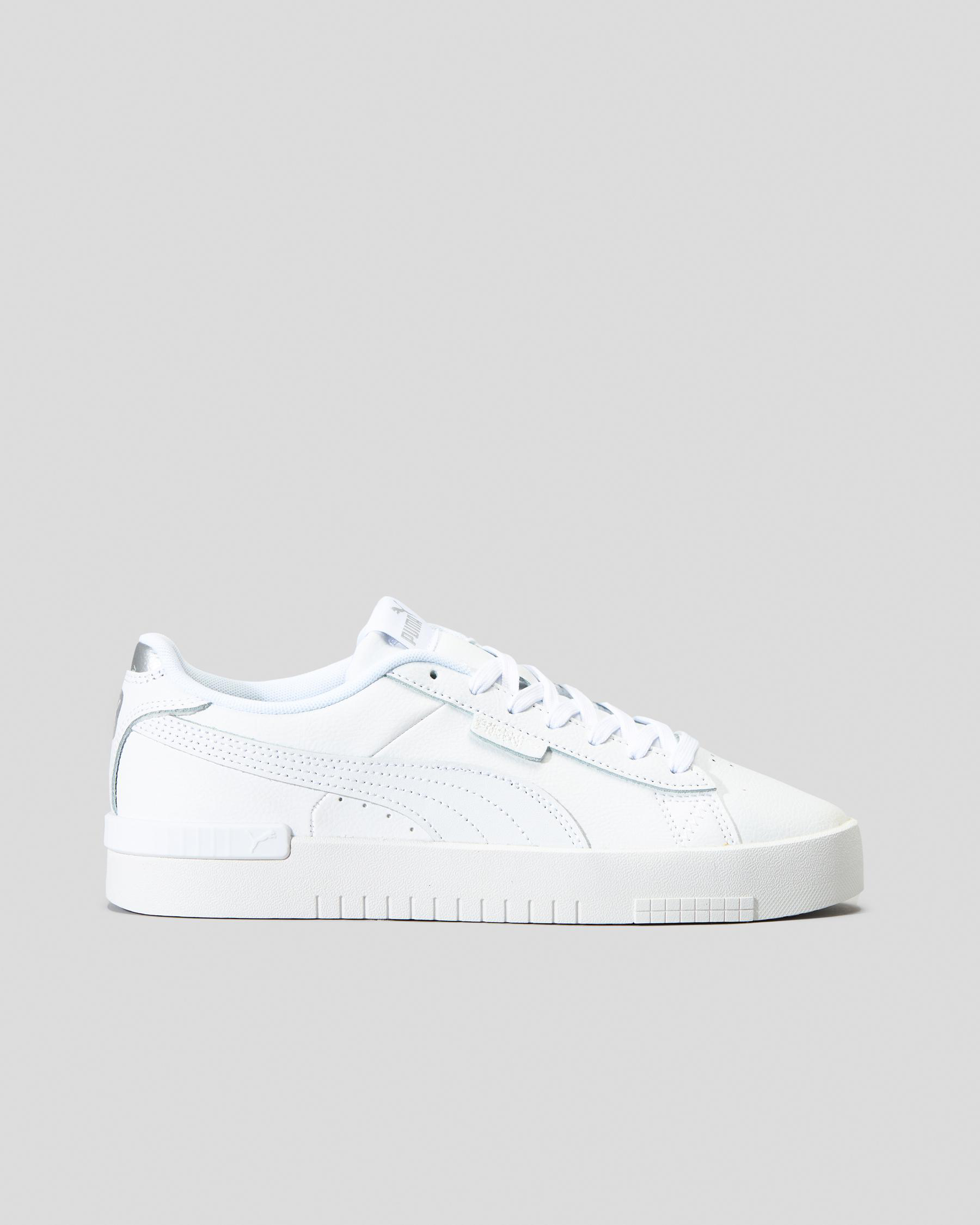 Shop the Puma Jada Renew Shoes in classic white with silver accents. The perfect blend of style and comfort for everyday wear.