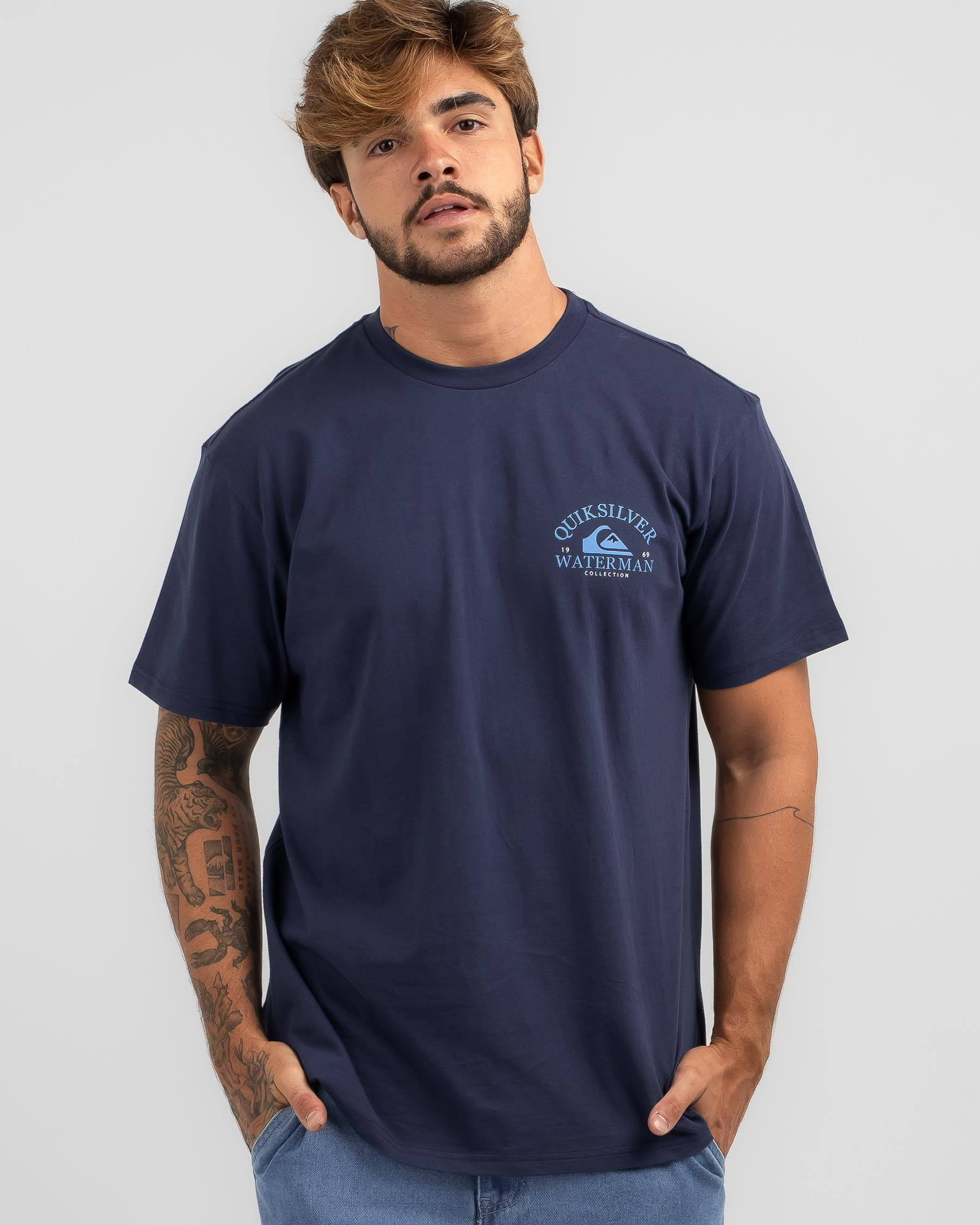 The Quiksilver Blue Dreams T-Shirt showcases a dreamy mood indigo hue, perfect for laid-back summer style.