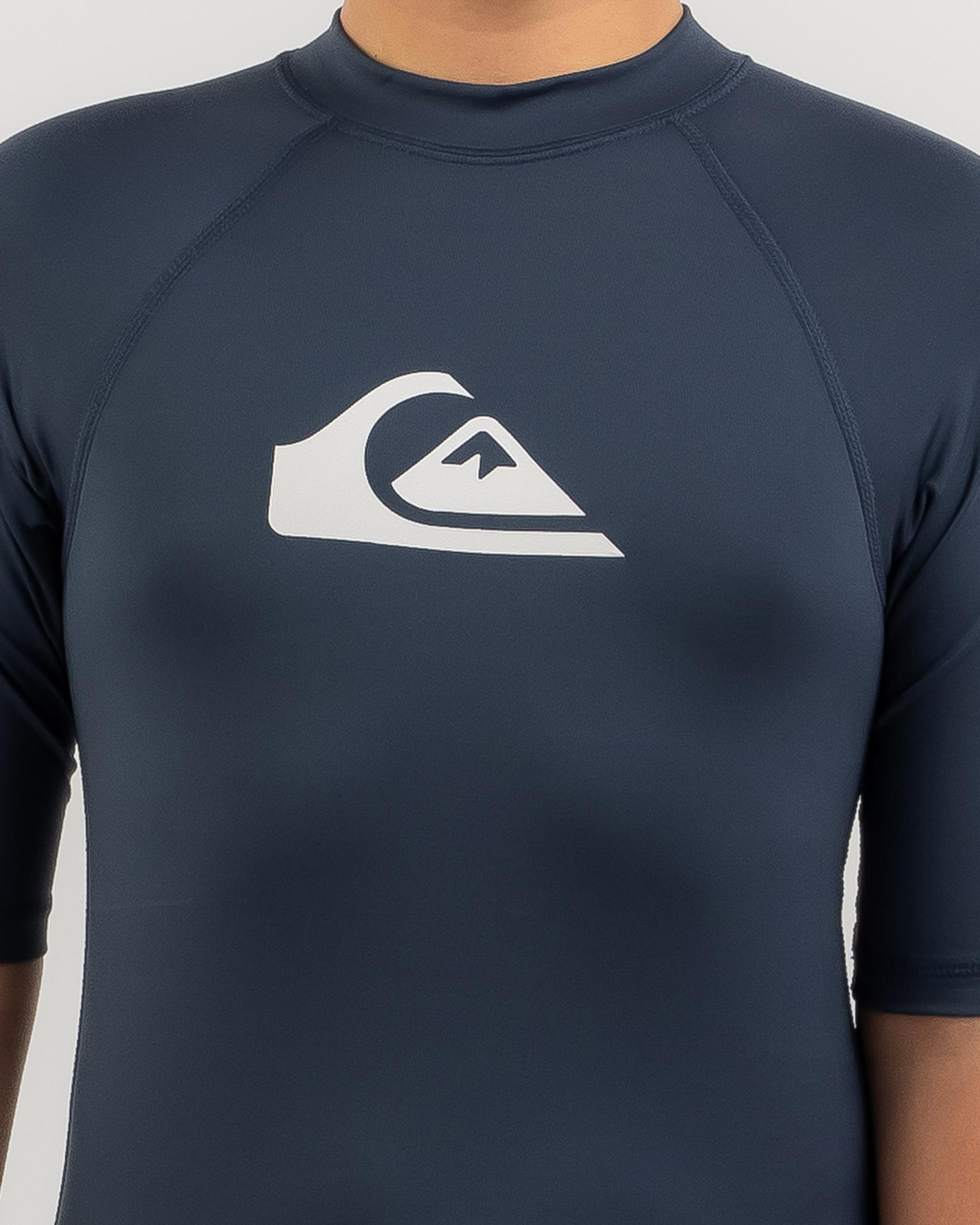 The Quiksilver Boys' All Time Short Sleeve Rash Vest in Insignia Blue is a must-have for active boys. Keep them protected from the sun in style.