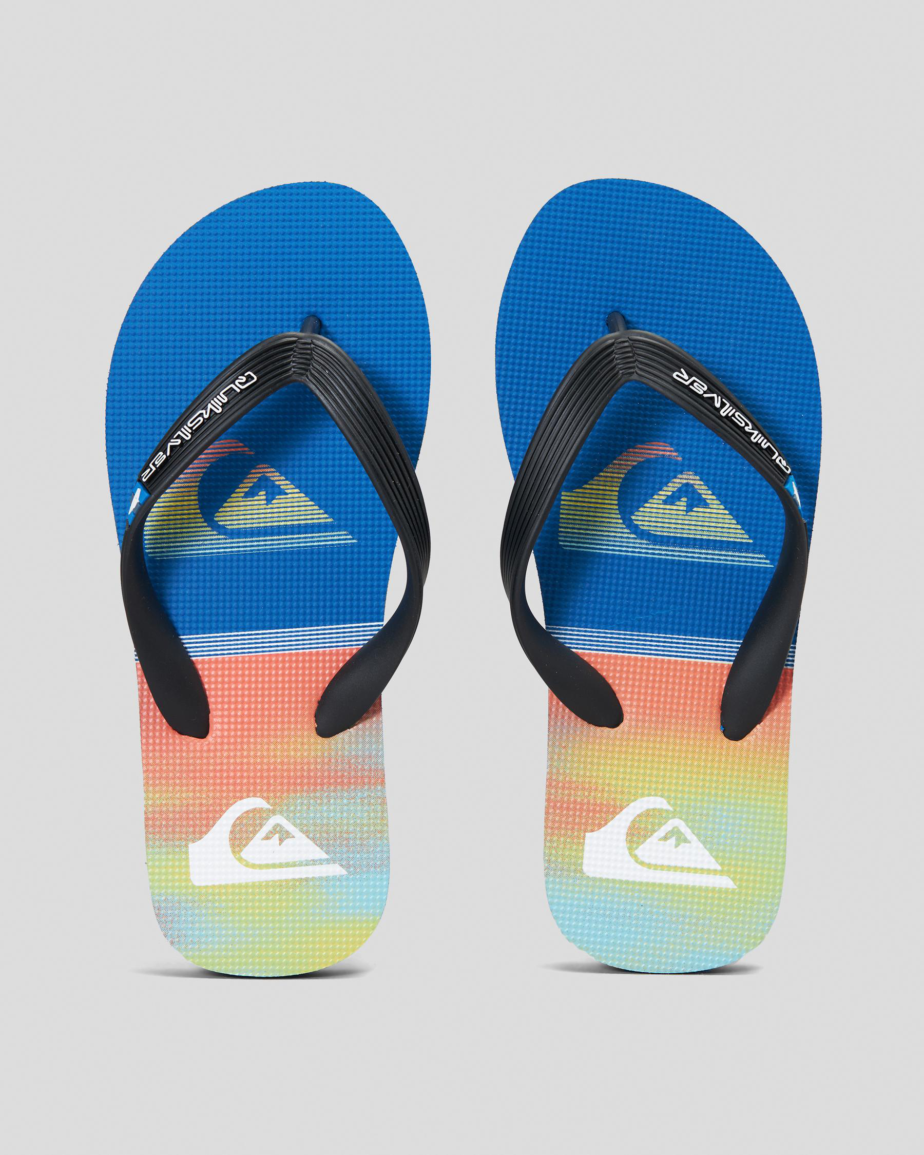 The Quiksilver Boys' Molokai Art Youth Thongs in black are perfect for summer adventures, featuring a comfortable design and stylish look.