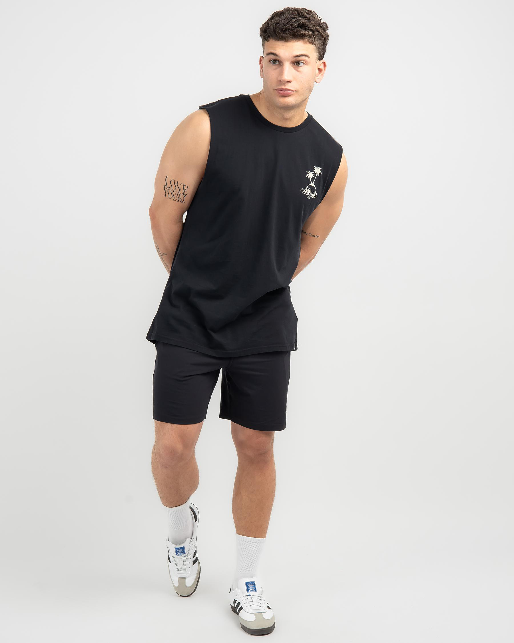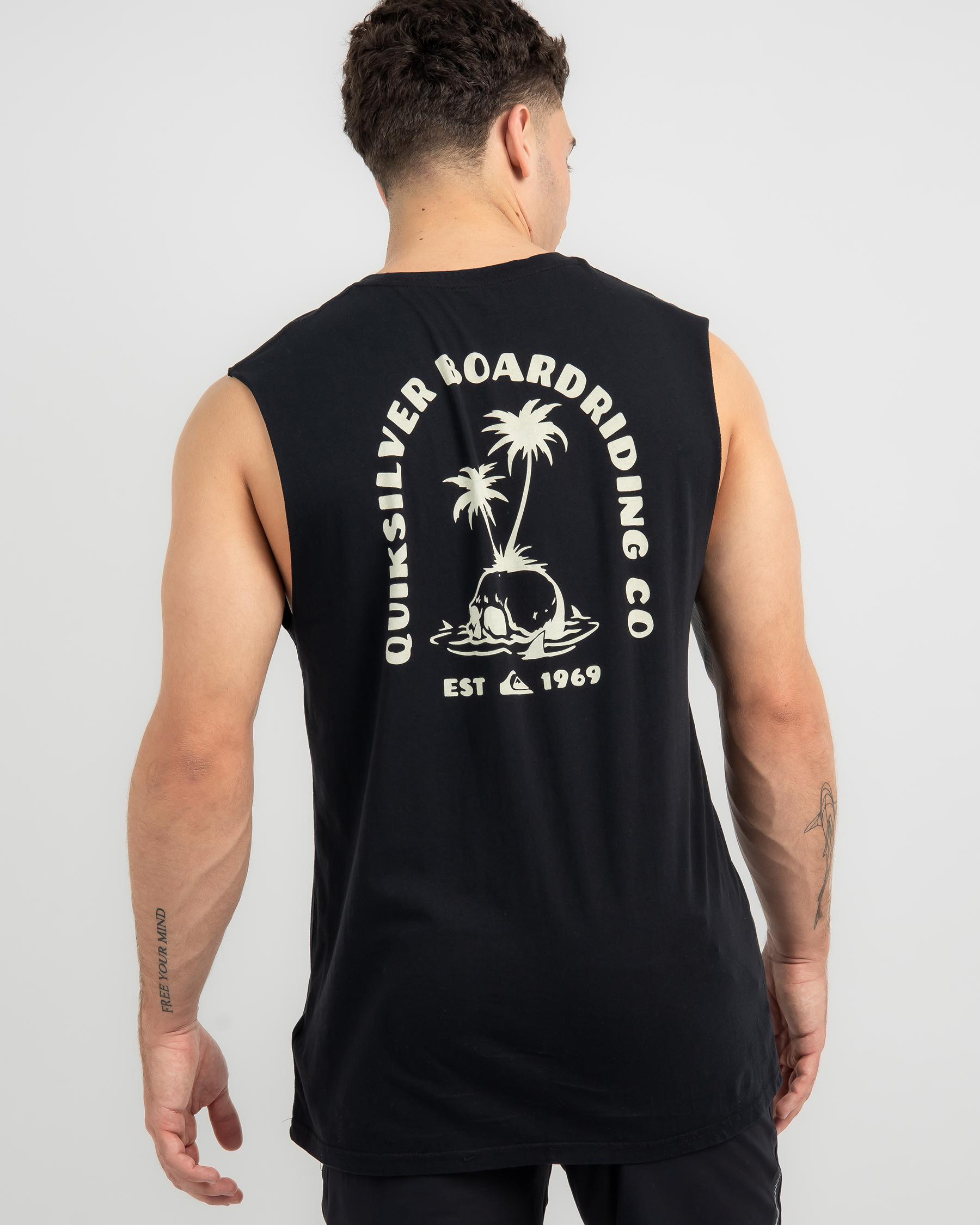 Show off your edgy side with the Quiksilver Skull Palm Muscle in sleek black. This muscle tee features a bold skull and palm tree design for a cool, urban vibe.
